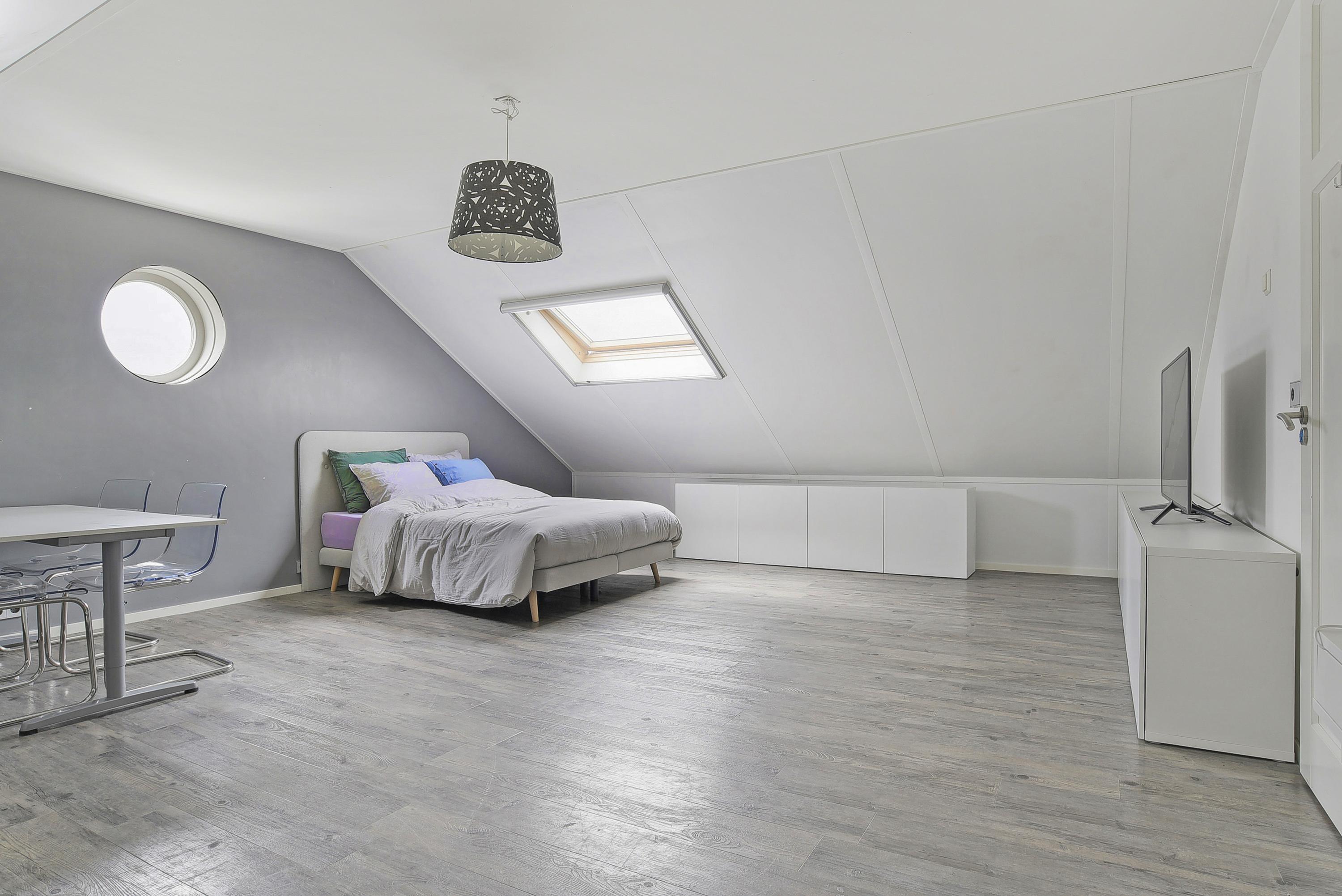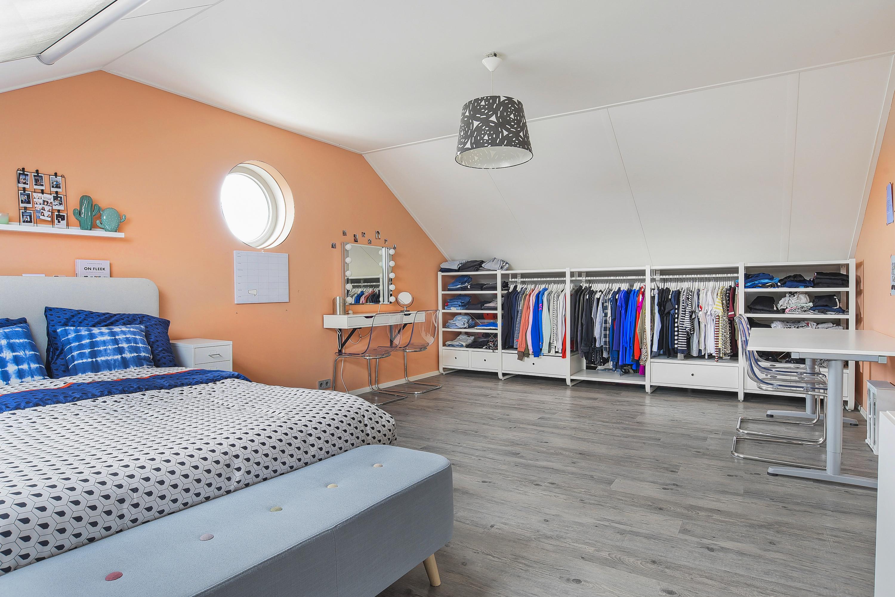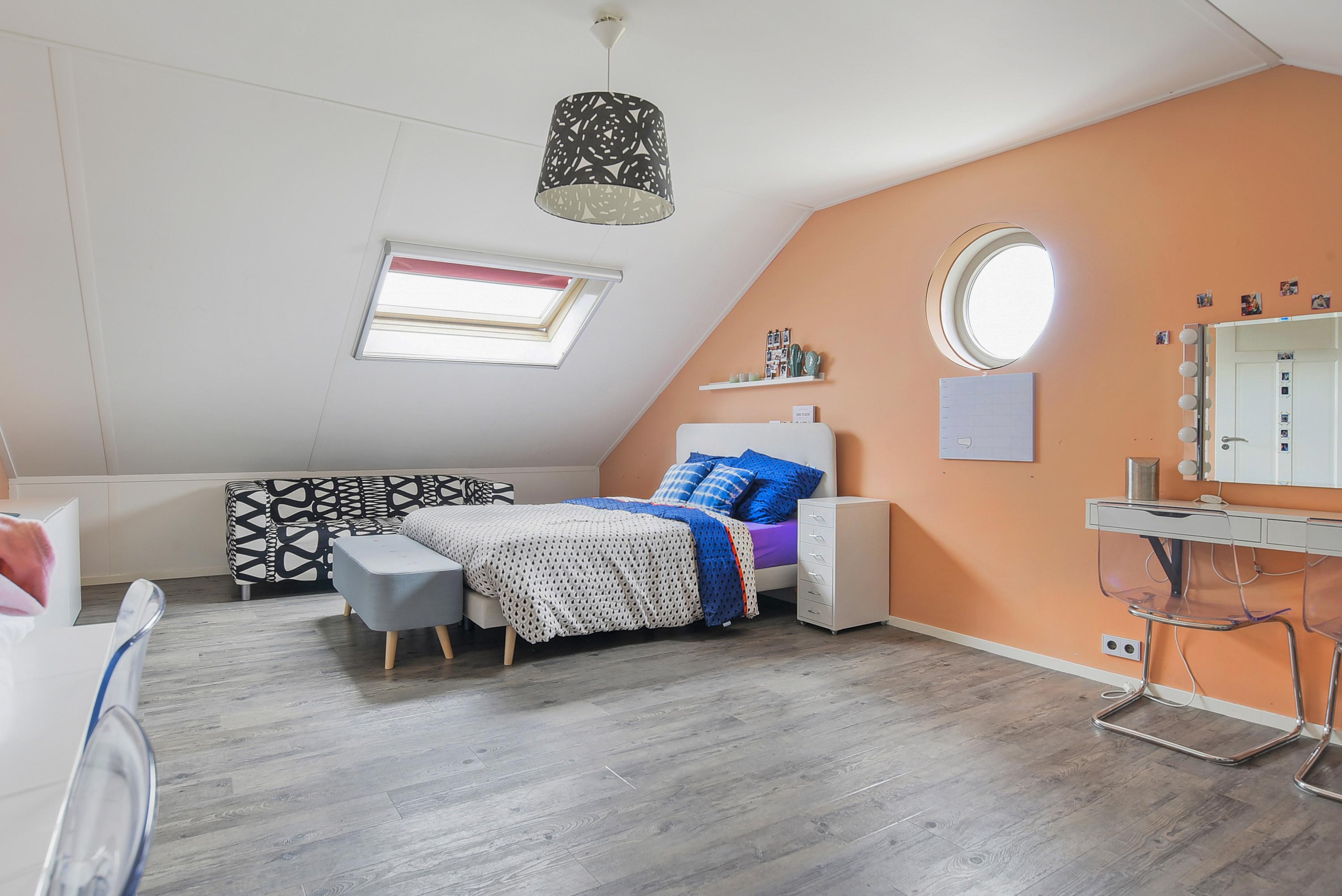 De tweede verdieping is verrassend ruim en herbergt twee grote slaapkamers met extra bergruimte achter de knieschotten en speelse ronde ramen. Deze verdieping is uitermate geschikt voor logees, oudere kinderen of werken aan huis, er is zelfs genoeg ruimte voor het creëren van een derde slaapkamer.