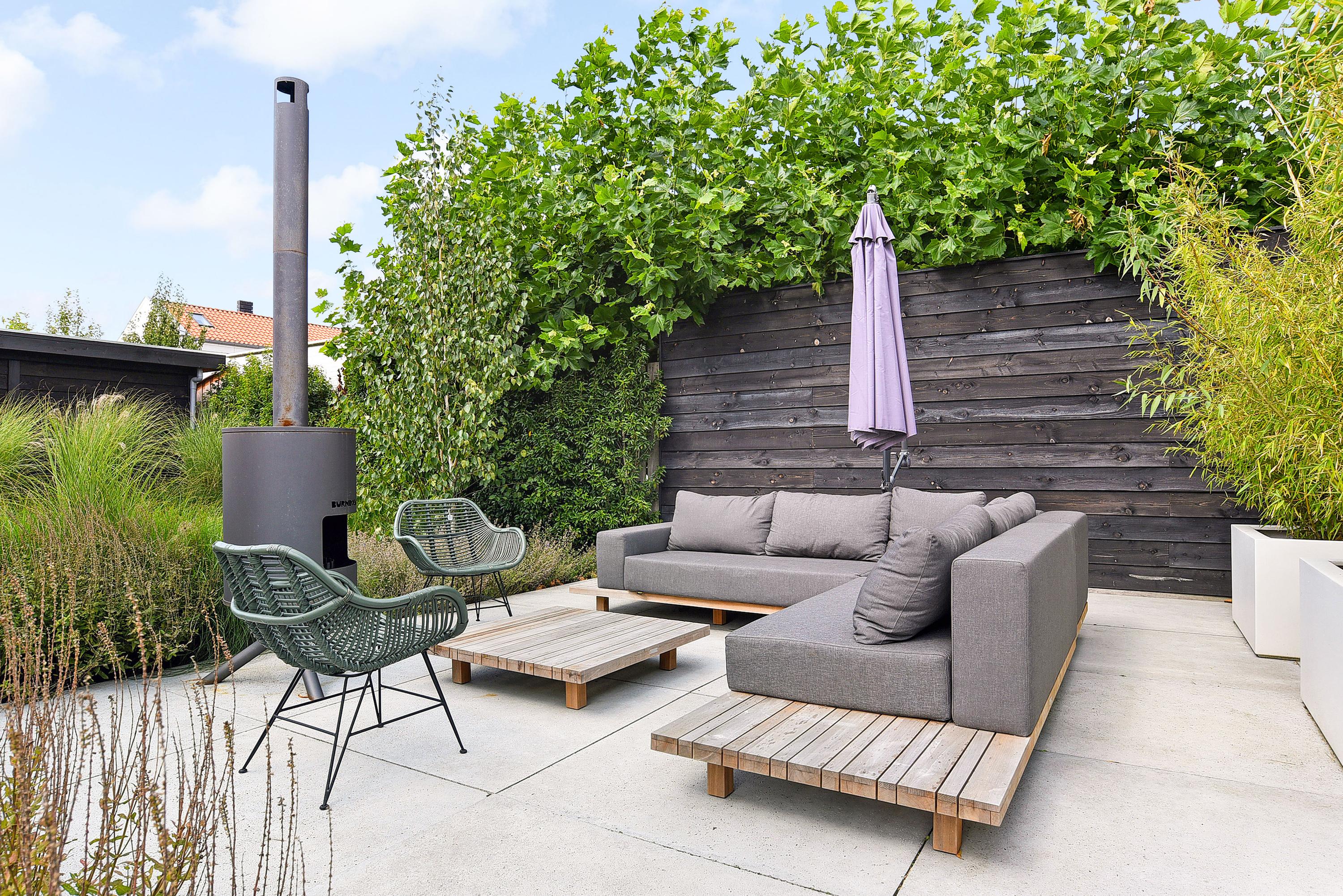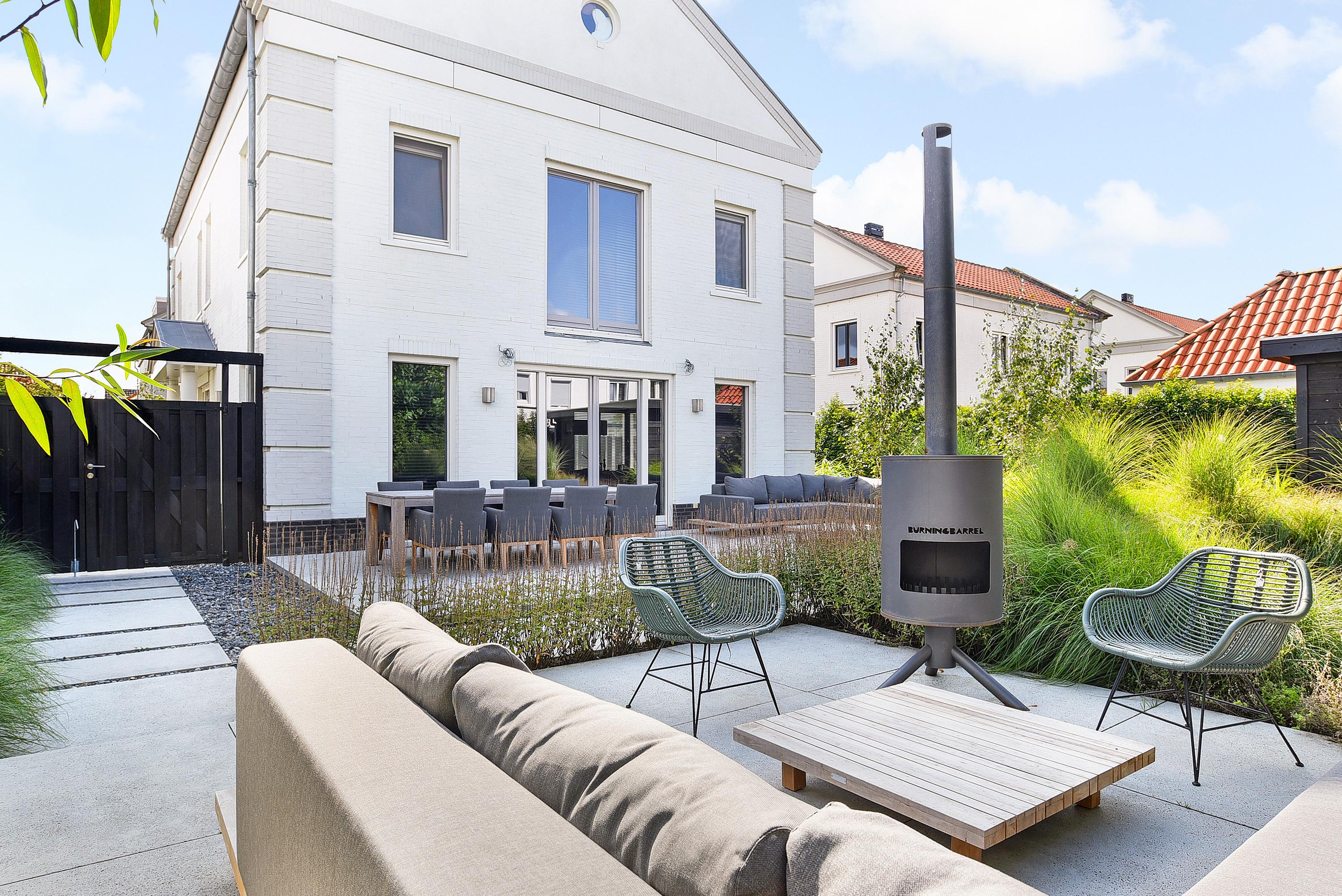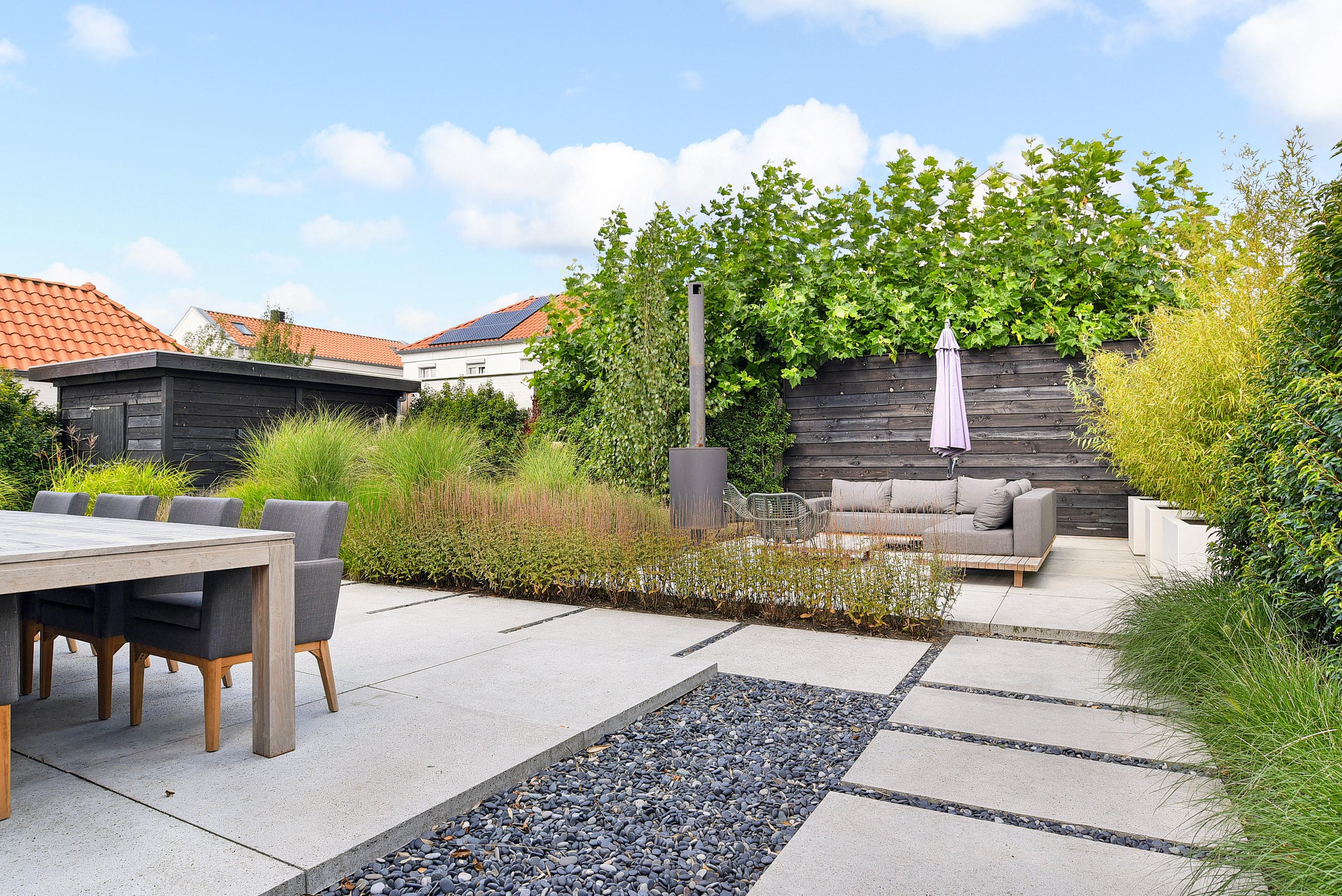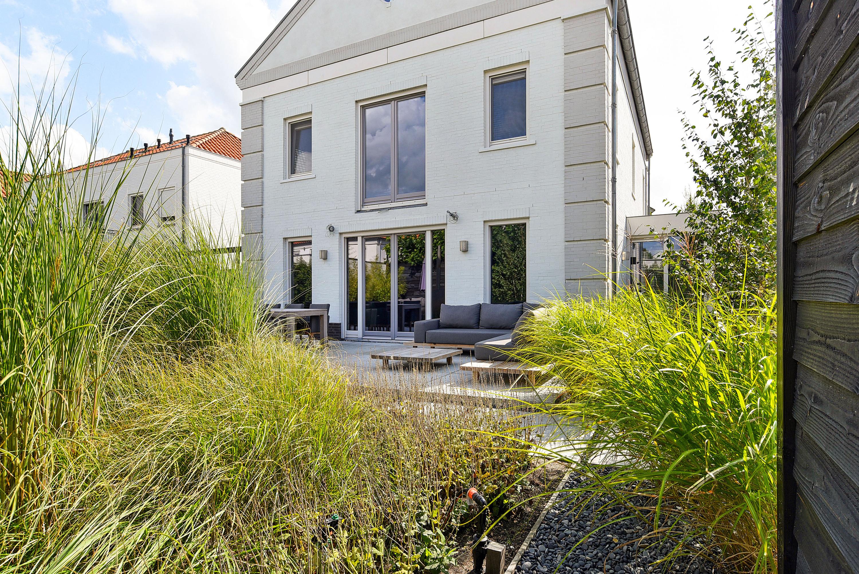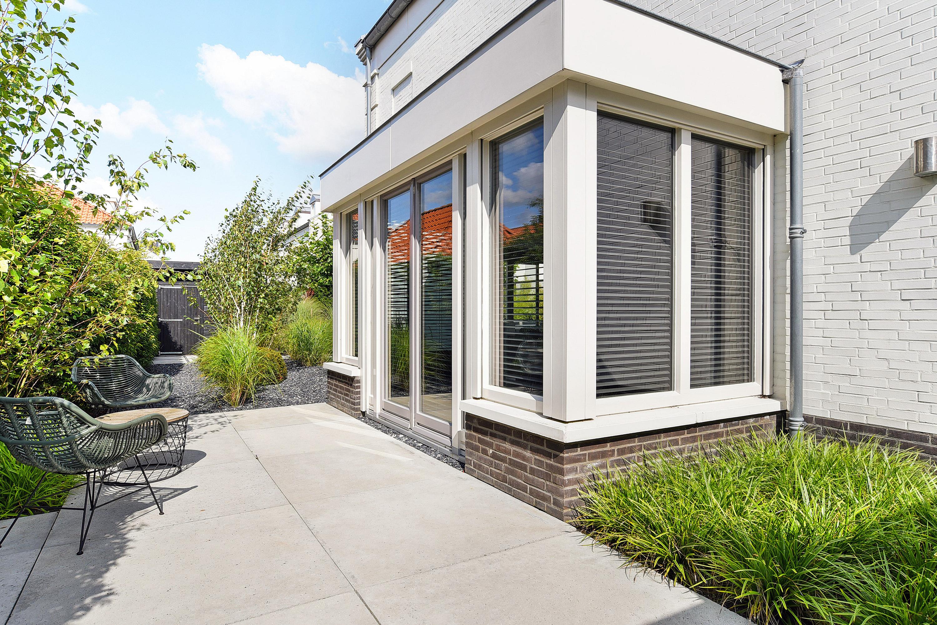 Via de openslaande deuren bereik je de fraai aangelegde tuin die rondom de woning is gelegen. Meerdere, deels onderheide terrassen maken het mogelijk om op elk moment van de dag te kiezen voor zon of schaduw. Het volwassen groen zorgt voor optimale privacy.