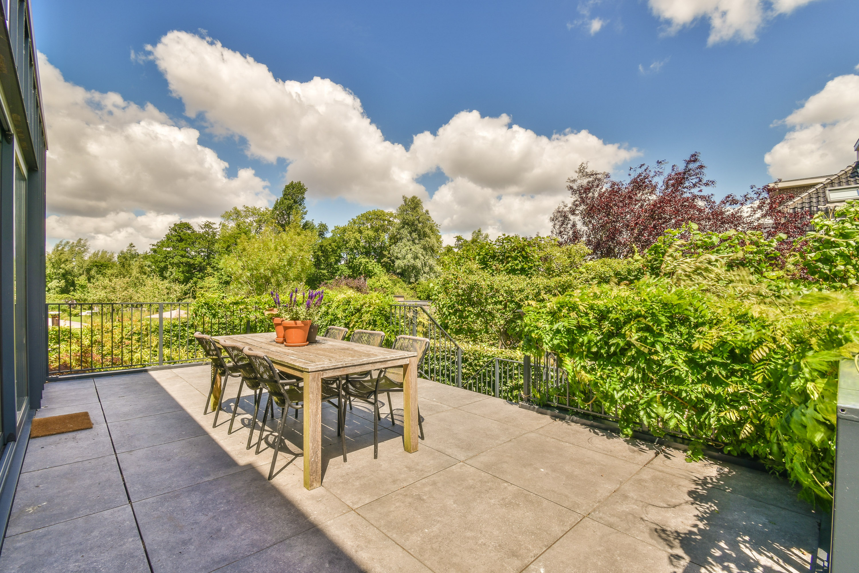 De bel-etage is te betreden via de representatieve entree aan de voorzijde van de woning. Bij binnenkomst vind je een gastentoilet en de centrale hal met toegang tot de sfeervolle woonkamer. Aan de achterzijde bevindt zich de royale woon-eetkeuken, compleet uitgerust met hoogwaardige inbouwapparatuur. Dankzij grote raampartijen en meerdere toegangen tot de buitenruimte, ervaar je hier veel licht en openheid. Rondom deze verdieping bevinden zich één groot terras : aan de zijkant en aan de voorkant – perfect voor buiten dineren of ontspannen in de zon.