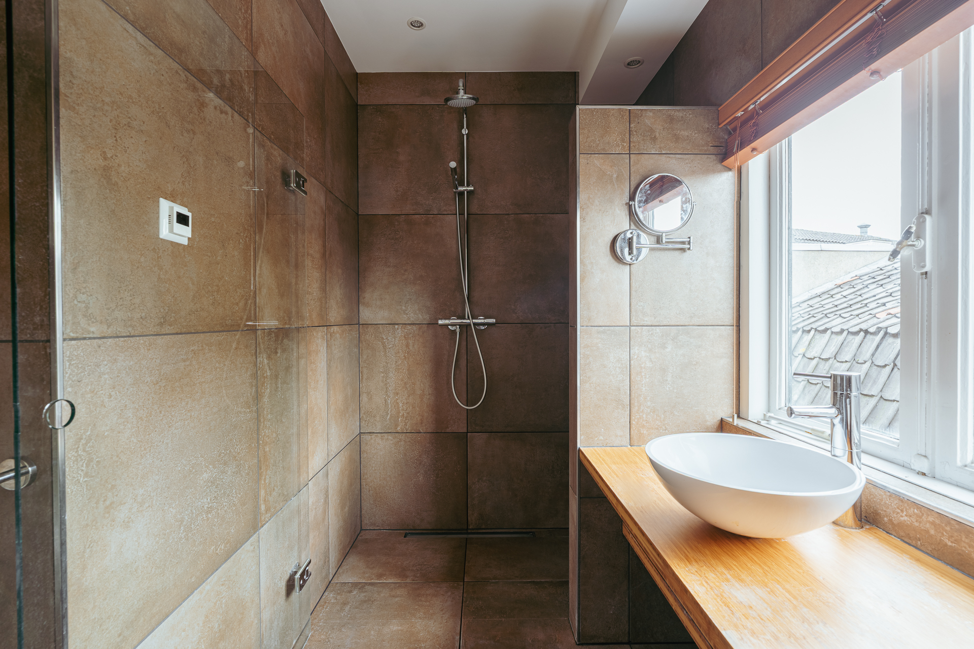 De bovenste verdieping is een open ruimte met hoge nok (ruim 3 meter) en grote dakramen en dakkapellen die zorgen voor veel lichtinval. Hier bevindt zich tevens een moderne badkamer met inloopdouche, wastafelmeubel, vloerverwarming en een derde toilet. Deze verdieping is bovendien voorzien van airconditioning, wat extra comfort biedt in alle seizoenen. De combinatie van het authentieke balkenplafond en de strakke afwerking geeft deze ruimte een bijzondere uitstraling. Indien gewenst kan de verdieping relatief eenvoudig worden opgedeeld in twee aparte slaapkamers.