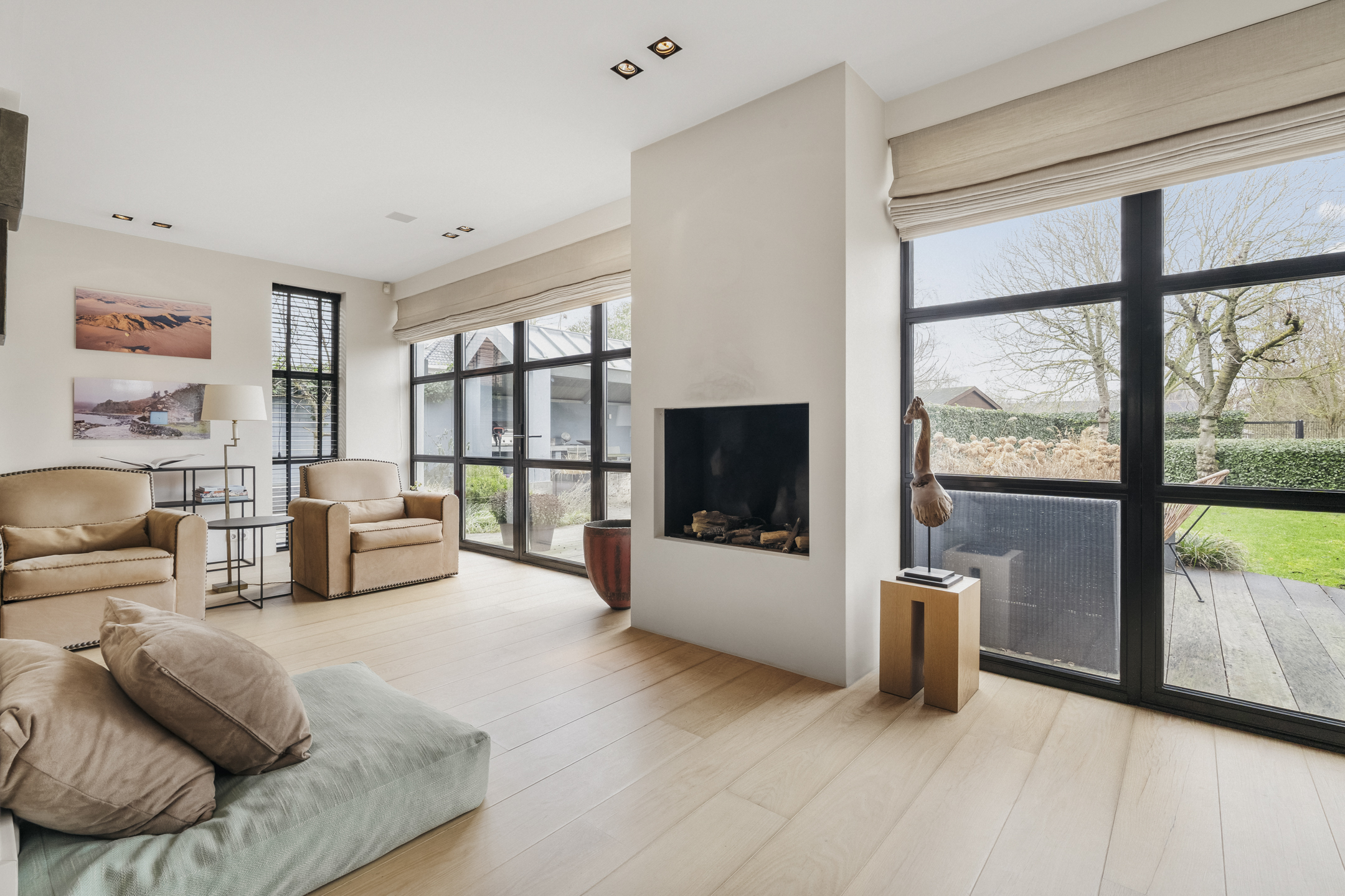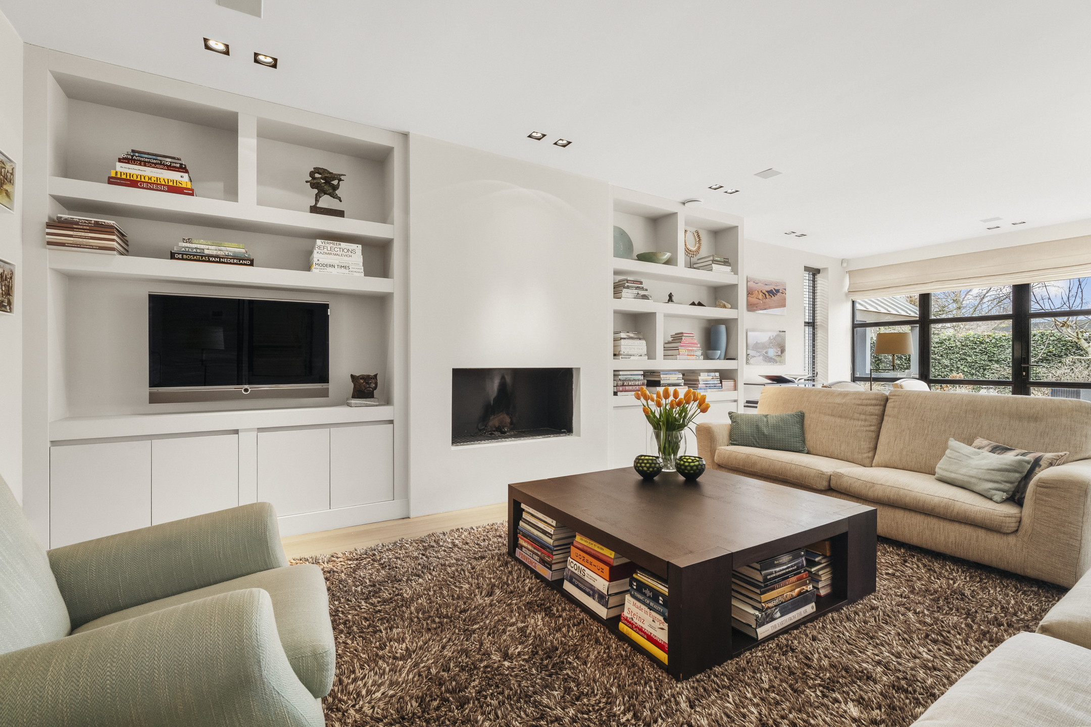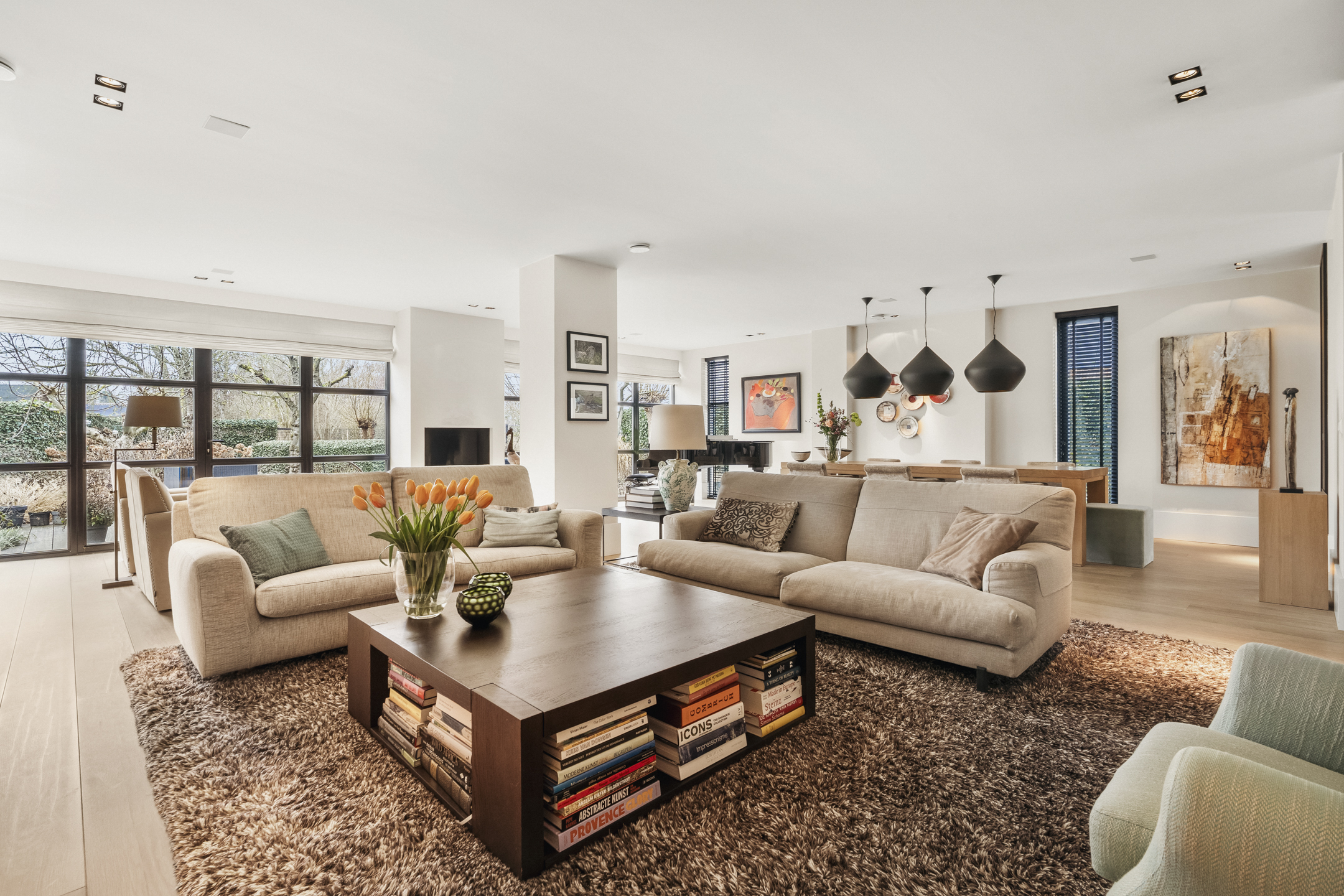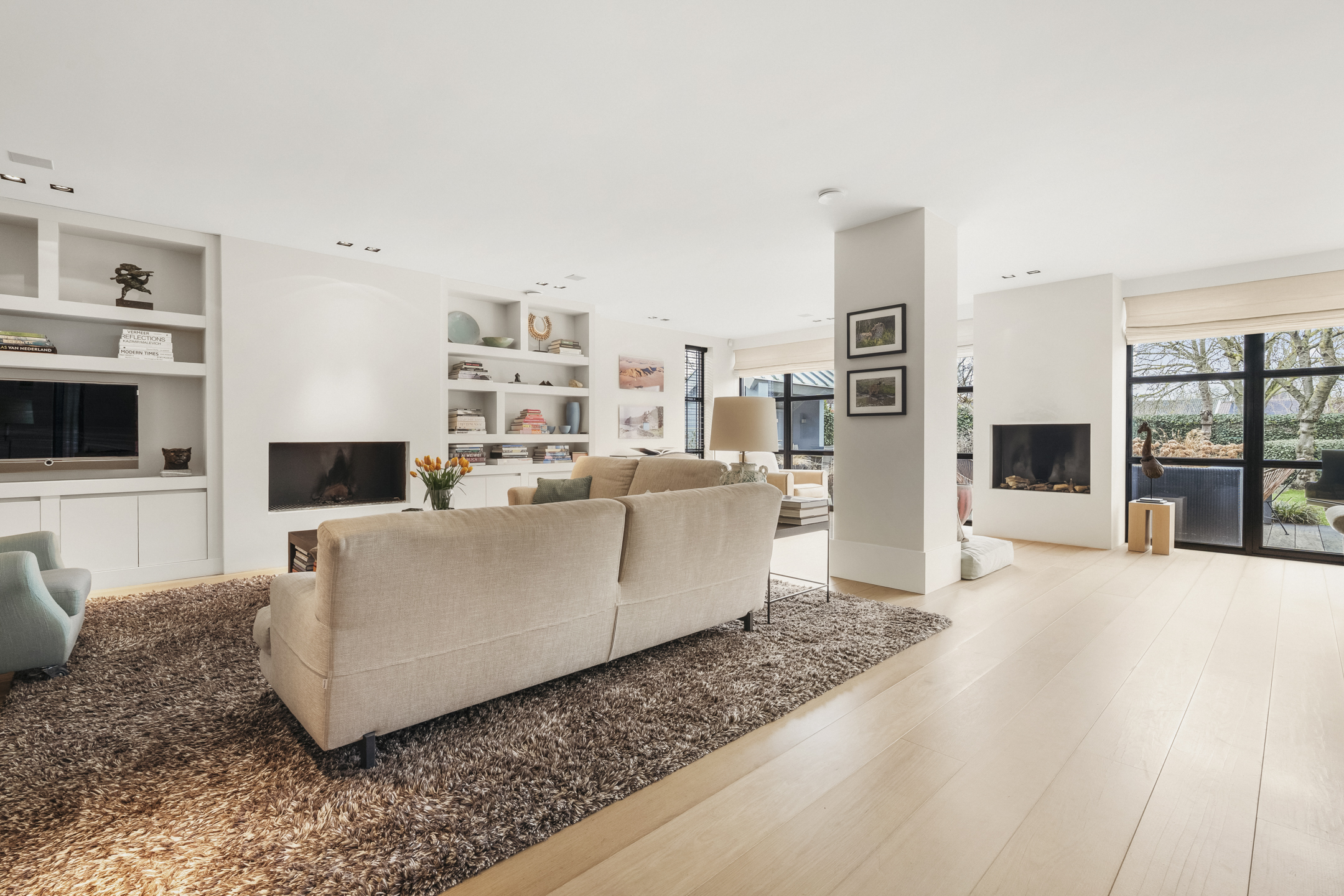 De woonkamer is zo ruim dat er tevens een tweede zit- of loungegedeelte is gecreëerd, voorzien van een gashaard. Het lichtplan met verlichting van Maretti en het geïntegreerde Sonos-geluidssysteem (woonkamer, woonkeuken en studeerkamer) versterken de luxe woonbeleving.