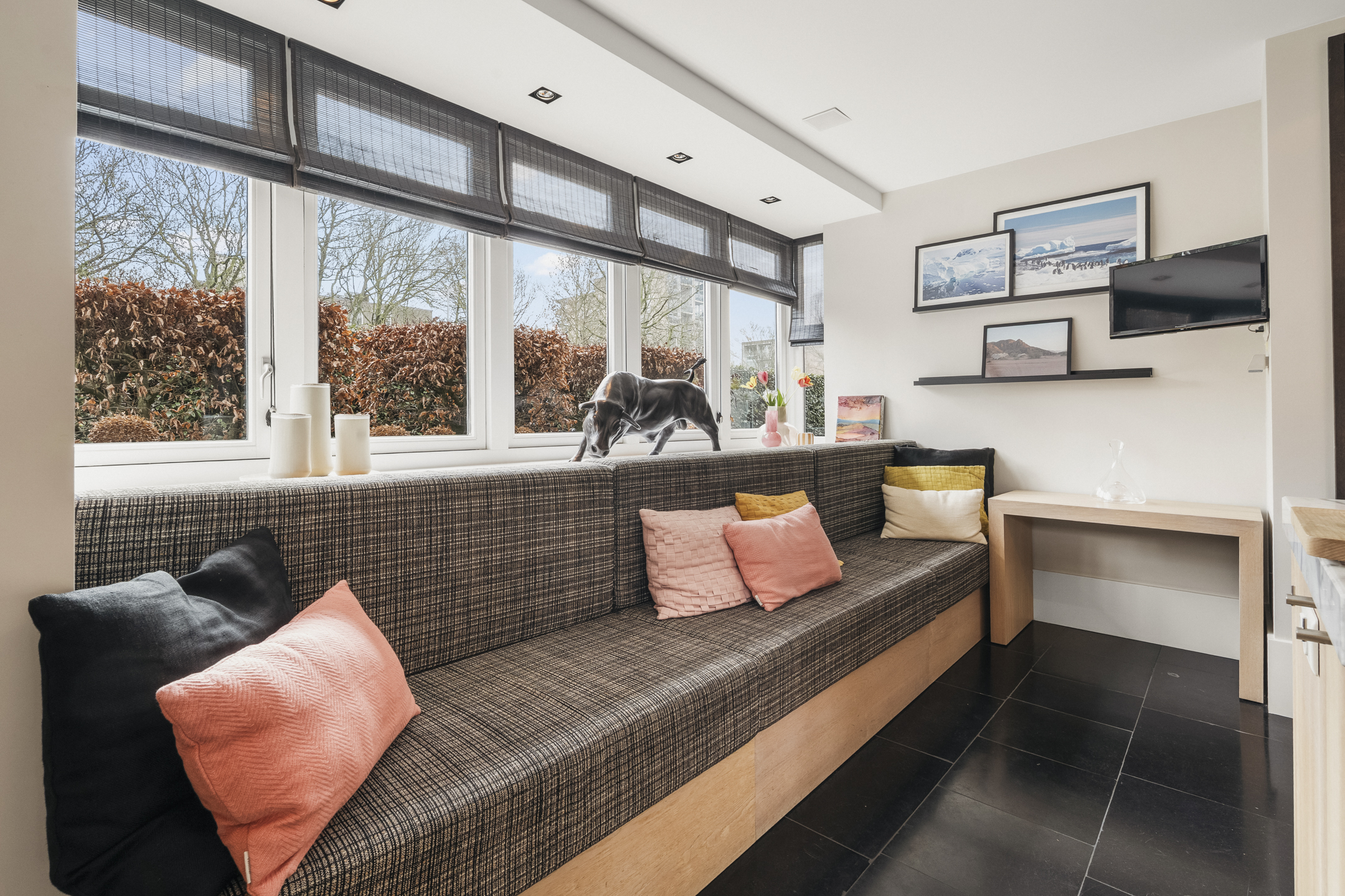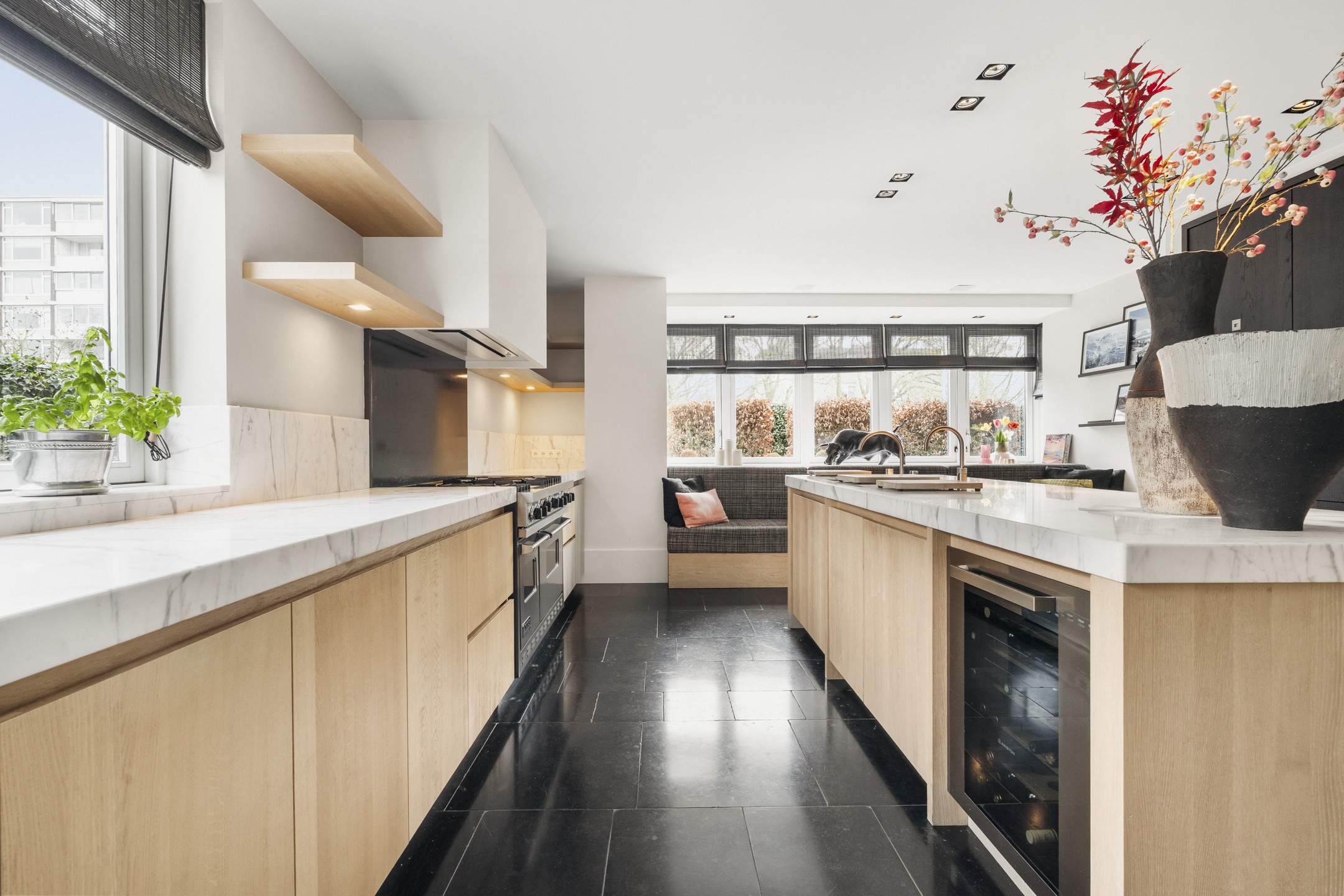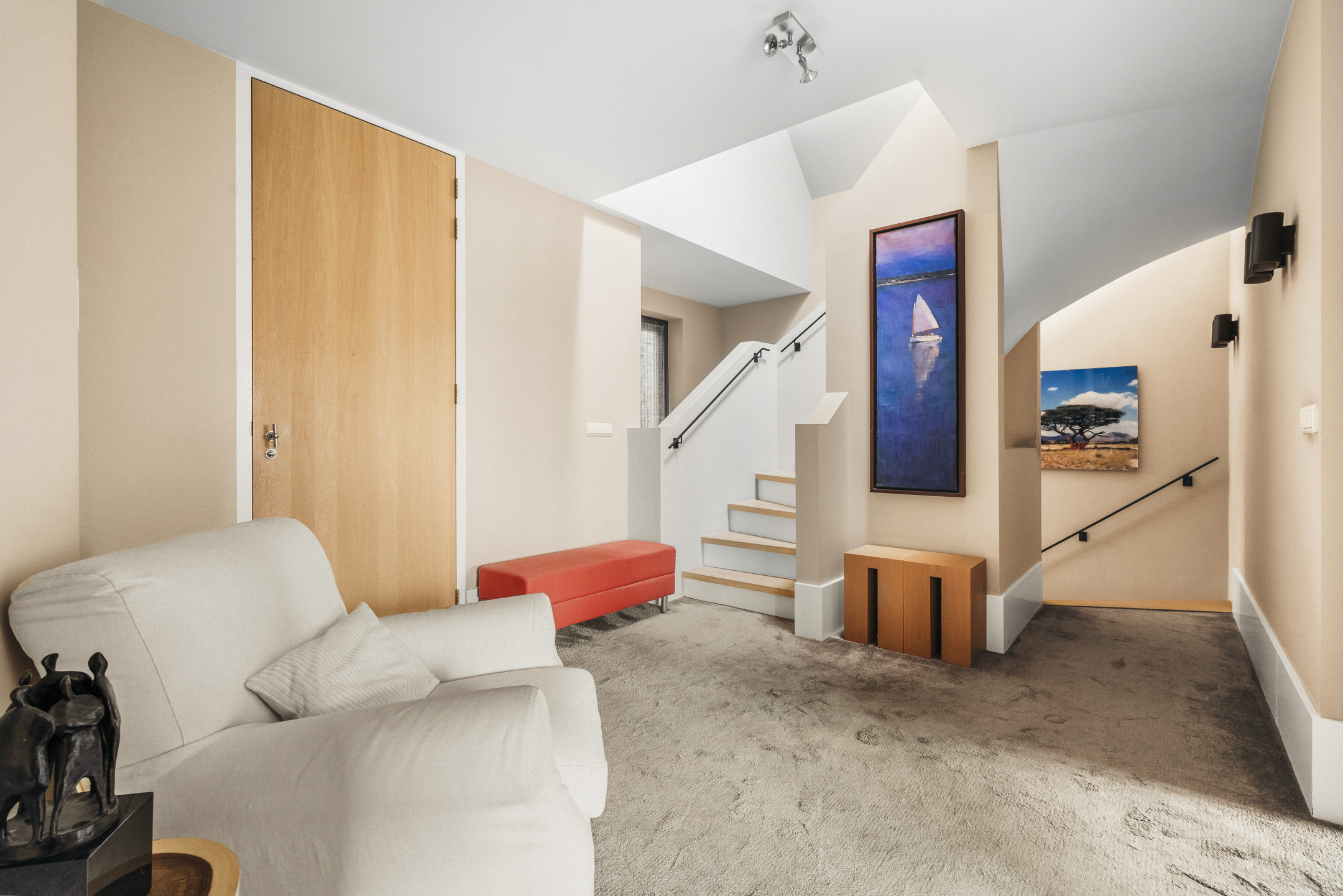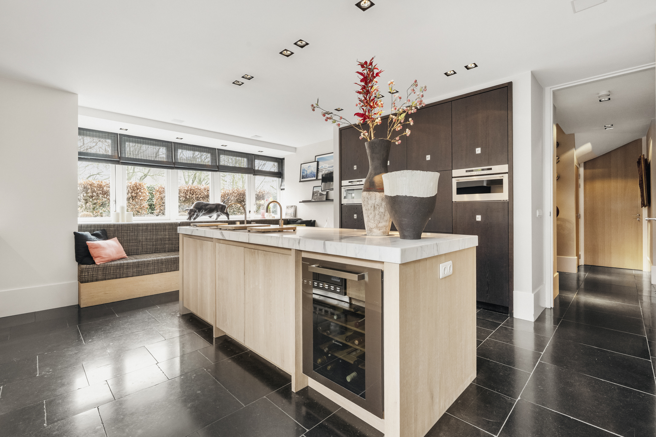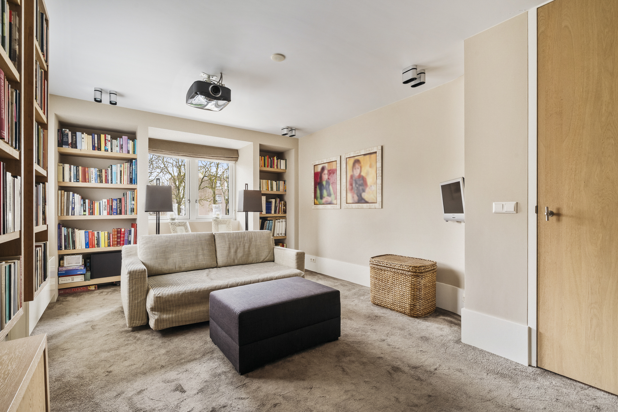 De woonkamer is zo ruim dat er tevens een tweede zit- of loungegedeelte is gecreëerd, voorzien van een gashaard. Het lichtplan met verlichting van Maretti en het geïntegreerde Sonos-geluidssysteem (woonkamer, woonkeuken en studeerkamer) versterken de luxe woonbeleving.