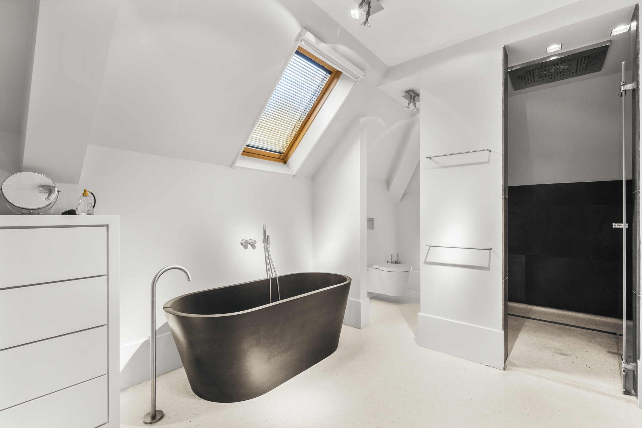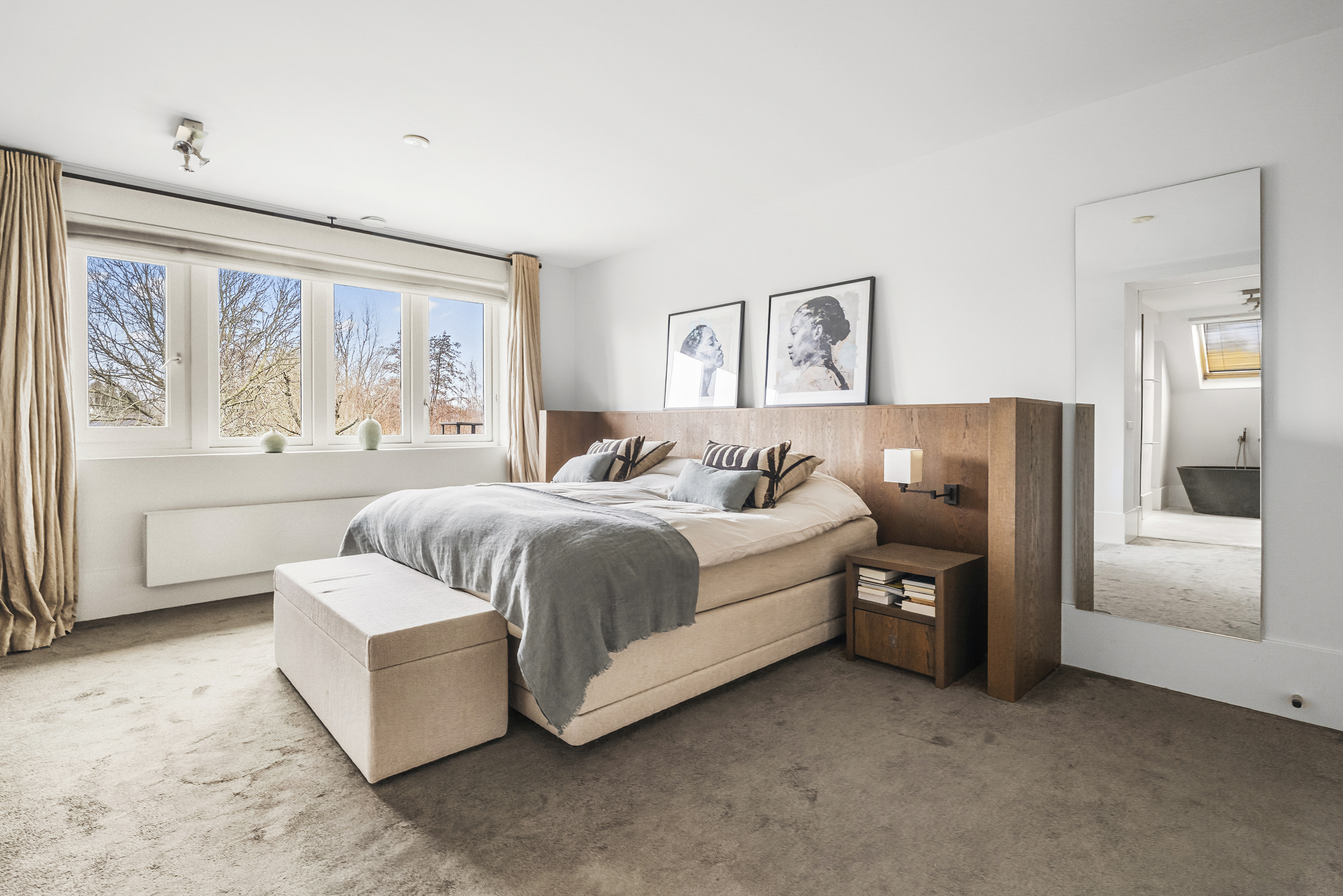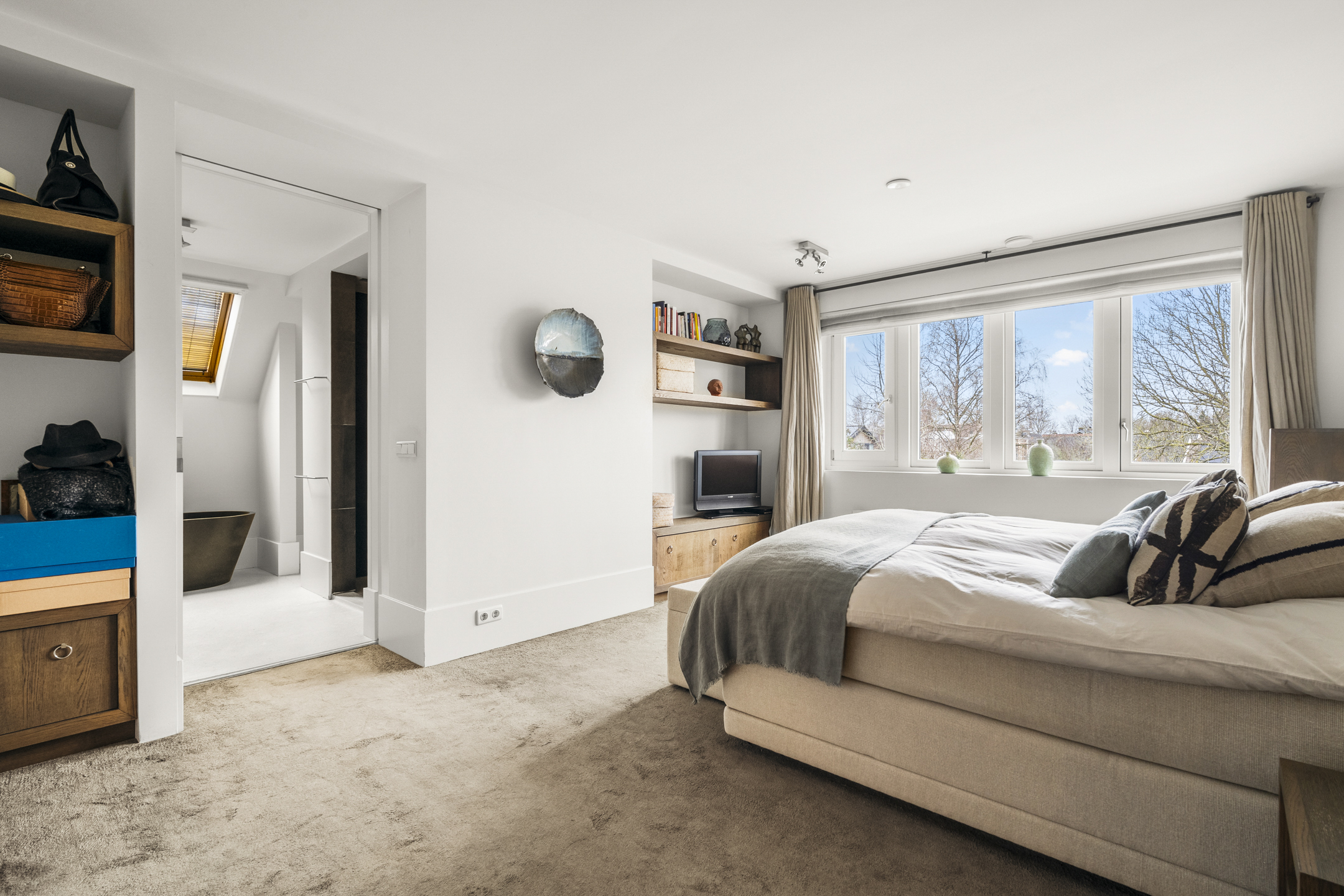 Aan de achterzijde bevindt zich de masterbedroom, voorzien van op maat gemaakte kasten en een luxe badkamer ensuite, welke afsluitbaar is middels een schuifdeur. De badkamer is uitgevoerd met een wandcloset, vrijstaand ligbad, wastafelmeubel en een zeer riante inloopdouche. Aangrenzend bevindt zich een ruime walk-in closet, eveneens volledig op maat gerealiseerd.