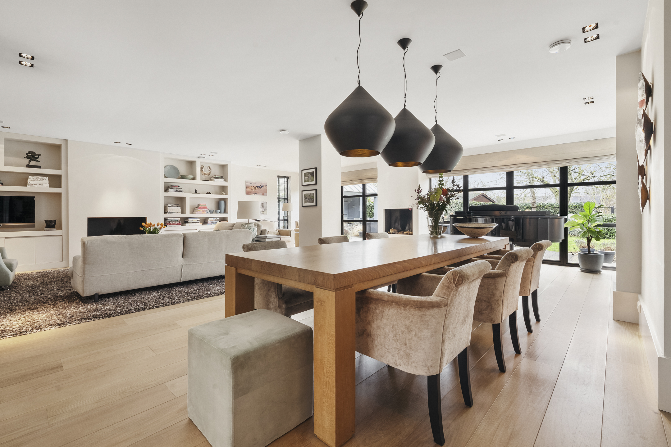 De woonkamer is royaal, licht en bijzonder sfeervol. Grote raampartijen en twee sets dubbele deuren zorgen voor een directe verbinding met de achtertuin en laten het buitenleven naadloos overgaan in het interieur. Eén van de twee open haarden vormt het warme middelpunt van de ruimte. De woonkamer biedt ruim plaats aan een grote eettafel, waardoor dit de ideale plek is voor lange diners en gezellige avonden met familie en vrienden.