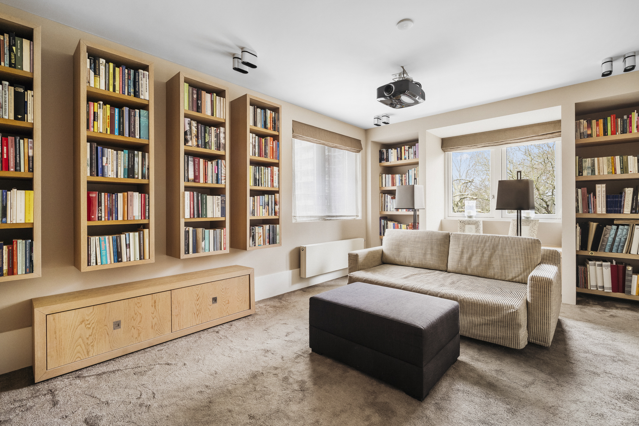 Aan de voorzijde van de woning bevindt zich een royale slaapkamer, momenteel ingericht als film-/bioscoopkamer, compleet met beamer en scherm. Ook deze kamer is voorzien van op maat gemaakte kasten, volledig passend binnen het ontwerp van de woning.