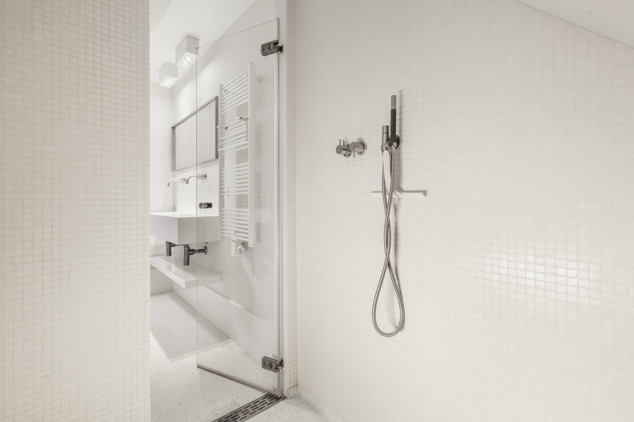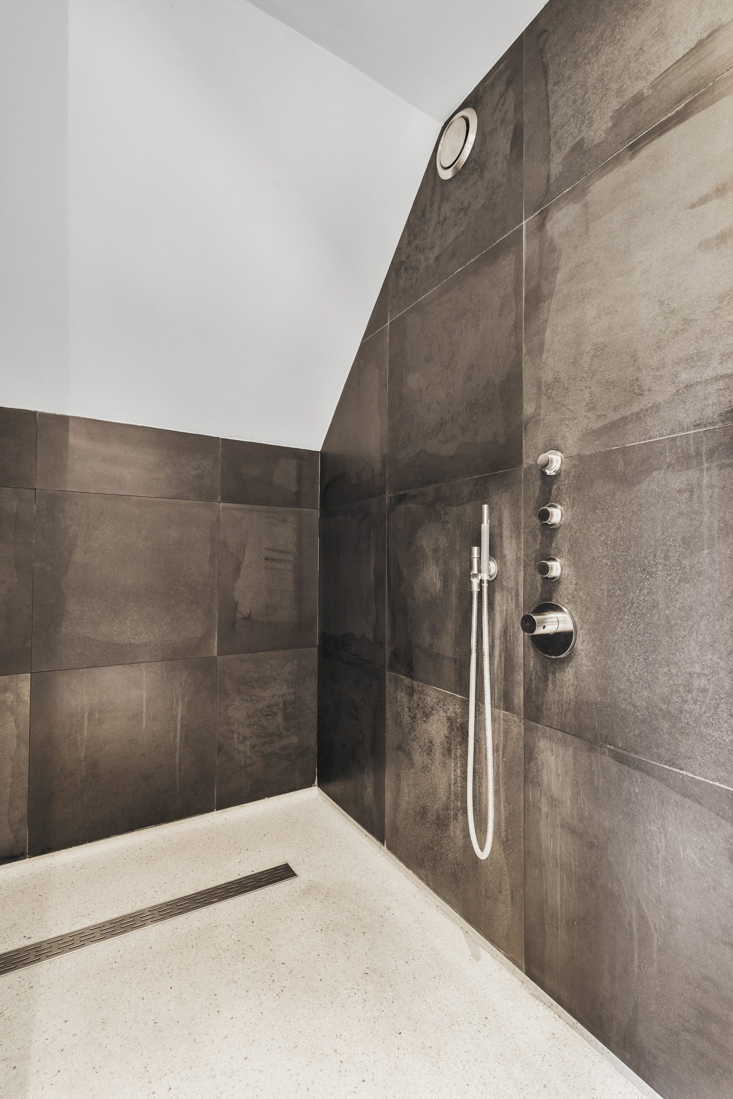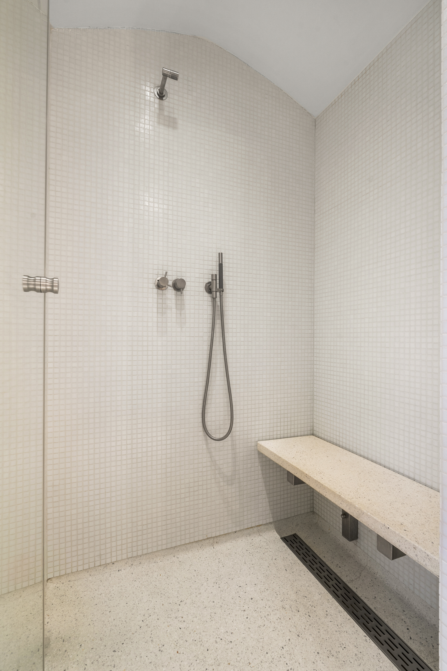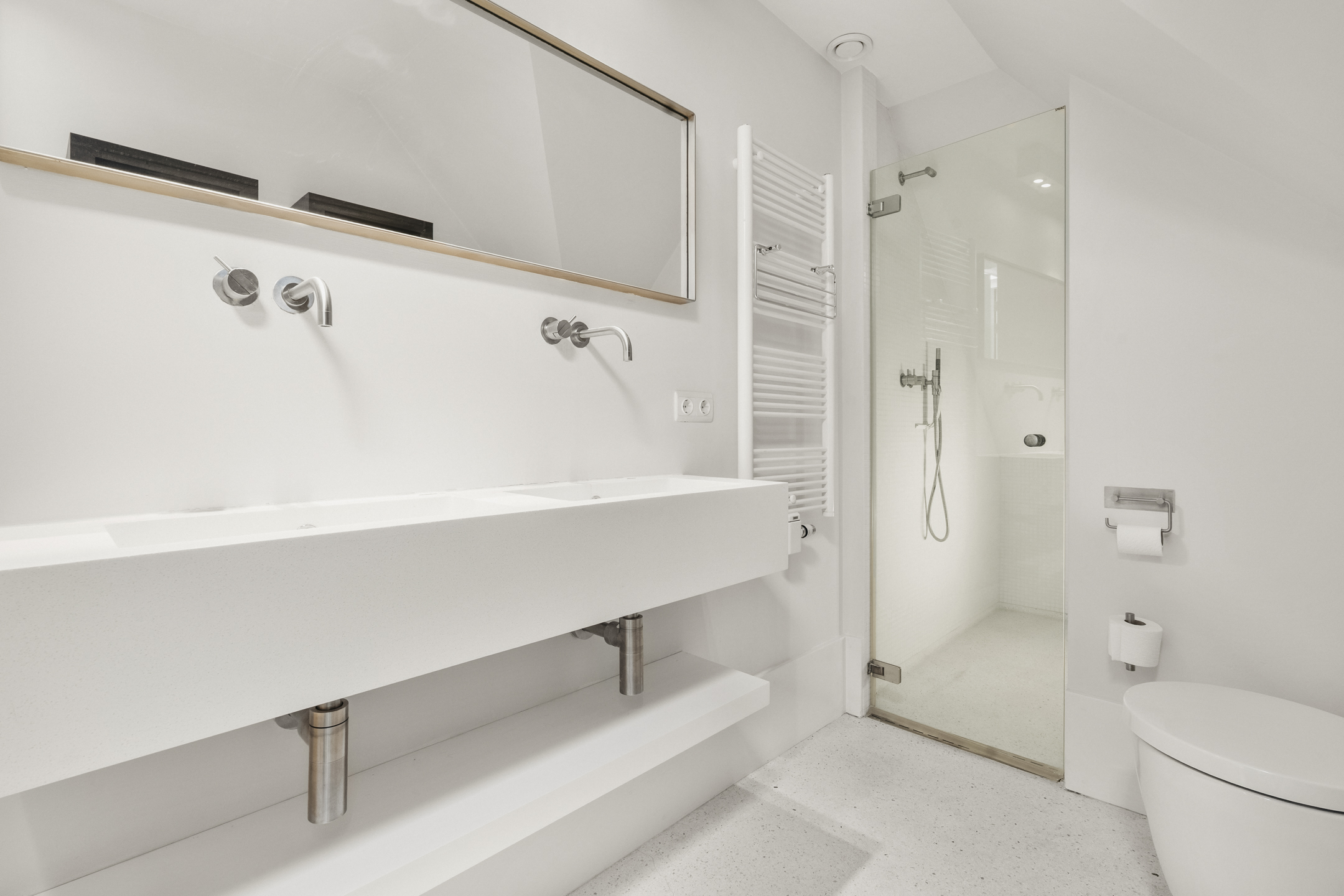 De gastenbadkamer op deze verdieping is luxe uitgevoerd en beschikt over een wastafelmeubel, wandcloset en een inloopdouche met Cleopatra stoomcabine, wat zorgt voor extra comfort en wellnessbeleving.