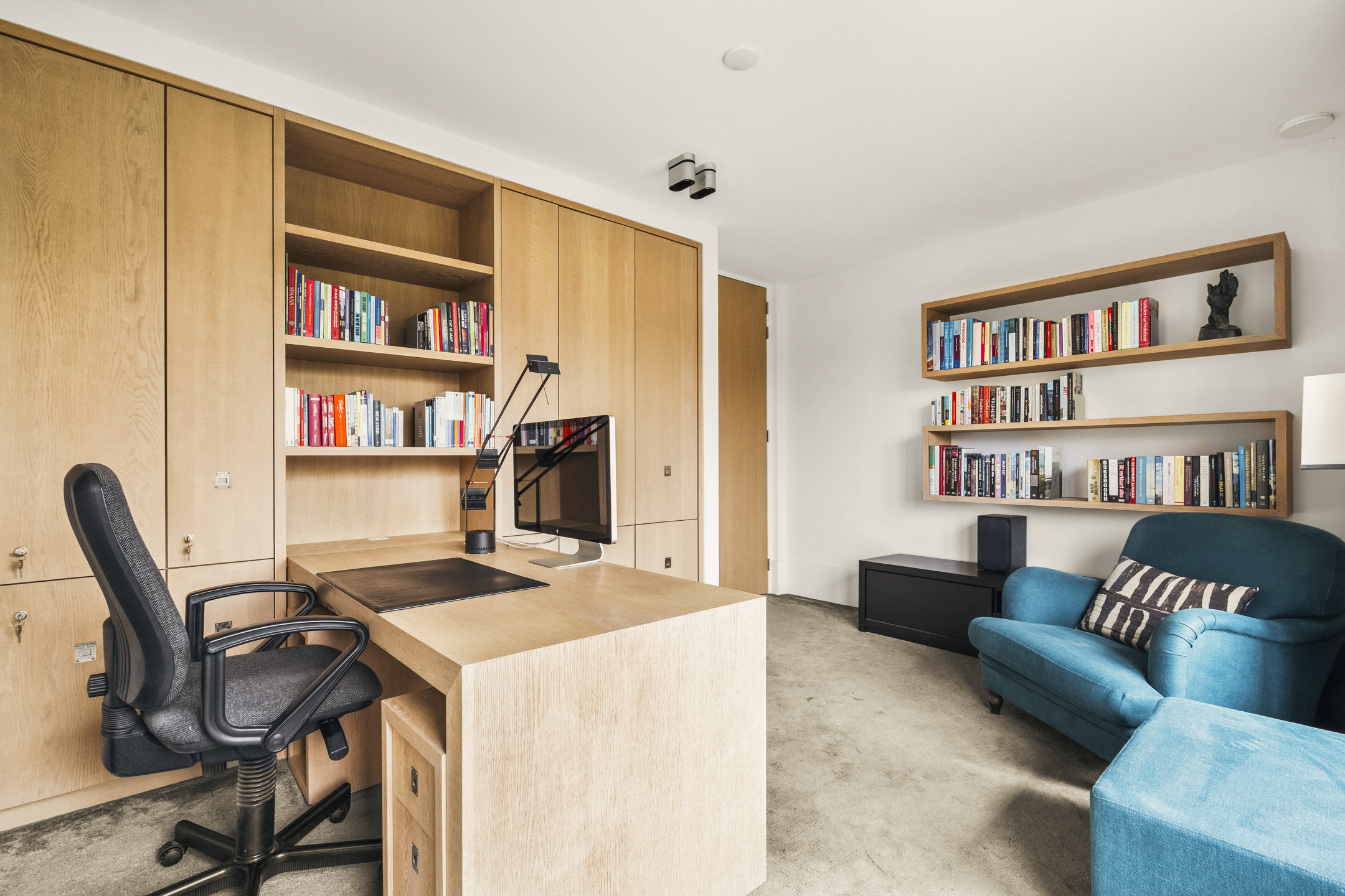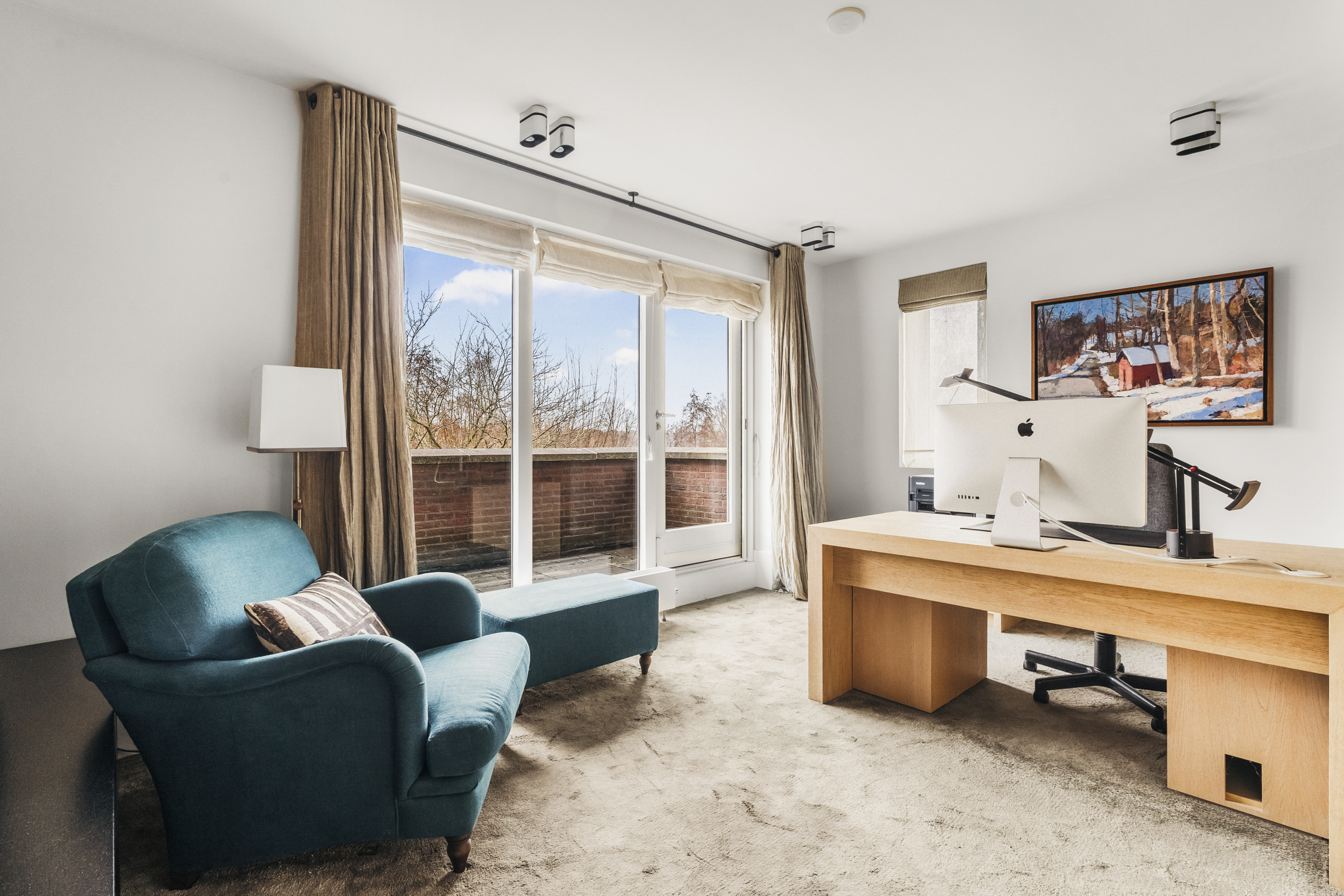 Tevens aan de achterzijde ligt een slaapkamer die thans in gebruik is als werkkamer. Deze kamer beschikt over maatwerk kasten en biedt toegang tot het balkon gelegen op het westen, met uitzicht op de tuin.