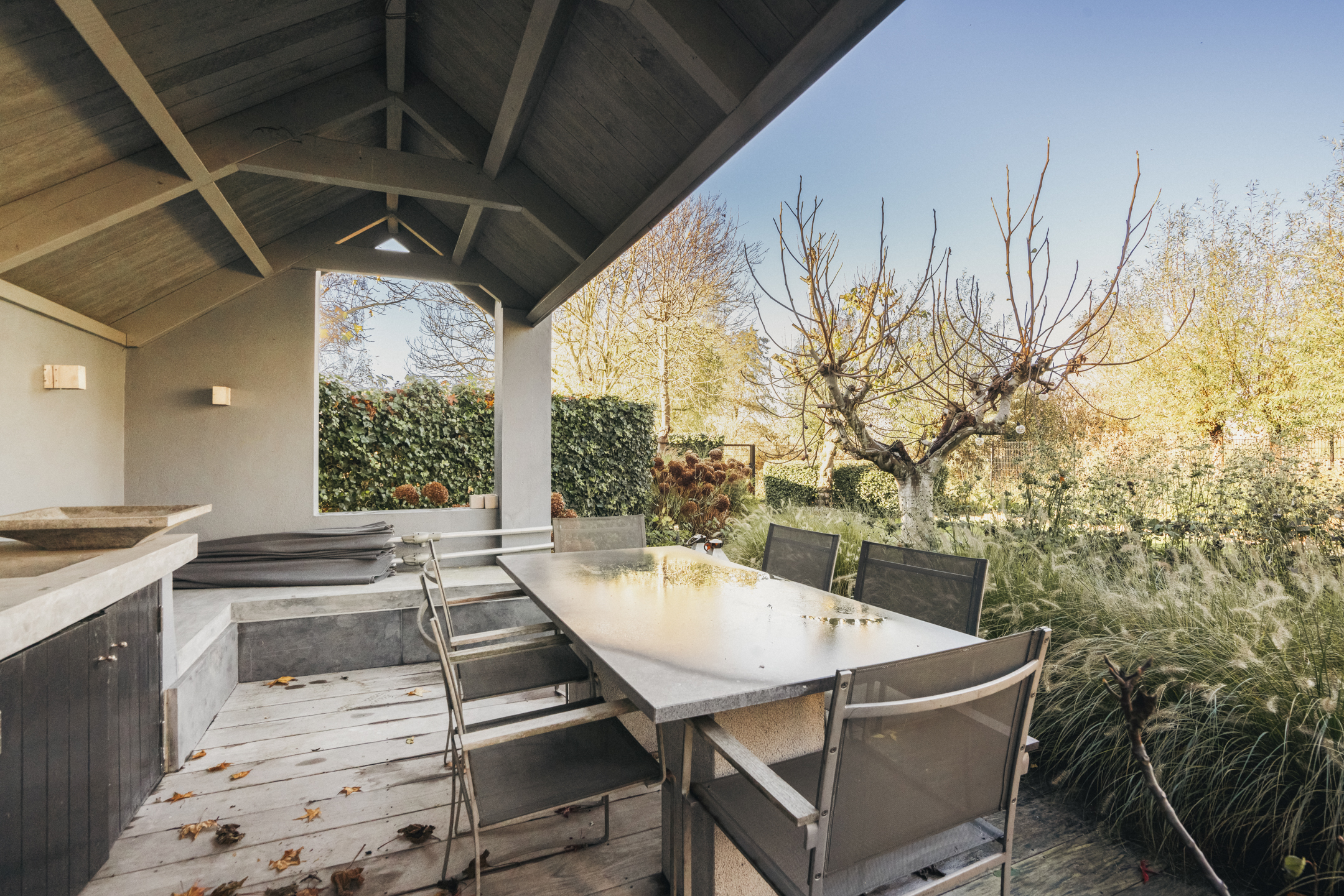 De achtertuin is gelegen op het westen en vormt een belangrijk verlengstuk van de woning. In de tuin bevindt zich een buitenkeuken die uitstekend kan worden ingericht als buitenlounge – een heerlijke plek voor lange zomeravonden, diners met vrienden en ontspannen momenten in alle privacy.