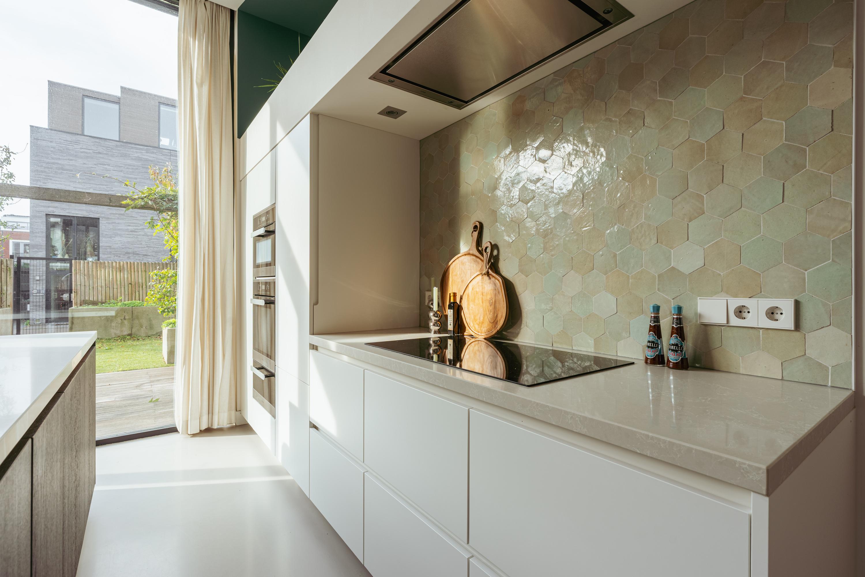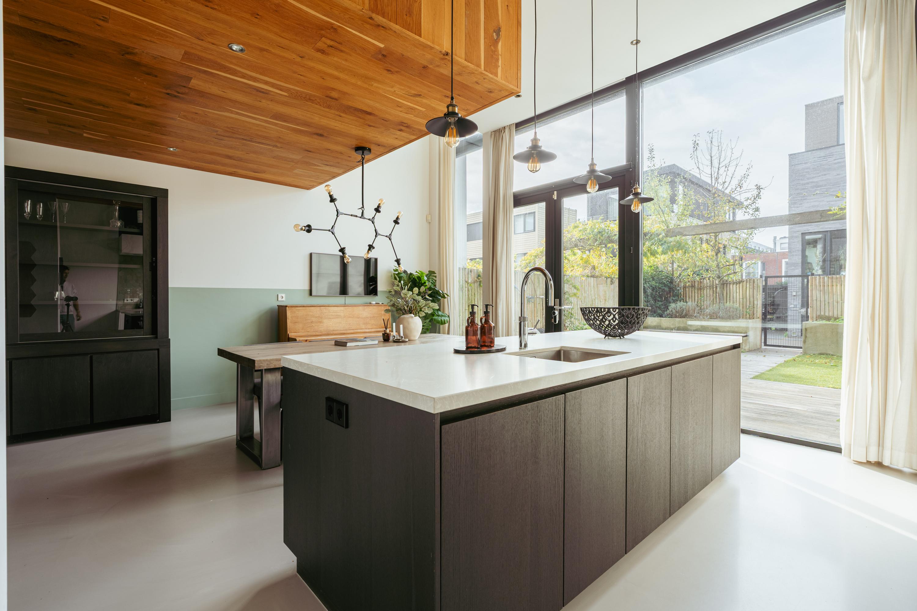 Via de glazen tussendeur bereikt u de ruime leefkeuken, gelegen aan de achterzijde met zicht op de tuin. De hoge plafonds en grote raampartijen tot aan de vloer zorgen voor een overvloed aan licht en een ruimtelijk gevoel. De moderne keuken is uitgerust met een groot kookeiland, composiet werkblad en hoogwaardige inbouwapparatuur, waaronder een vaatwasser, Quooker, inductiekookplaat, magnetron, oven en bordenwarmer.
