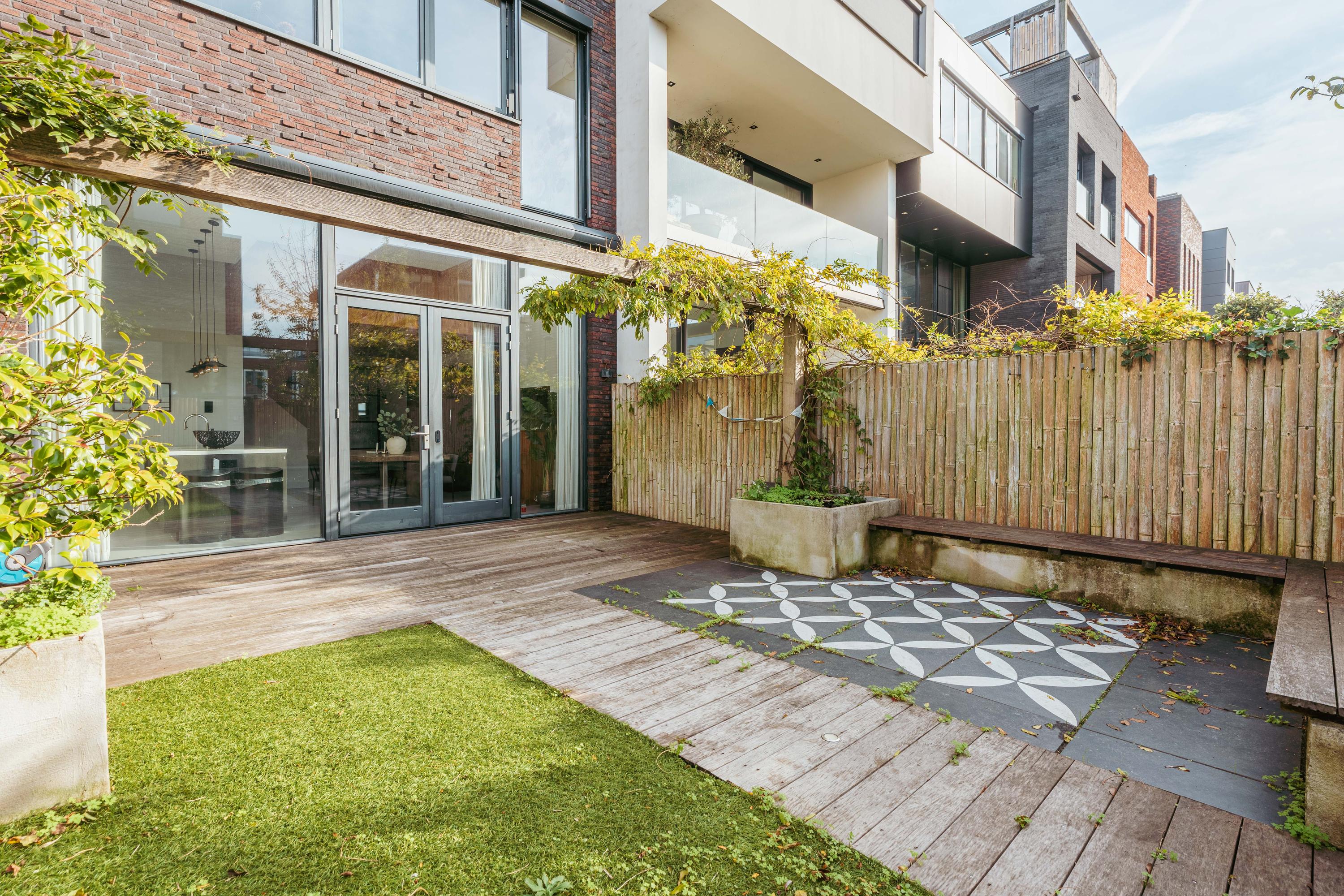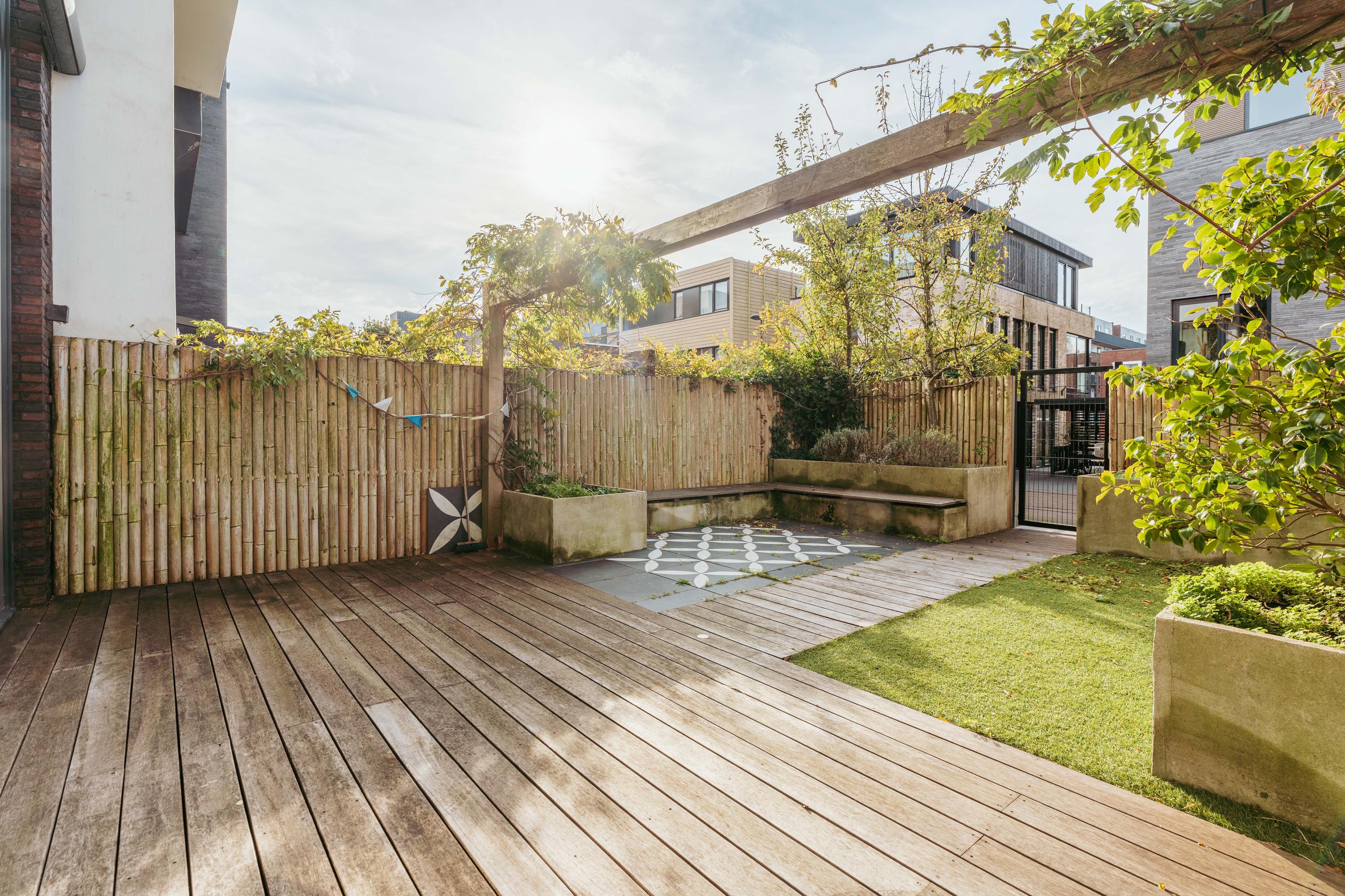Dubbele openslaande deuren geven toegang tot de onderhoudsvriendelijke achtertuin van circa 54 m². De tuin is fraai aangelegd met houten vlonders, sierbestrating en groen. Achterin bevindt zich een eigen poort naar het achtergelegen terrein met twee privéparkeerplaatsen voorzien van een elektrische laadpaal.