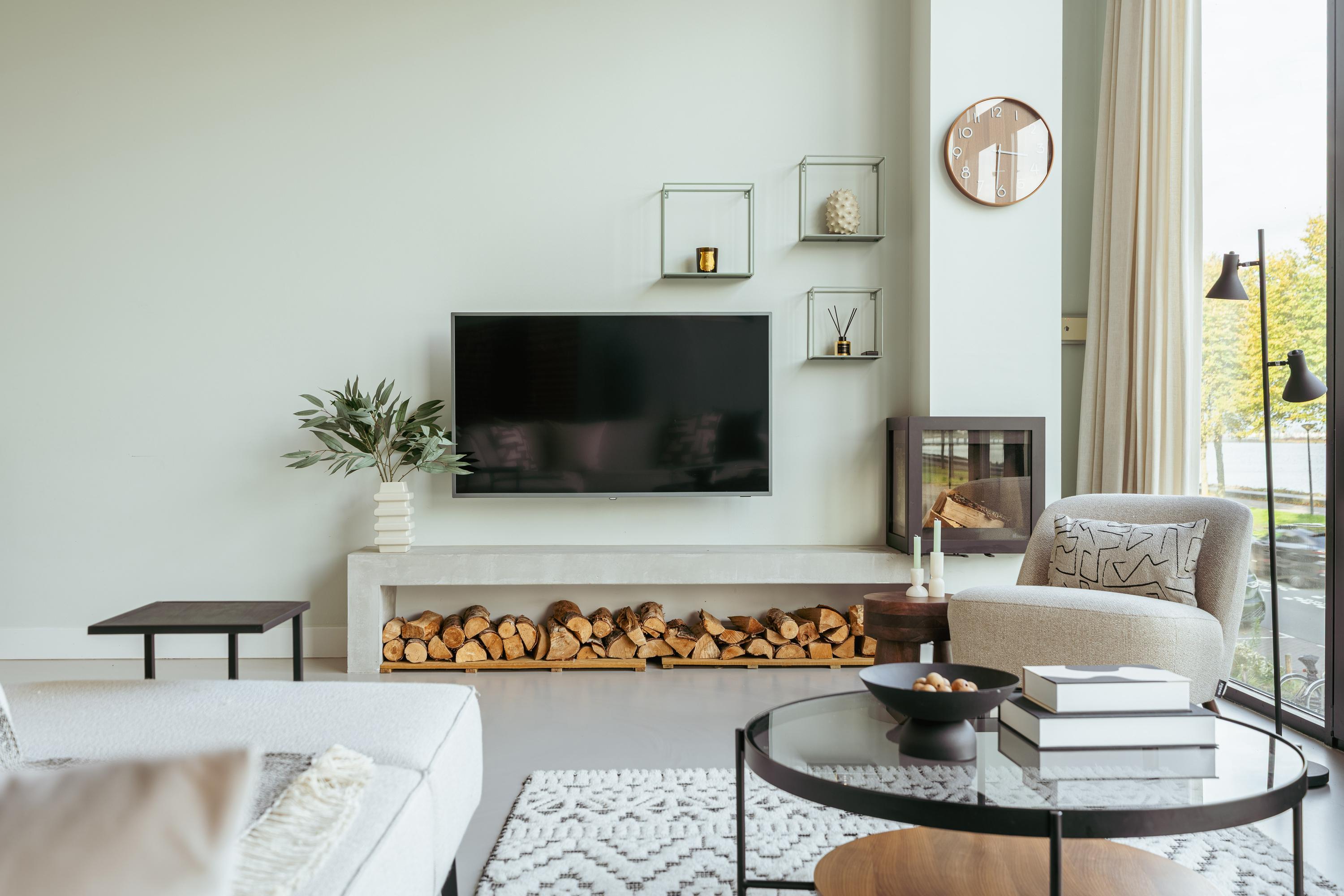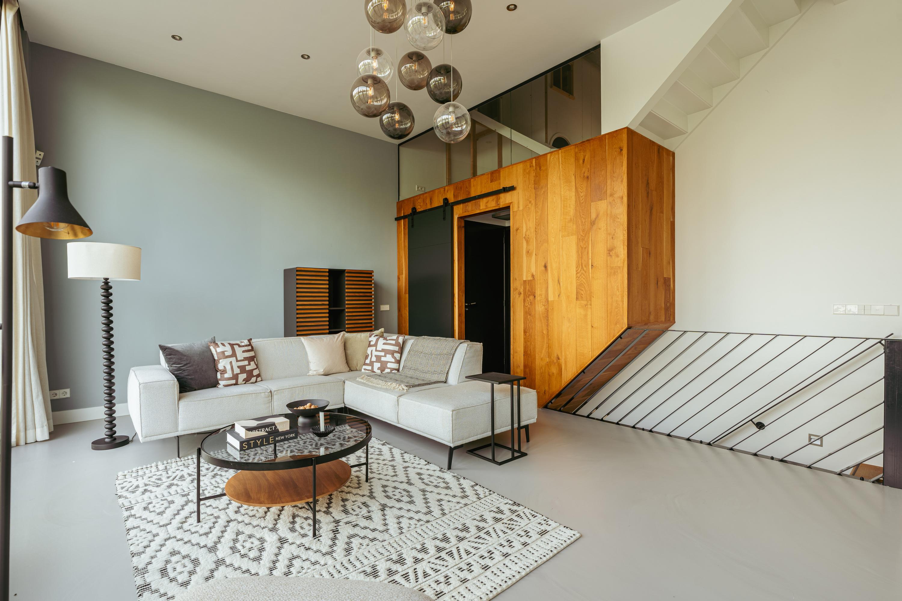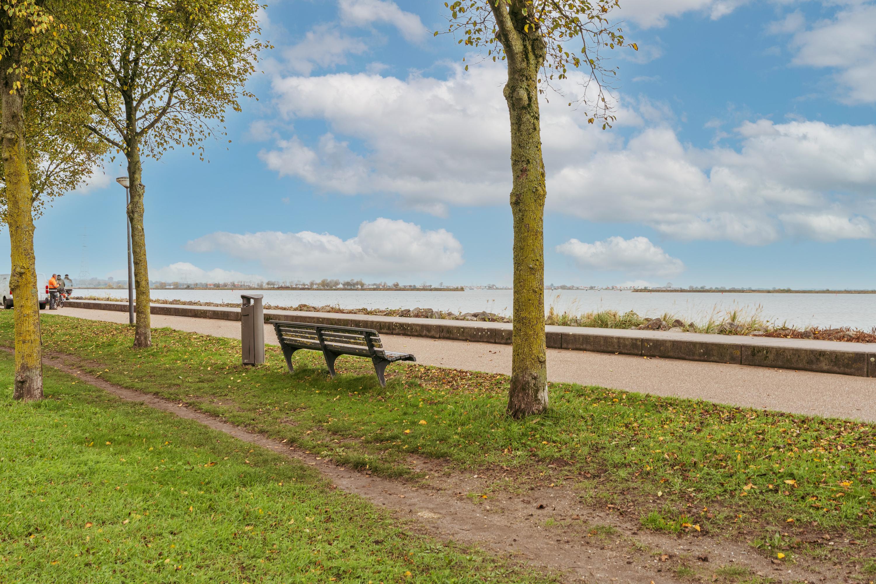 De eerste verdieping is ingericht als comfortabele woonverdieping met een speelse indeling en veel licht. Aan de voorzijde ligt de ruime woonkamer met een plafondhoogte van 2,60 meter en grote raampartijen met vrij uitzicht over het IJmeer. De openslaande deuren en haard creëren een sfeervolle, lichte ruimte met een vloeiende overgang tussen binnen en buiten.