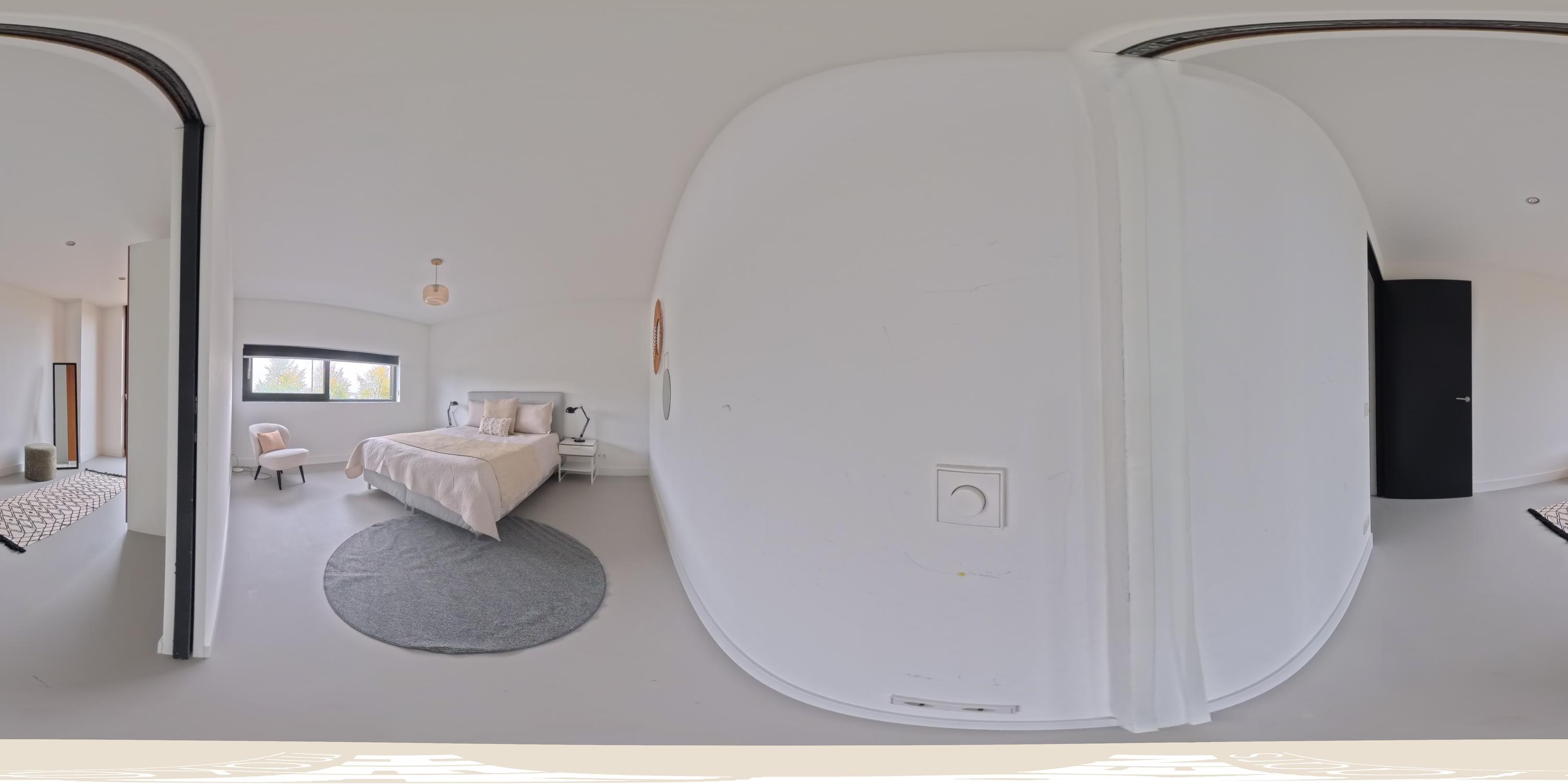 Aan de voorzijde bevindt zich een zeer ruime slaapkamer, momenteel ingericht als stijlvolle master bedroom. Dankzij de grote raampartij over de volledige breedte geniet u hier van een spectaculair uitzicht over het IJmeer. De kamer voelt dankzij de glazen scheidingswand en rustige kleurtinten modern en ruimtelijk aan.