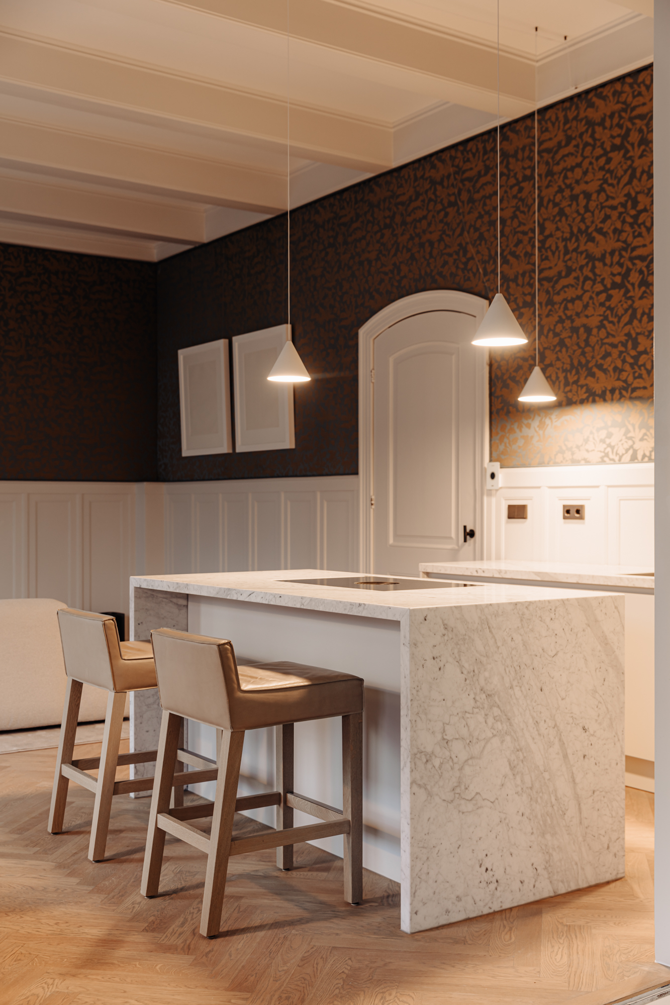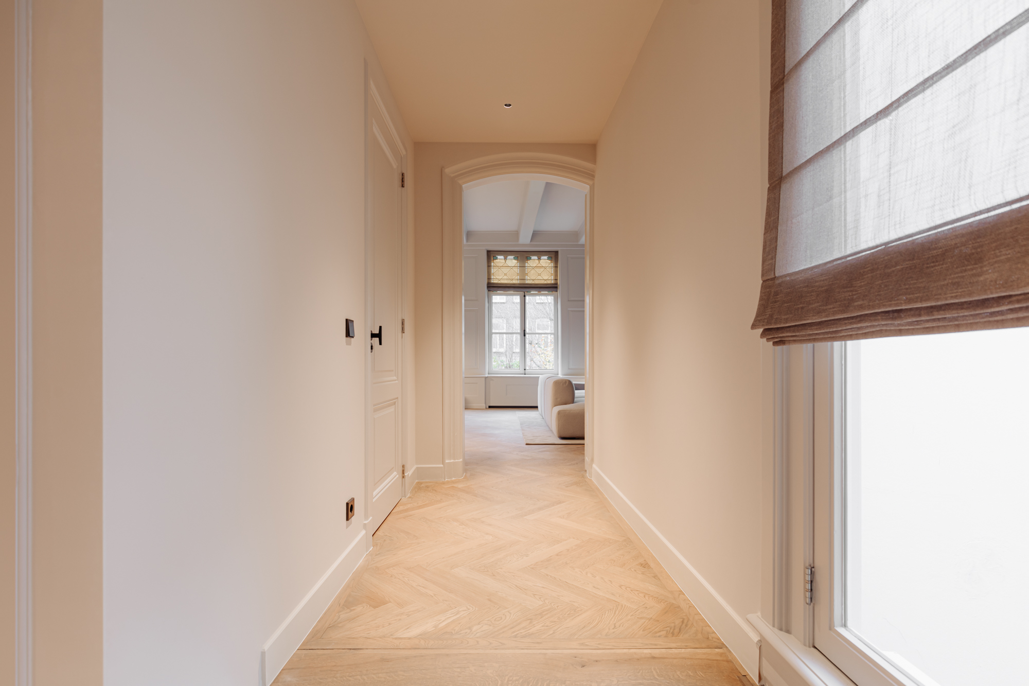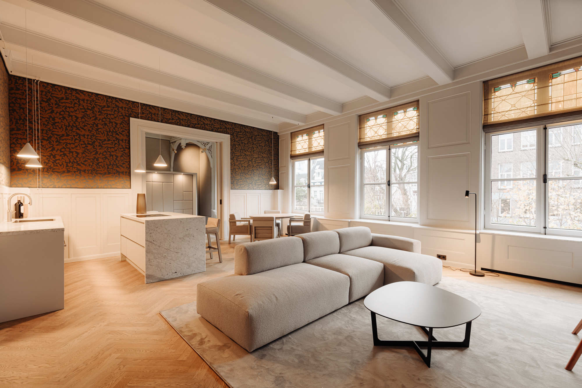 Via het bordes en de nette gemeenschappelijke hal is de entree op de eerste verdieping bereikbaar, zowel via de trap als met de lift. Het appartement beslaat de volledige breedte van de panden nr. 129 en 131 (circa 14 meter). In de hal bevinden zich een garderobe, een gastentoilet en een kast met aansluiting voor wasmachine en droger. De woonkamer is ruim en licht, met een moderne open keuken voorzien van een kookeiland met bar. De keuken is uitgerust met hoogwaardige inbouwapparatuur en een marmeren werkblad. Dankzij de grote ramen en het originele glas-in-lood is de ruimte zeer licht. Aangrenzend bevindt zich een stijlkamer met originele lambrisering, gespannen wandbekleding en een houten balkenplafond. De slaapkamer, bereikbaar via hoge schuifdeuren, is gelegen in de voormalige kapel van het pand. Deze ruimte is bijna 8,40 meter hoog en voorzien van gedetailleerd houtsnijwerk. Achter het bed bevindt zich een ruime inloopkast. De badkamer is volledig ingericht door Piet Boon en beschikt over een ligbad, inloopdouche, dubbele wastafel in travertin en een apart toilet. Door het hele appartement ligt een eikenhouten vloer met akoestische isolatie en vloerverwarming.