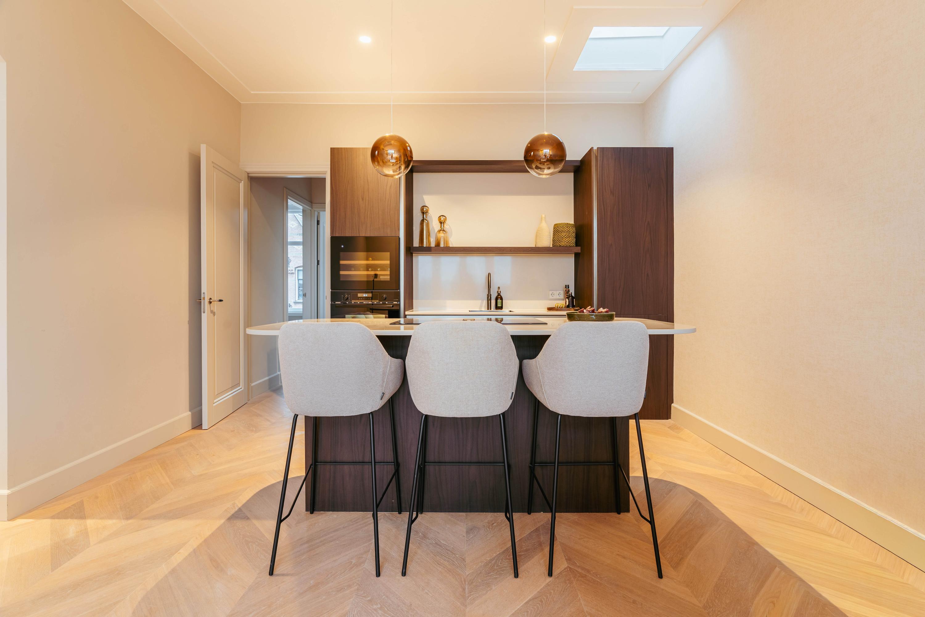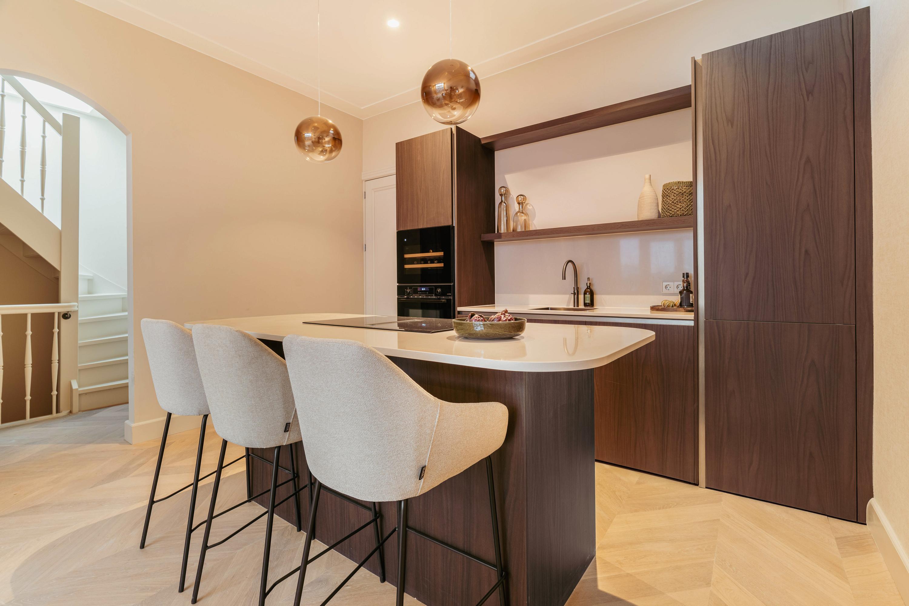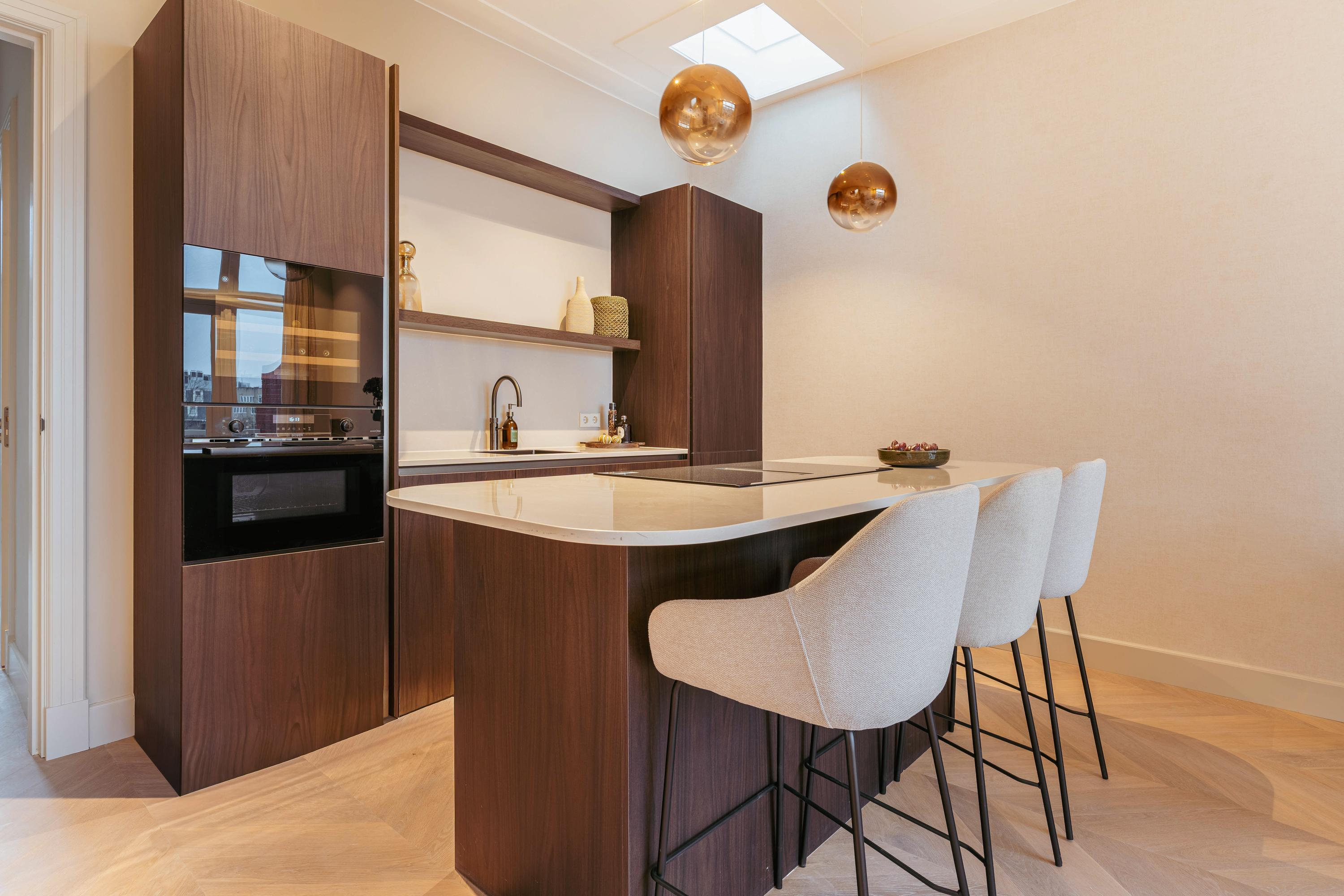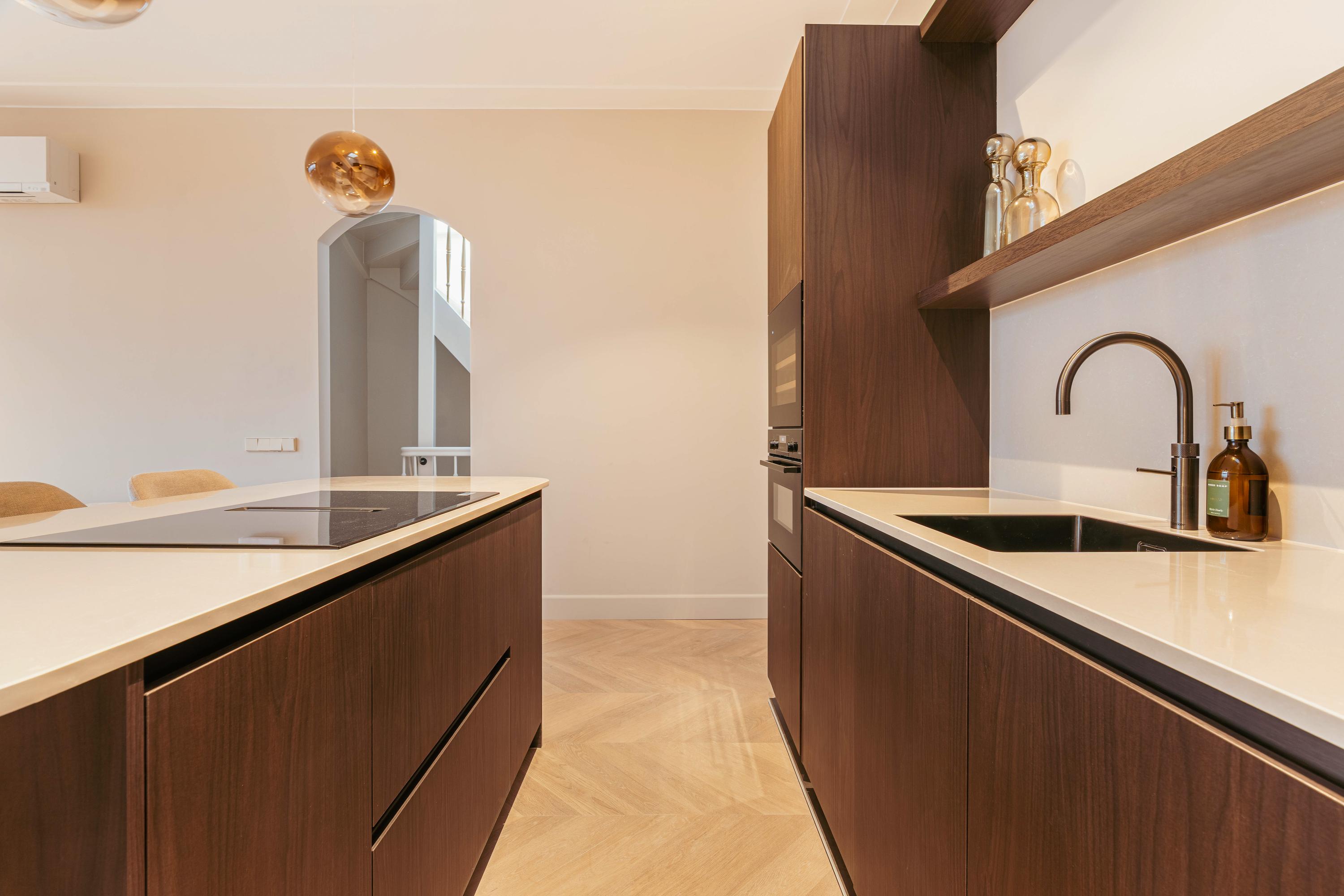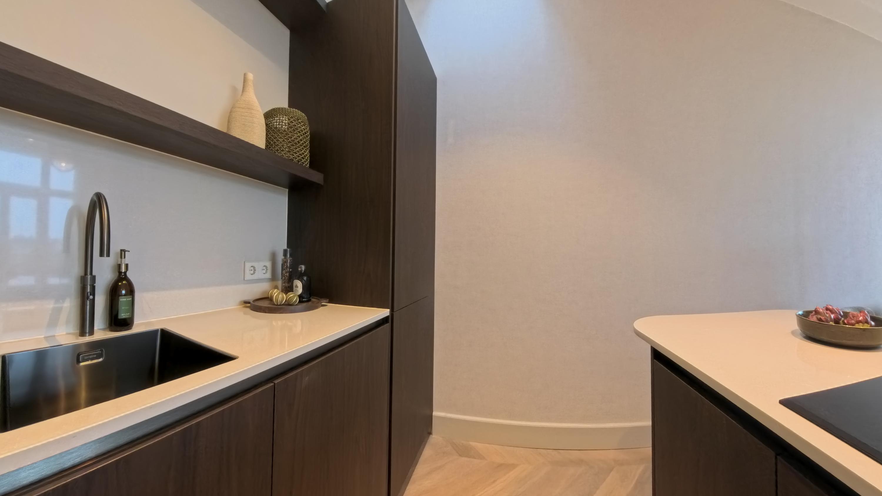 De open keuken met kookeiland en bargedeelte vormt een elegant geheel met de leefruimte en is voorzien van alle moderne gemakken, waaronder een combi-oven, vaatwasser, koel-vriescombinatie, Quooker en een inductiekookplaat met geïntegreerd afzuigsysteem. Aan het kookeiland is plek voor vier tot vijf barkrukken, waardoor u hier met plezier kookt terwijl u uitkijkt over het groen en het water. Een zeldzaam uitzicht in de stad.