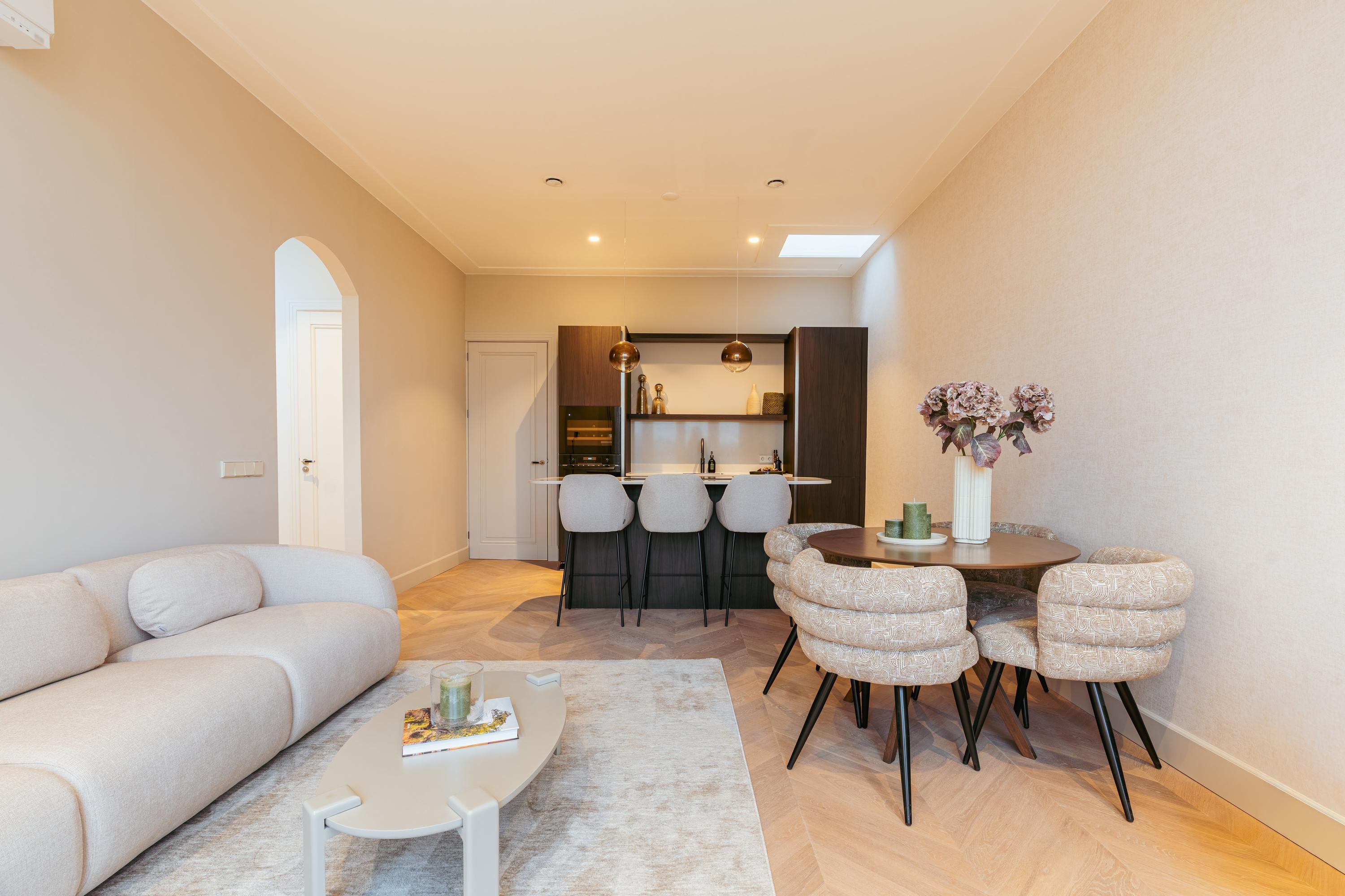 Via het verzorgde, gezamenlijke trappenhuis bereikt u de entree van dit stijlvolle penthouse op de tweede verdieping. Een trap leidt u verder naar de woonverdieping op de derde etage. Bij binnenkomst stapt u vanuit de entree direct het open leefgedeelte binnen. Het appartement is volledig gerenoveerd en hoogwaardig afgewerkt. De uitzonderlijk hoge plafonds versterken het gevoel van ruimte en geven de woning een indrukwekkende, luchtige uitstraling.