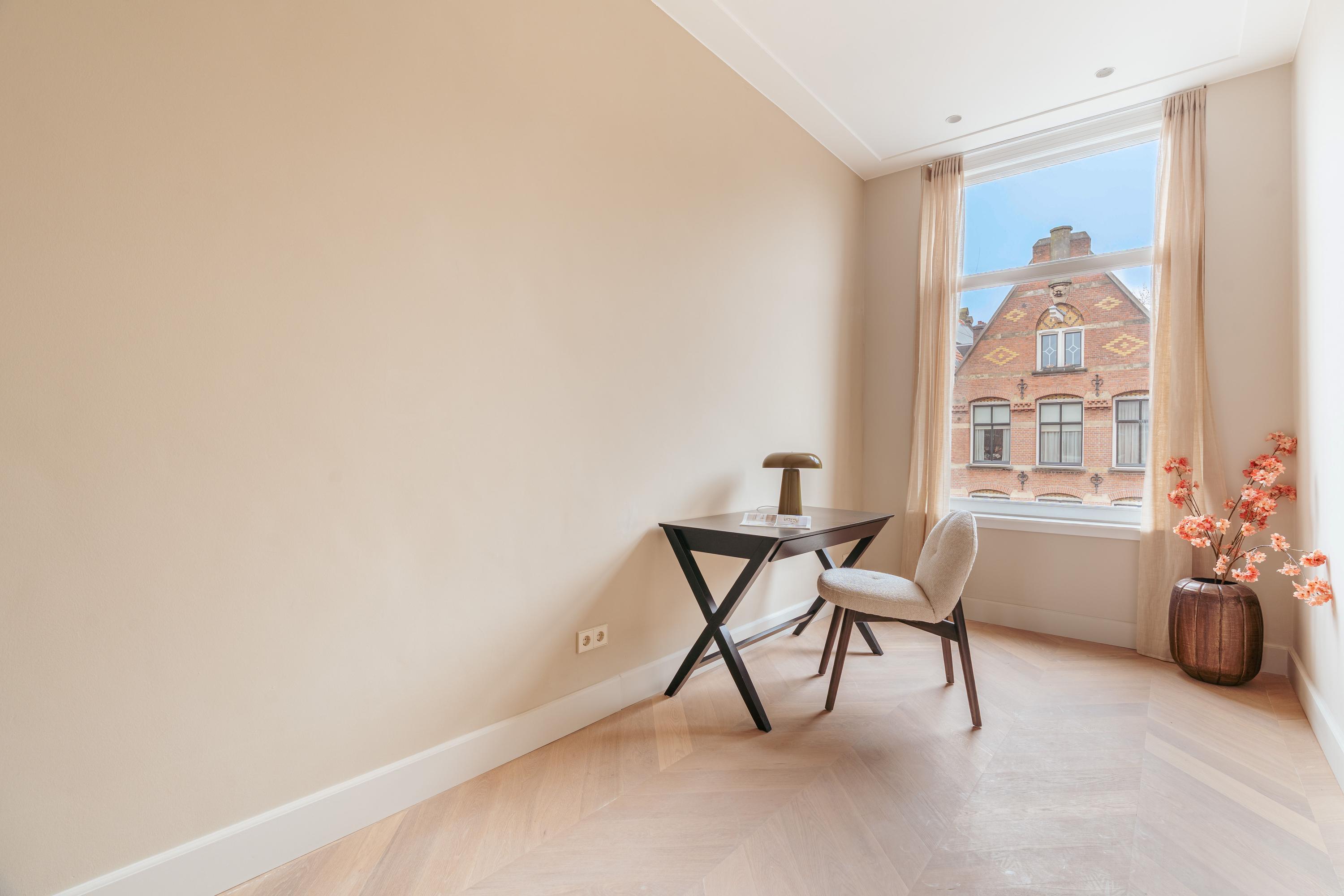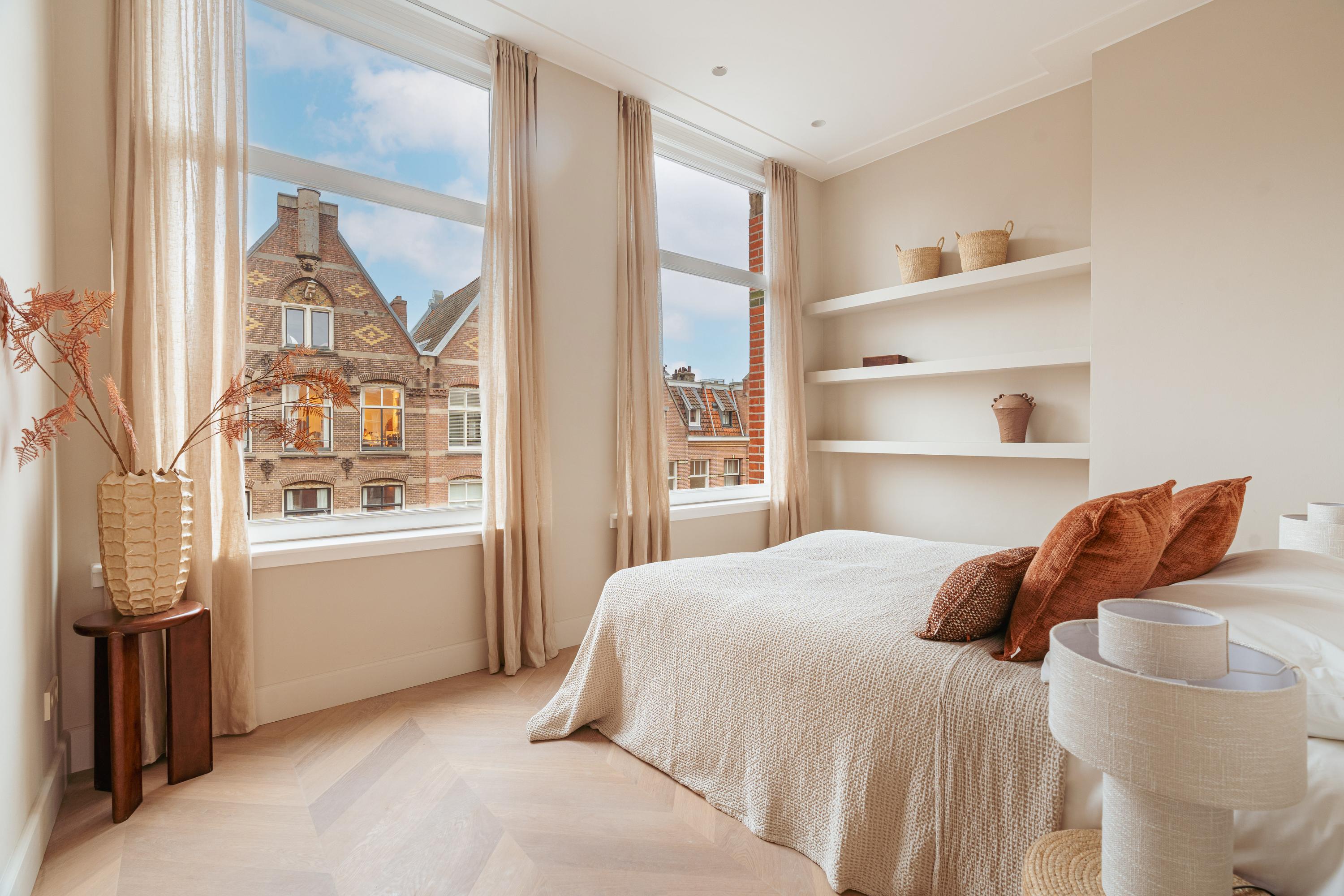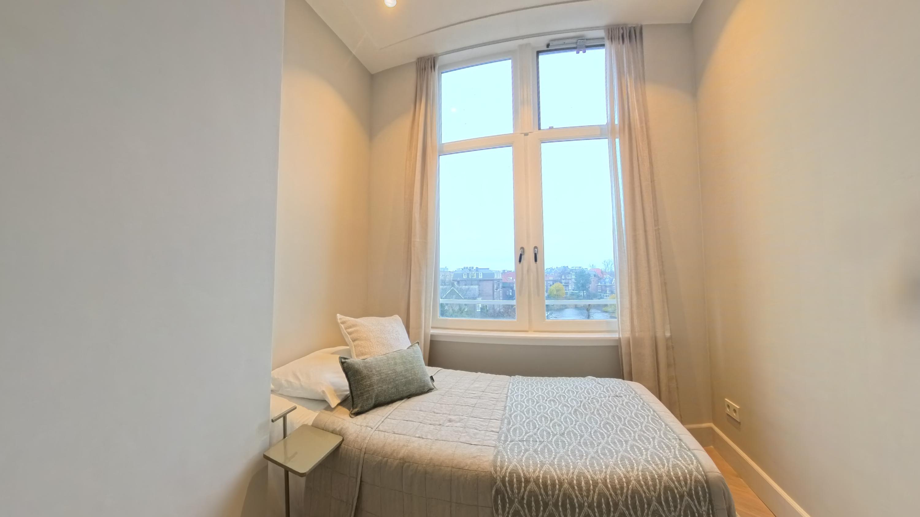 De master bedroom bevindt zich aan de voorzijde van het appartement en is ruim van formaat. Deze slaapkamer grenst aan een tweede (slaap)kamer, die zich ook uitstekend leent als inloopkast of kantoorruimte. De centraal gelegen badkamer, waarin de hoge plafonds prachtig zijn doorgetrokken, is modern uitgevoerd en uitgerust met een ligbad, inloopdouche en een dubbele wastafel met meubel. De derde slaapkamer ligt rustig aan de achterzijde en biedt opnieuw een schitterend uitzicht over de grote vijver. Dankzij de drie slaapkamers is deze woning ideaal voor gezinnen; woont u met z’n tweeën, dan zijn de extra kamers perfect als werkruimte. Door de hele woning ligt een eikenhouten vloer in Hongaarse punt, die warmte en elegantie toevoegt.