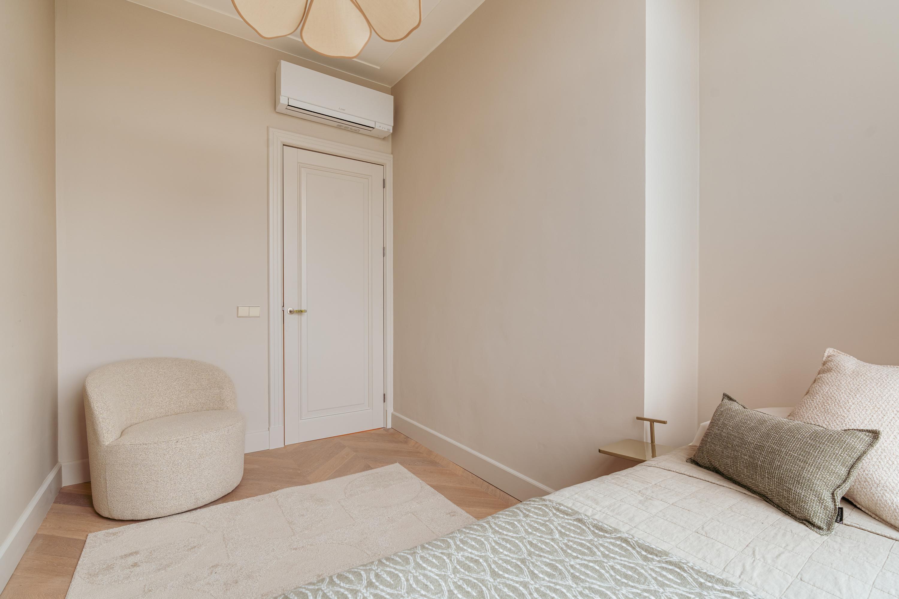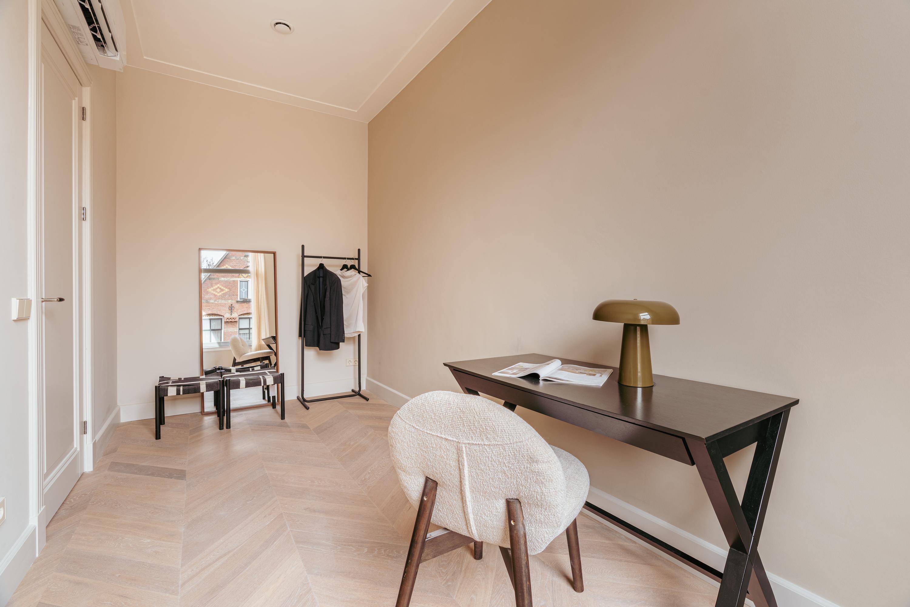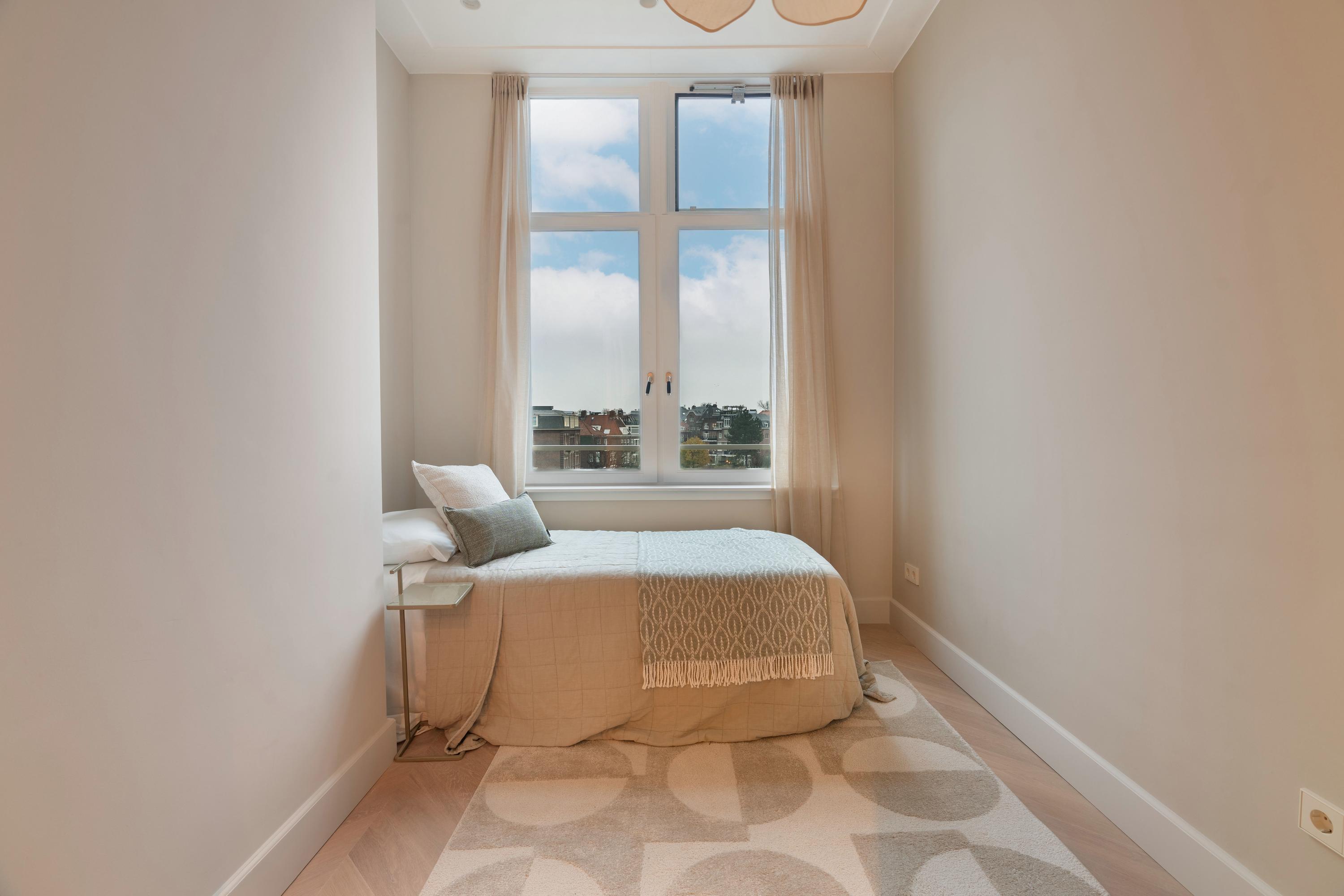De master bedroom bevindt zich aan de voorzijde van het appartement en is ruim van formaat. Deze slaapkamer grenst aan een tweede (slaap)kamer, die zich ook uitstekend leent als inloopkast of kantoorruimte. De centraal gelegen badkamer, waarin de hoge plafonds prachtig zijn doorgetrokken, is modern uitgevoerd en uitgerust met een ligbad, inloopdouche en een dubbele wastafel met meubel. De derde slaapkamer ligt rustig aan de achterzijde en biedt opnieuw een schitterend uitzicht over de grote vijver. Dankzij de drie slaapkamers is deze woning ideaal voor gezinnen; woont u met z’n tweeën, dan zijn de extra kamers perfect als werkruimte. Door de hele woning ligt een eikenhouten vloer in Hongaarse punt, die warmte en elegantie toevoegt.
