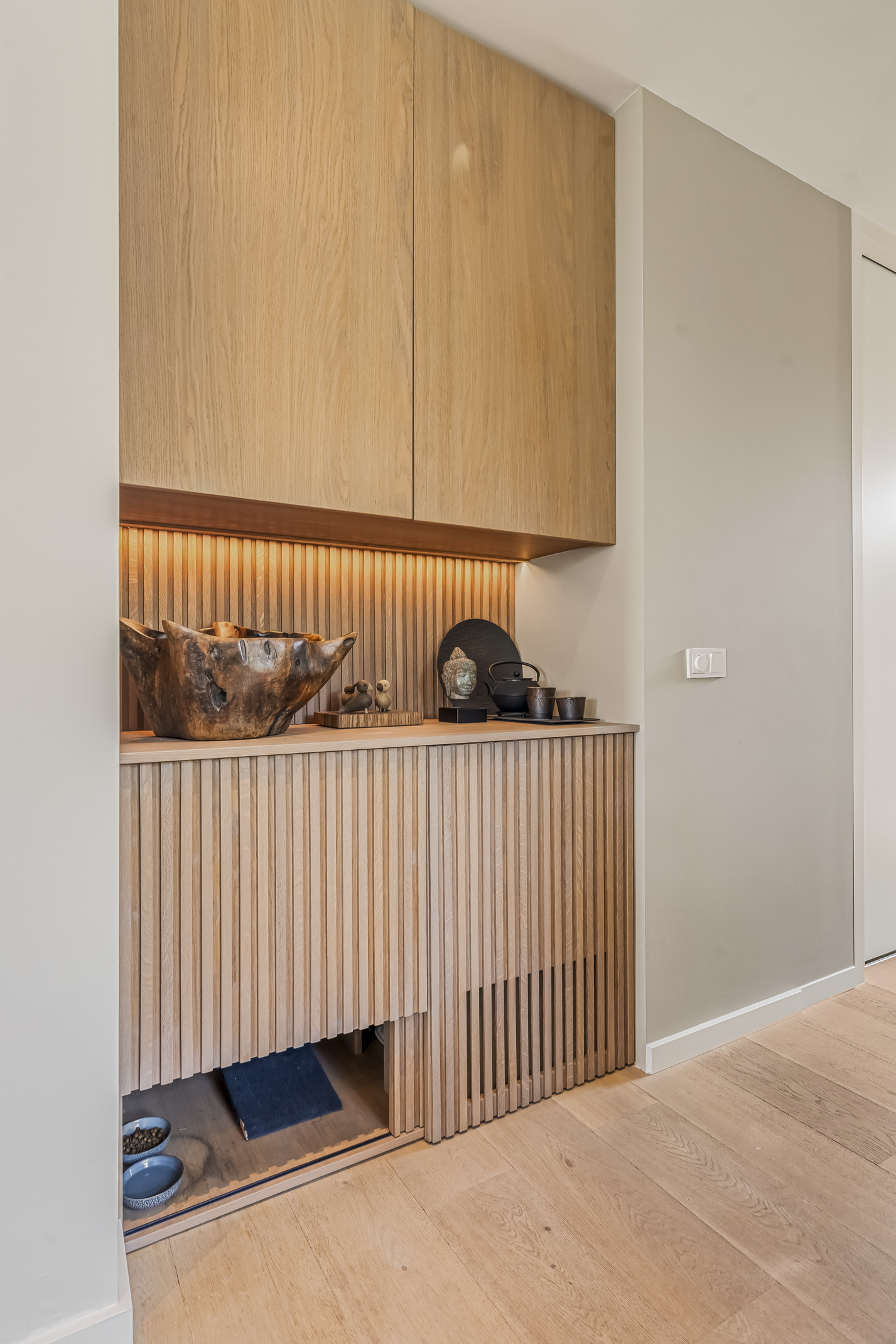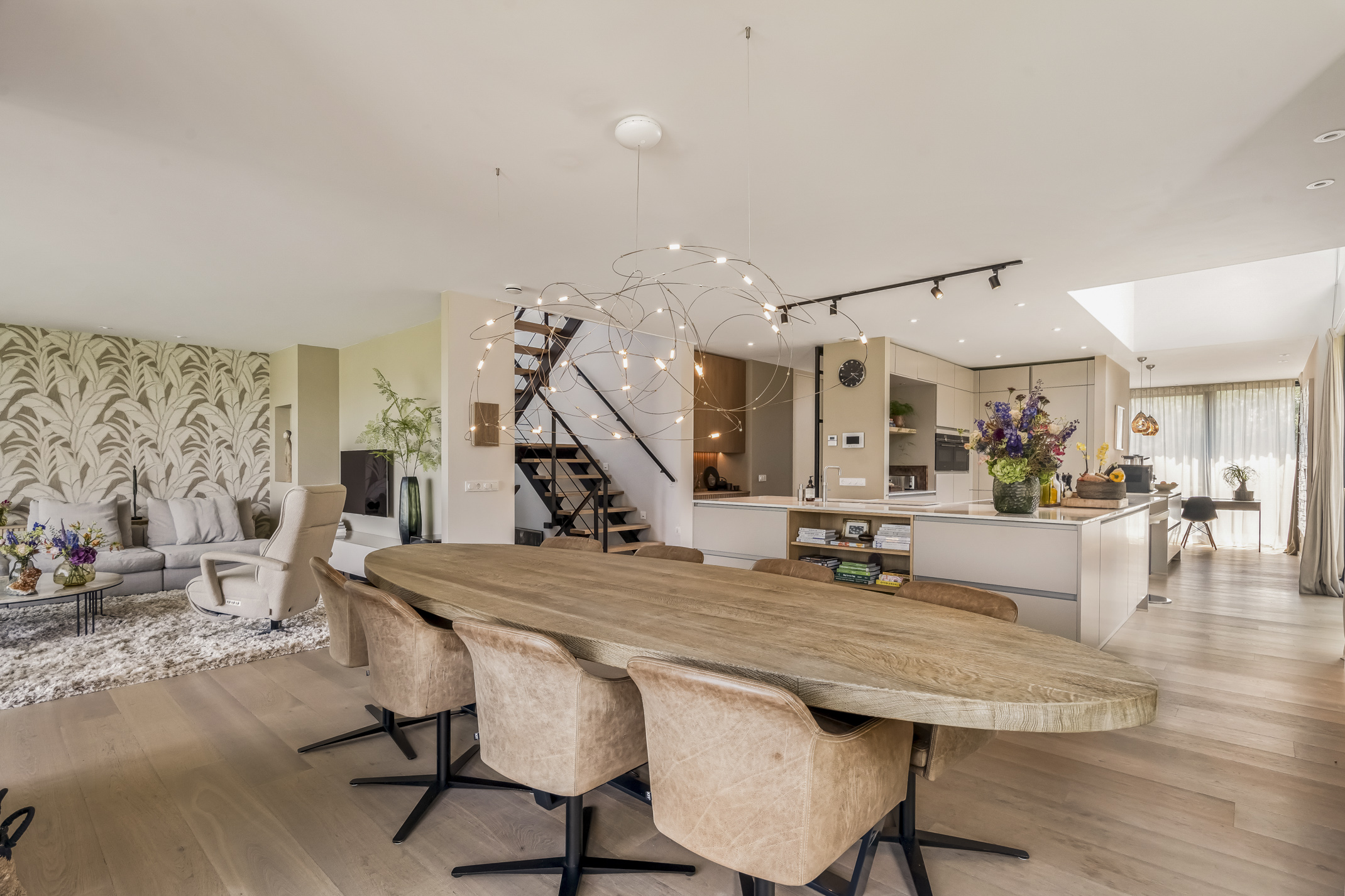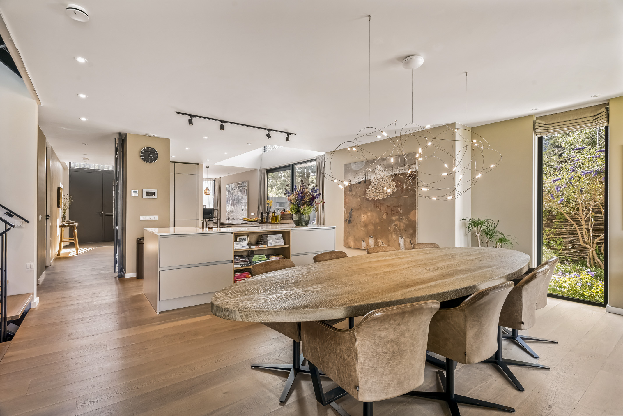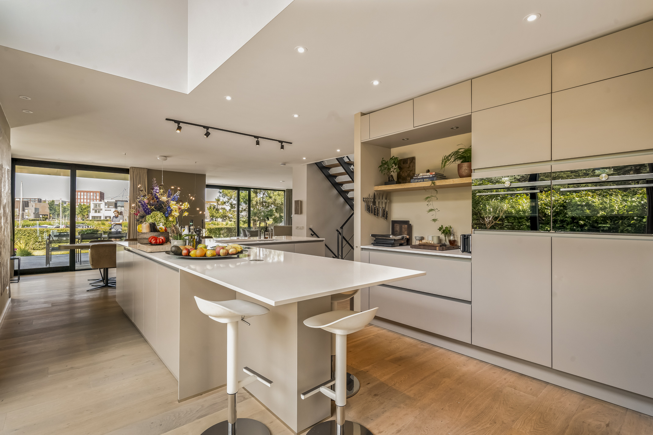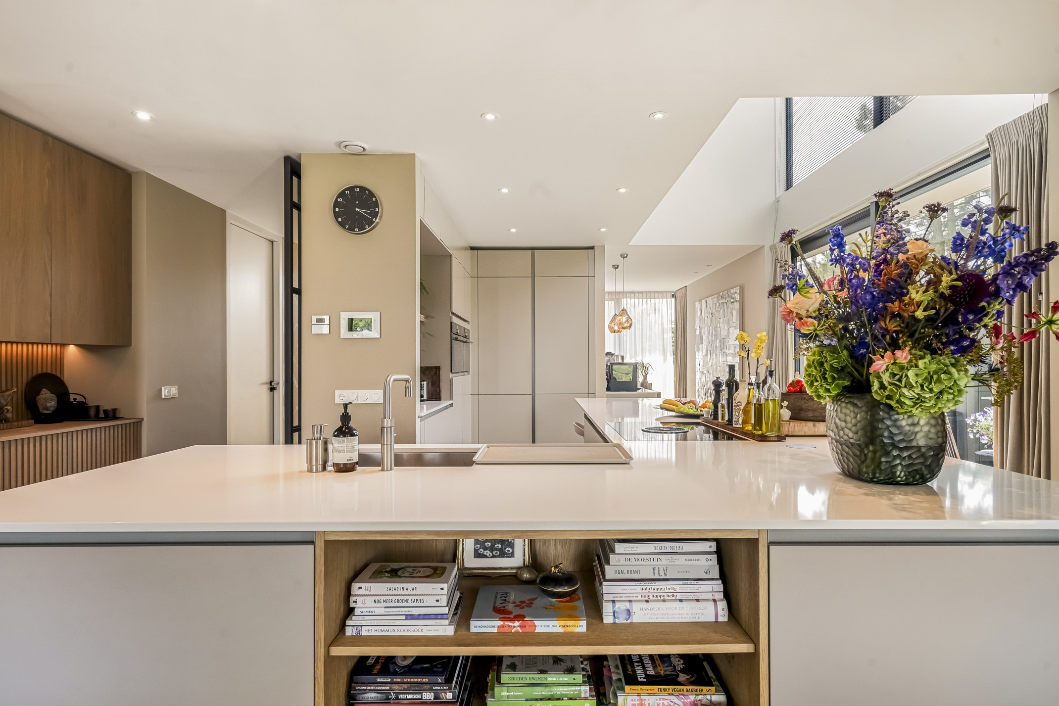 De luxe keuken is een droom voor elke chef-kok, uitgerust met alle moderne apparaten zoals een Quooker, een Bora inductiekookplaat met geïntegreerd afzuigsysteem vaatwasser, extra grote koelkast en vriezer, oven met stoomfunctie en een combi-oven. De koffiebar scheidt de keuken van de study. Voor uw geliefde viervoeter is er een buitenkennel bereikbaar vanuit binnen.