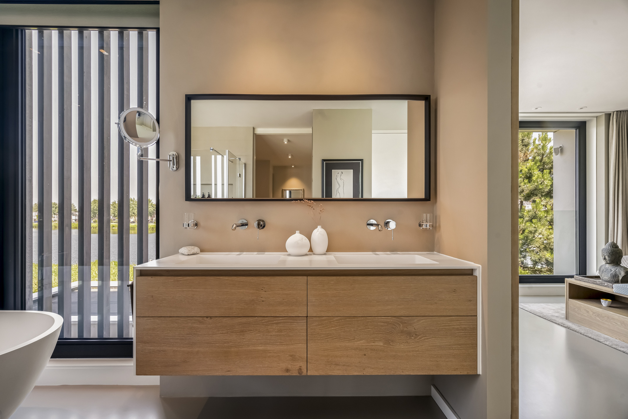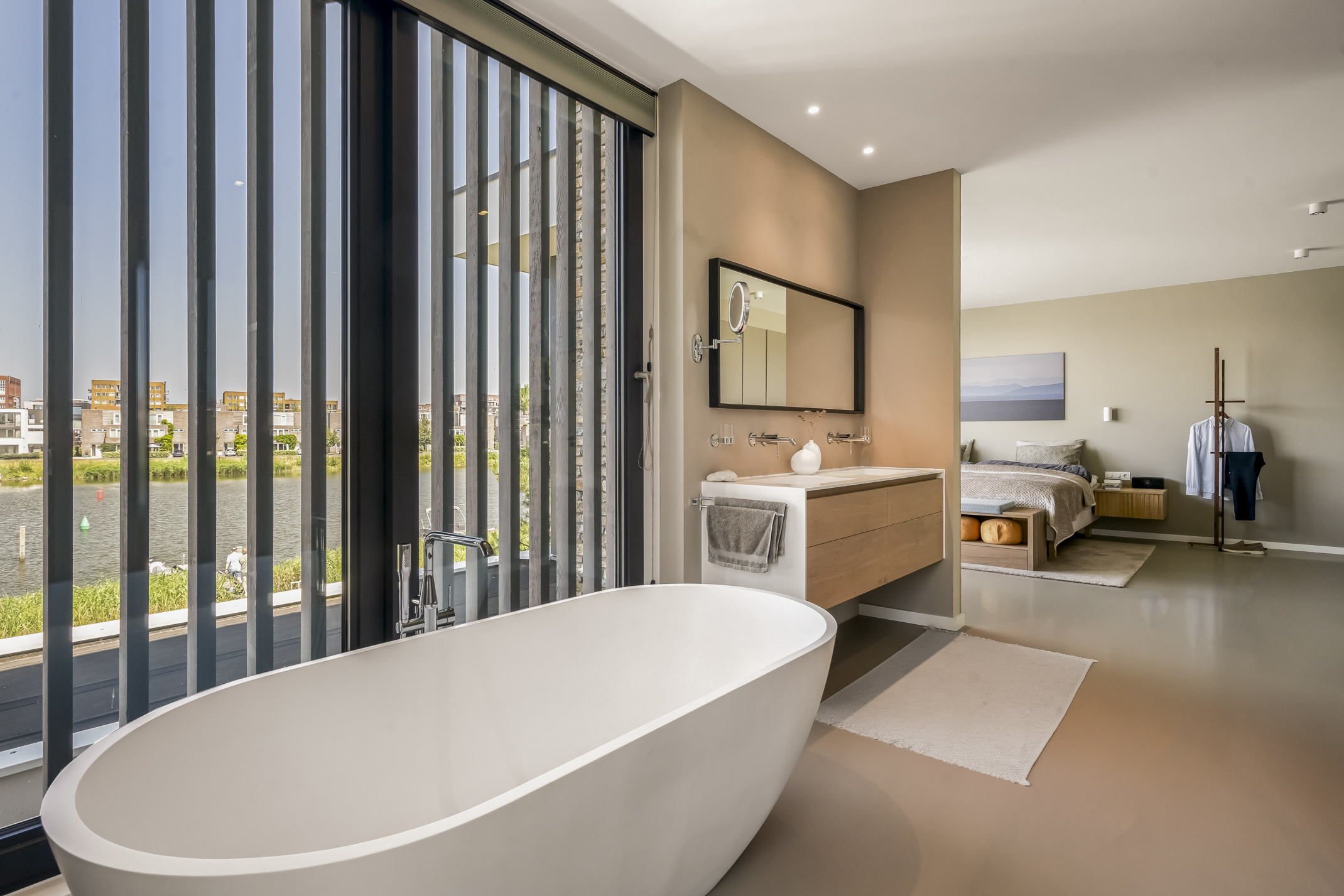 Vanaf de overloop zijn alle vertrekken bereikbaar. Deze etage is voorzien van een moderne gietvloer. De master suite aan de achterzijde biedt een adembenemend uitzicht over het water, een kastenkamer en een badkamer en suite. De badkamer is voorzien van een douche, een Aquaclean Geberit toilet, dubbel wastafelmeubel en een vrijstaand ligbad met hetzelfde uitzicht. Vanuit de badkamer is er direct toegang tot de royale kastenkamer.