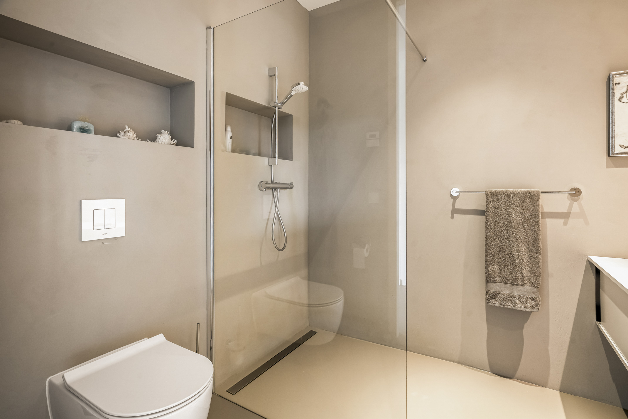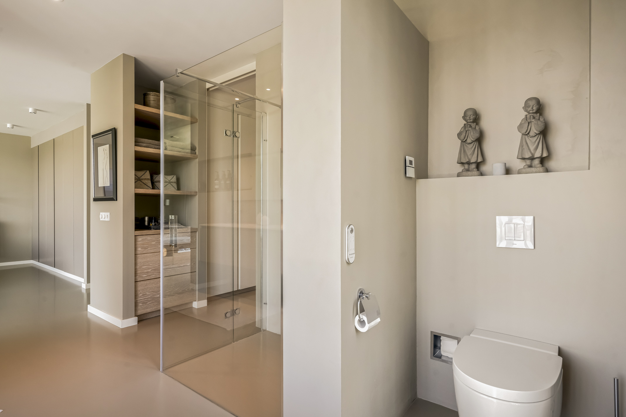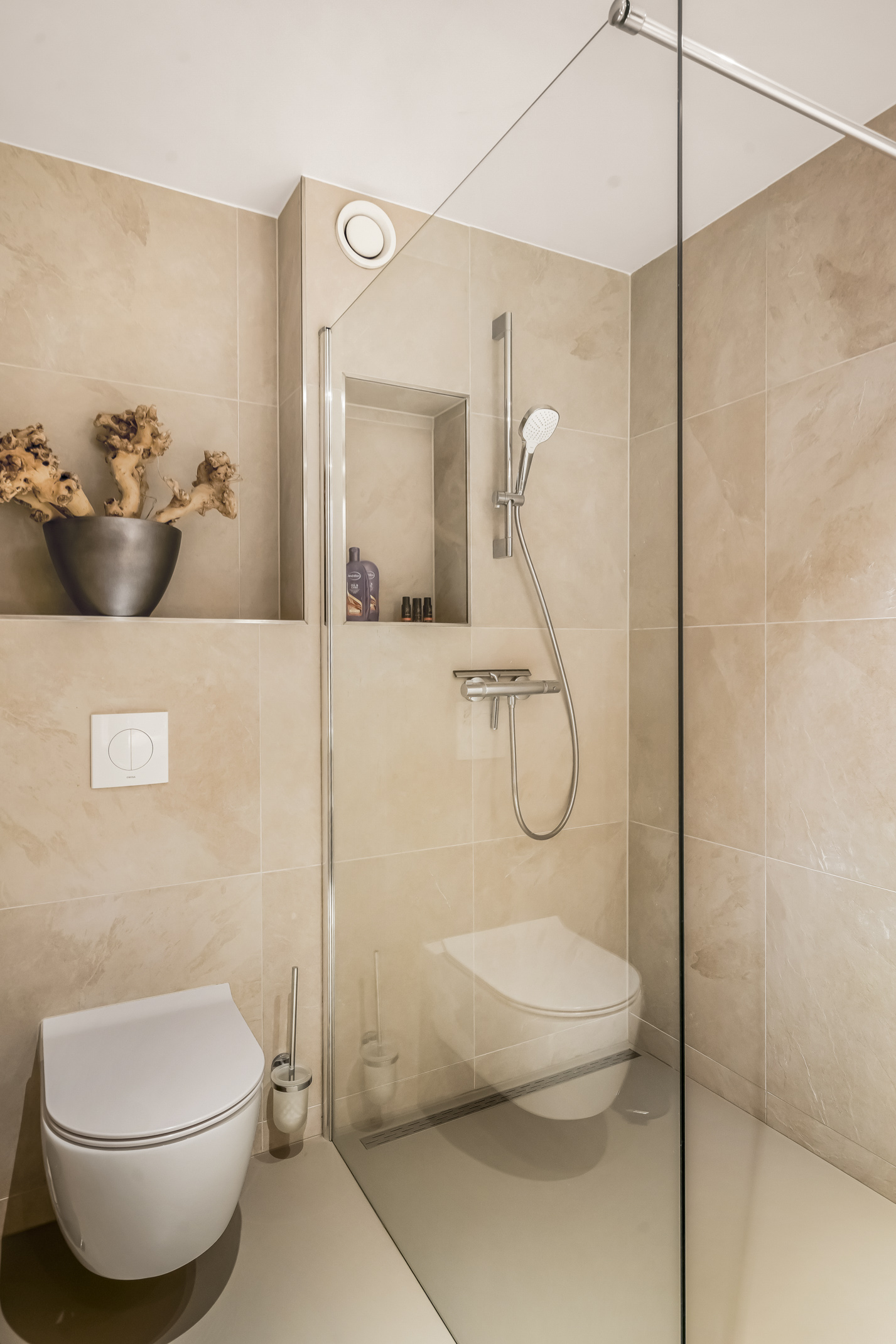 De tussengelegen slaapkamer is momenteel ingericht als wasruimte maar uiteraard ook zeer geschikt als slaapkamer. De tweede badkamer op deze etage is voorzien van een inloopdouche, een toilet en wastafelmeubel.