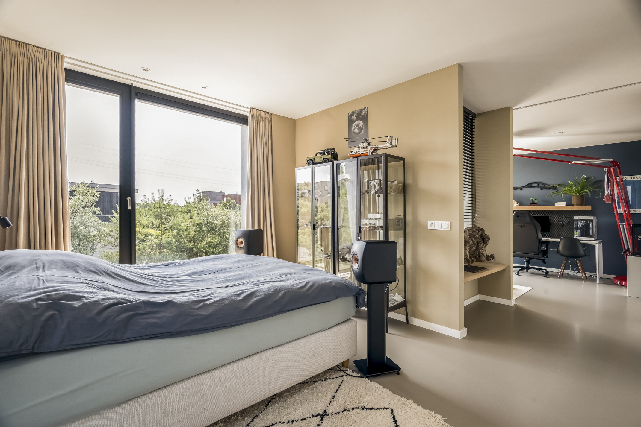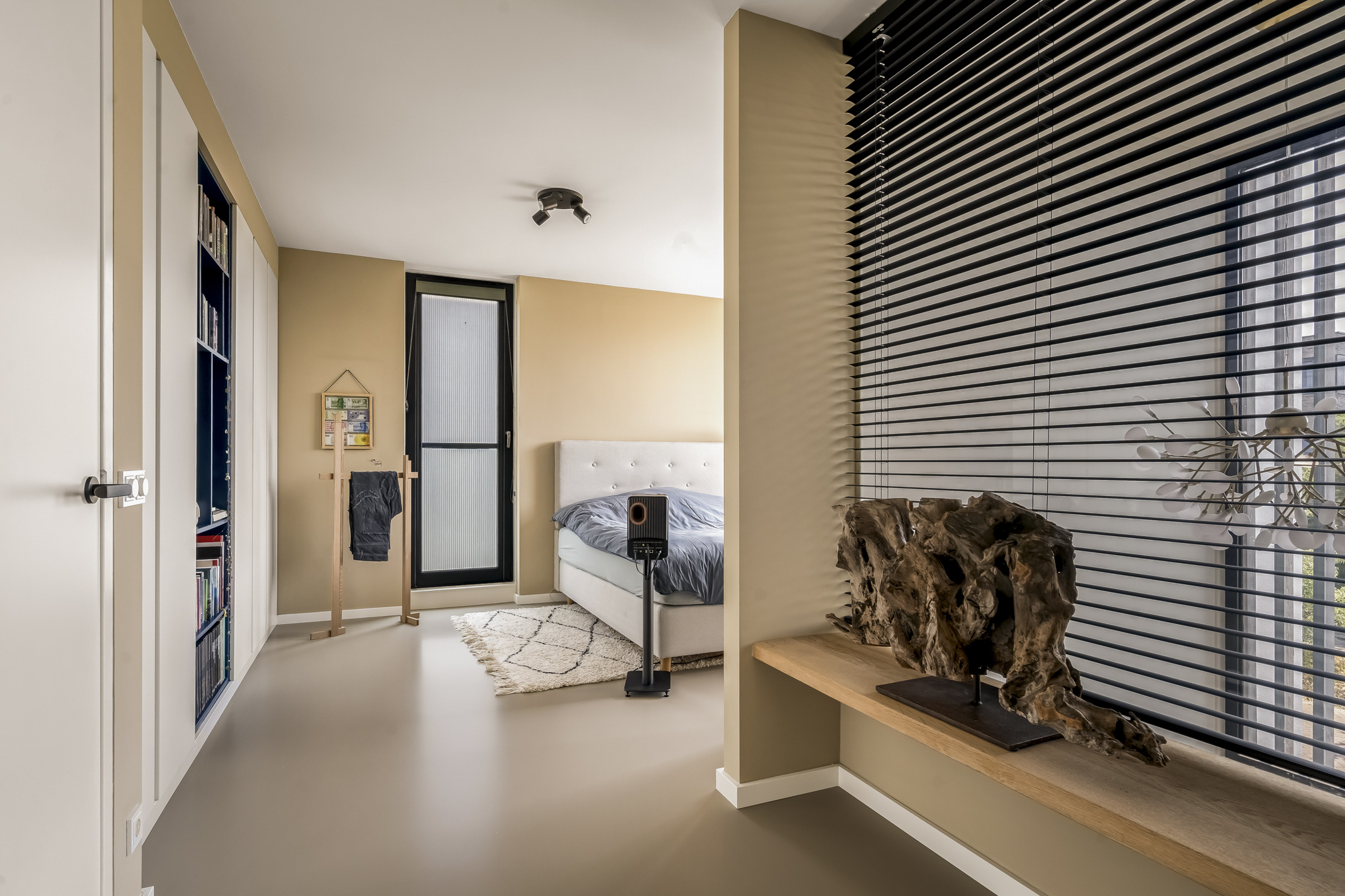 De riante slaapkamer aan de voorzijde kan eenvoudig in twee slaapkamers worden verdeeld en biedt een mooie doorkijk naar de entree. Deze kamer is voorzien van elektrische screens.