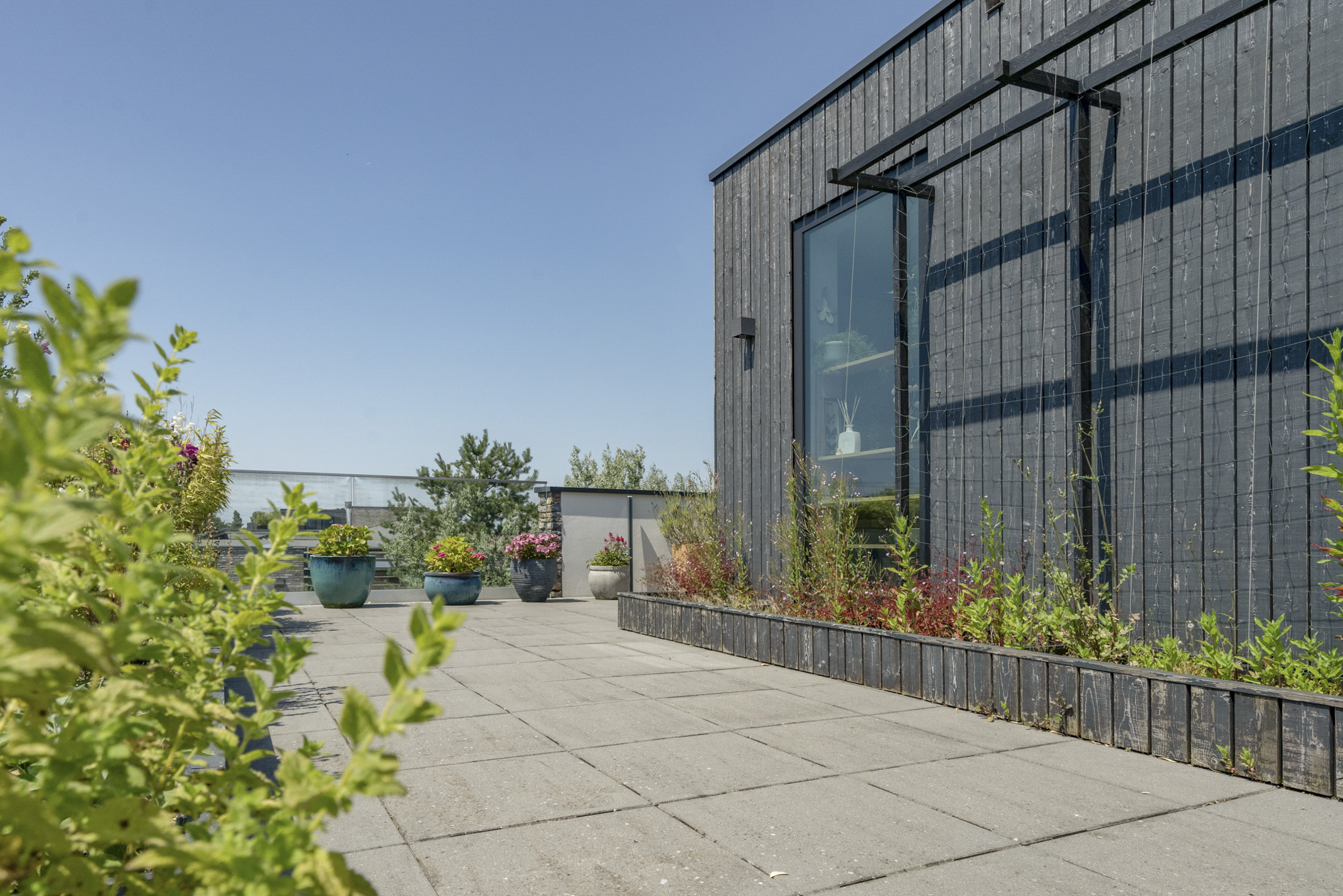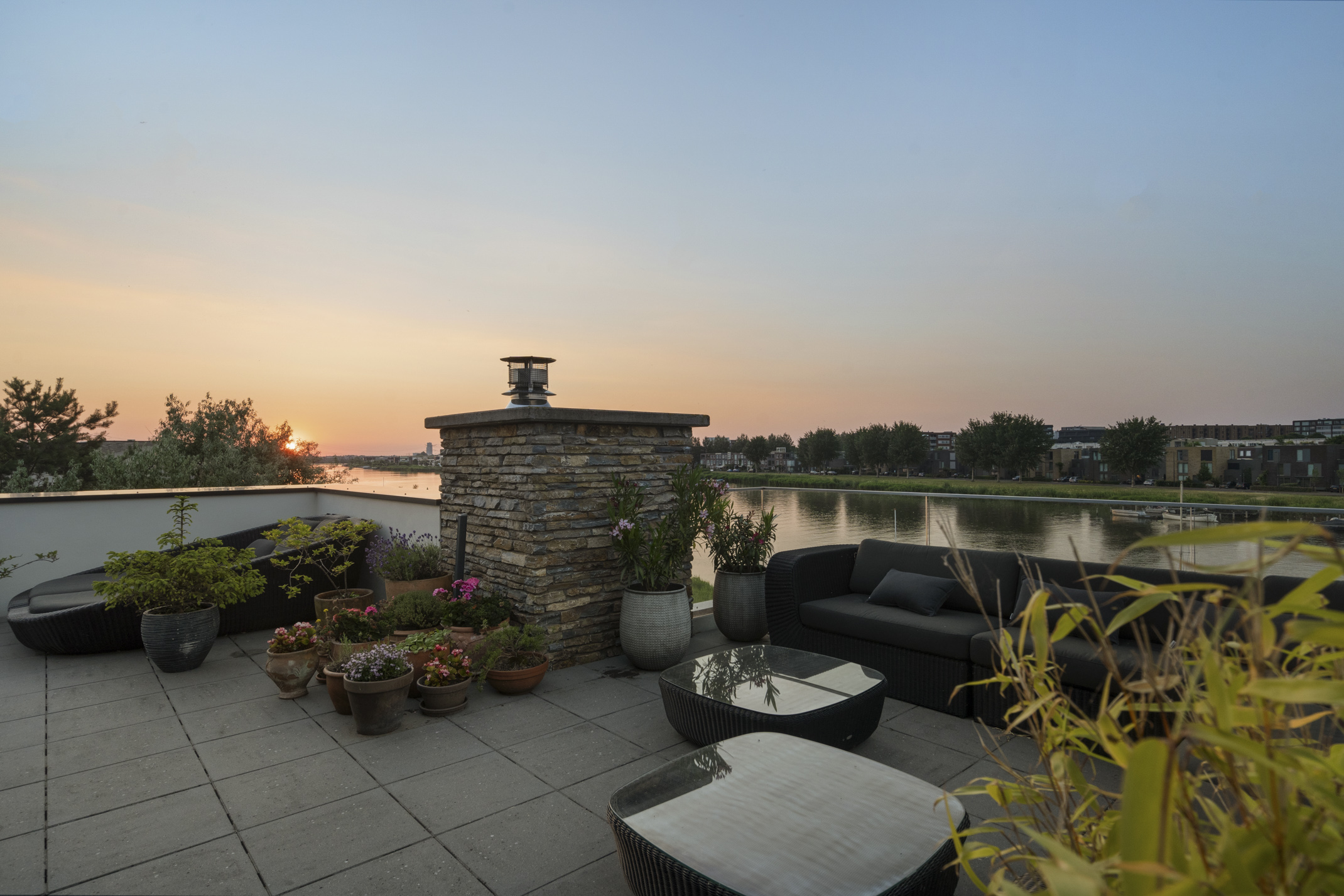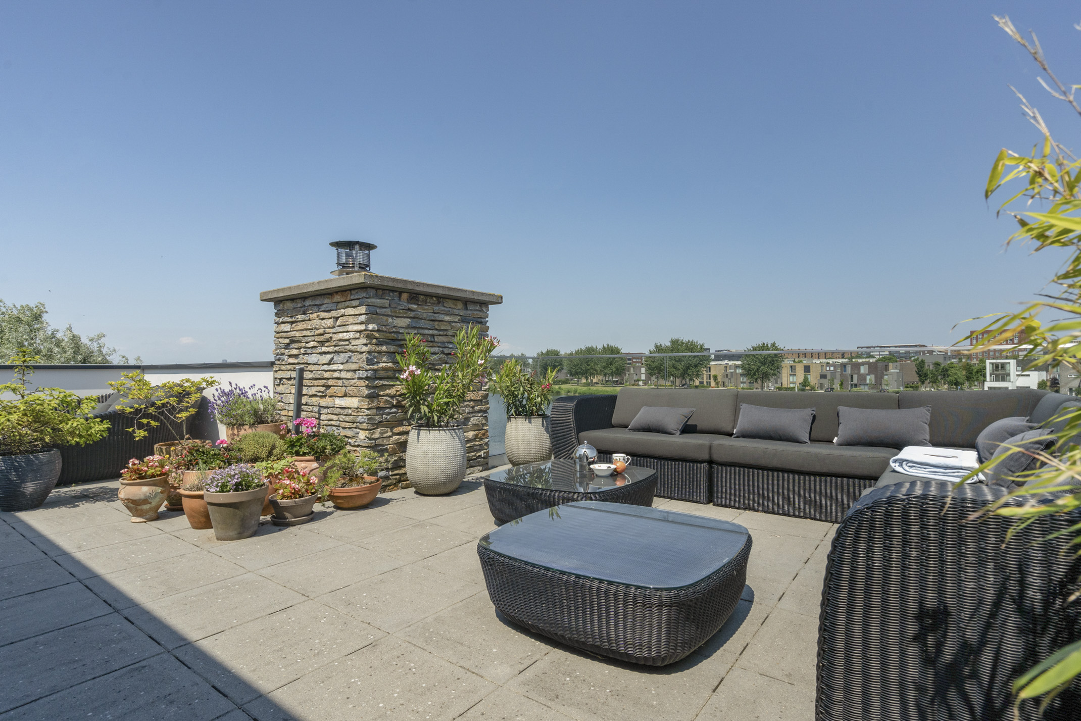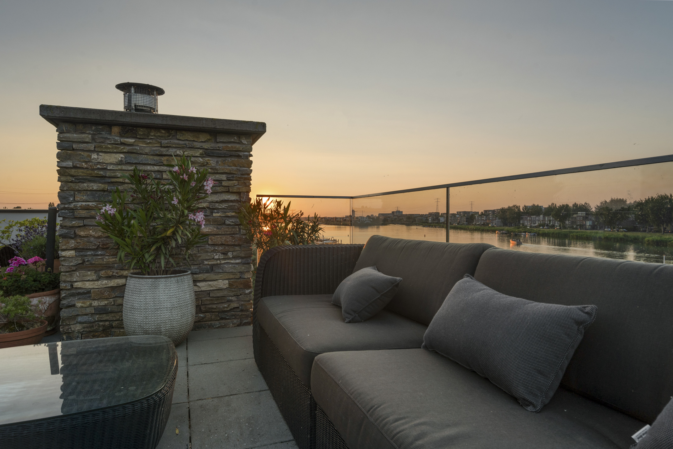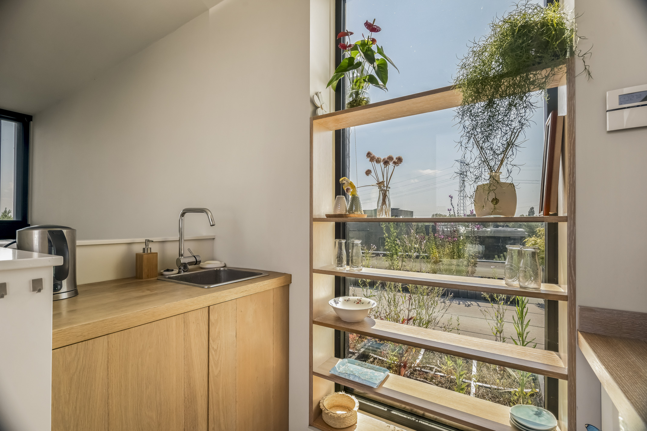 De tweede etage biedt toegang tot het zonnige dakterras met ongeëvenaarde privacy. Op de overloop is een kitchenette geplaatst met een koelkast en gootsteen.