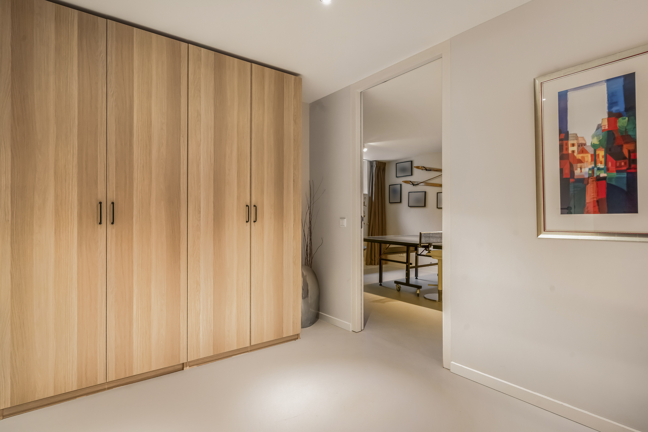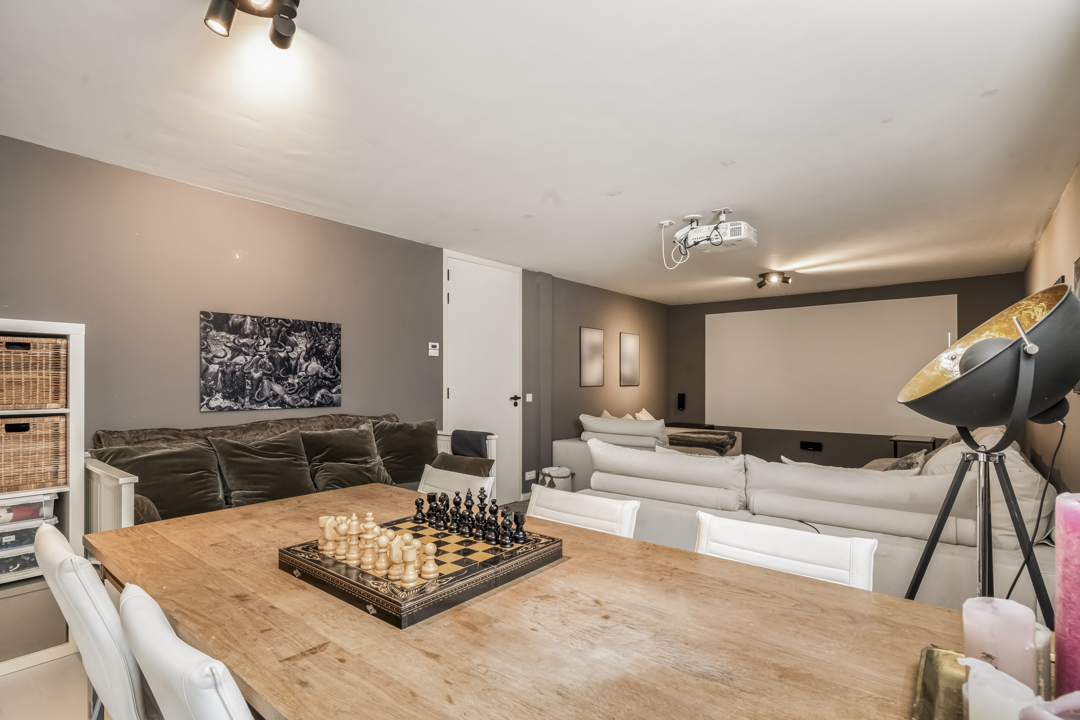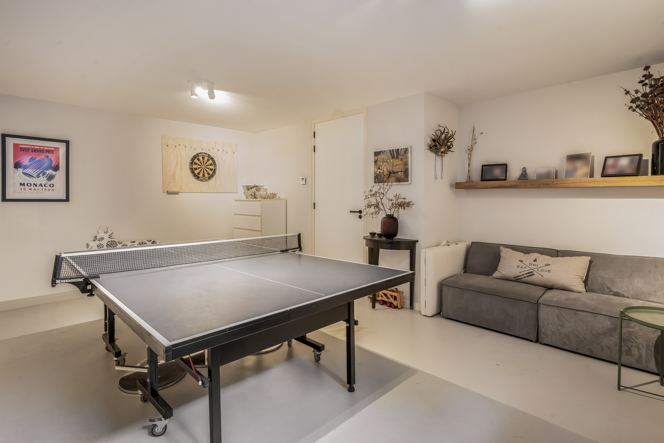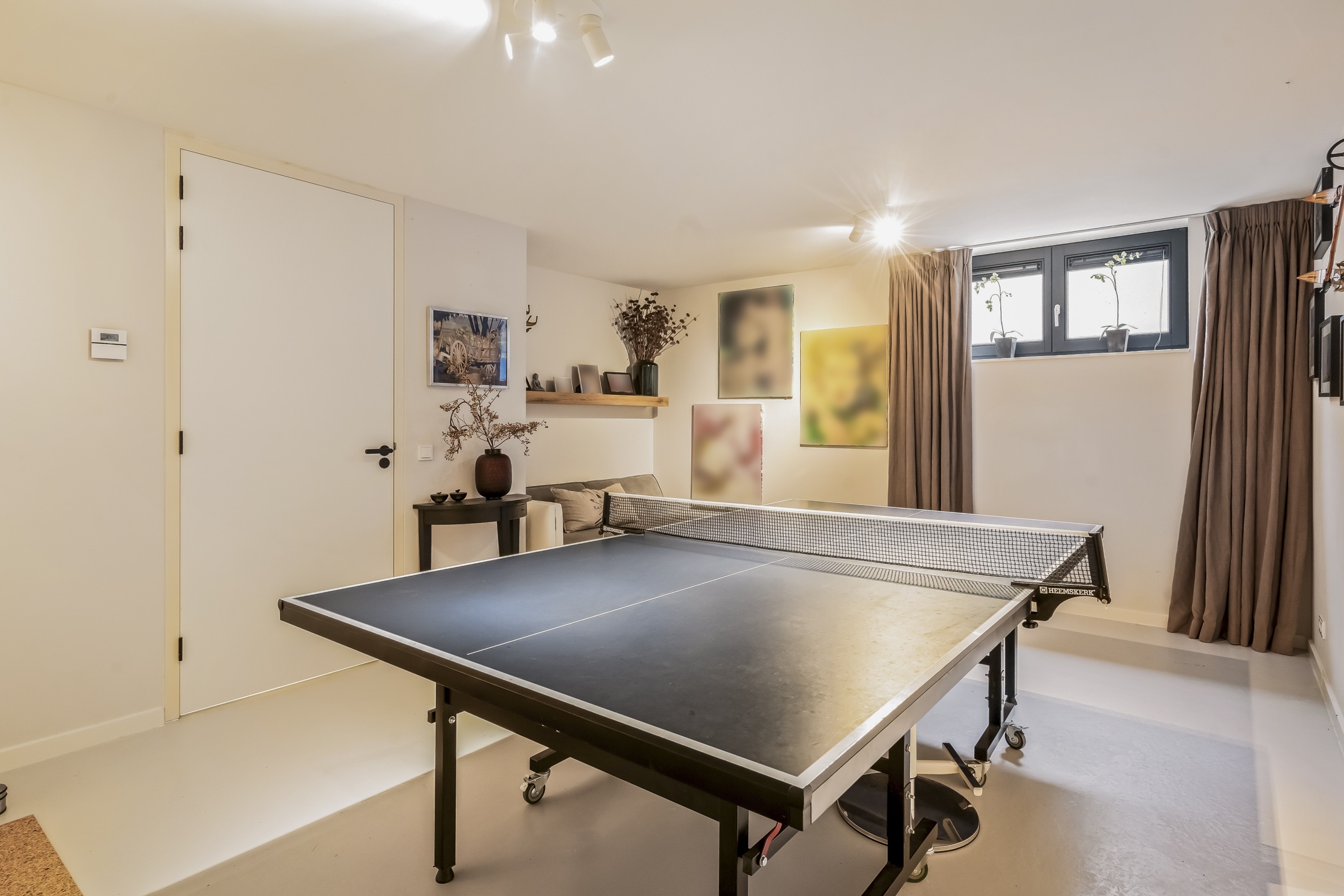 Op deze volwaardige etage met daglicht bevinden zich een homecinema, gastenkamer, kamer met tafeltennistafel, de technische ruimte, bergruimte en de derde badkamer. De badkamer is voorzien van een toilet, een wastafel en een inloopdouche.