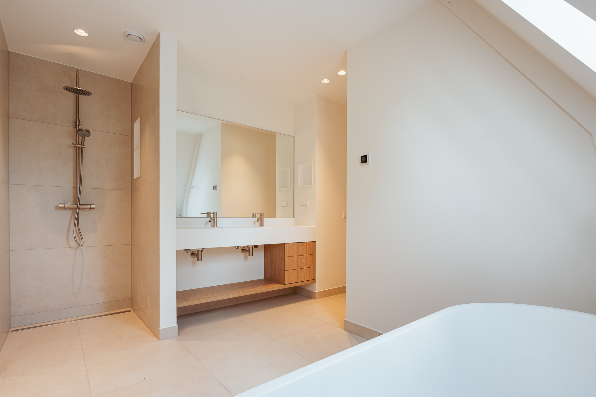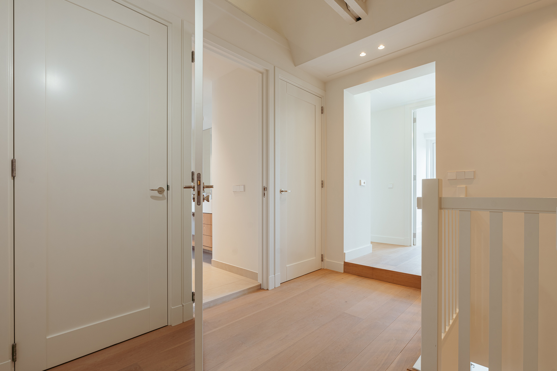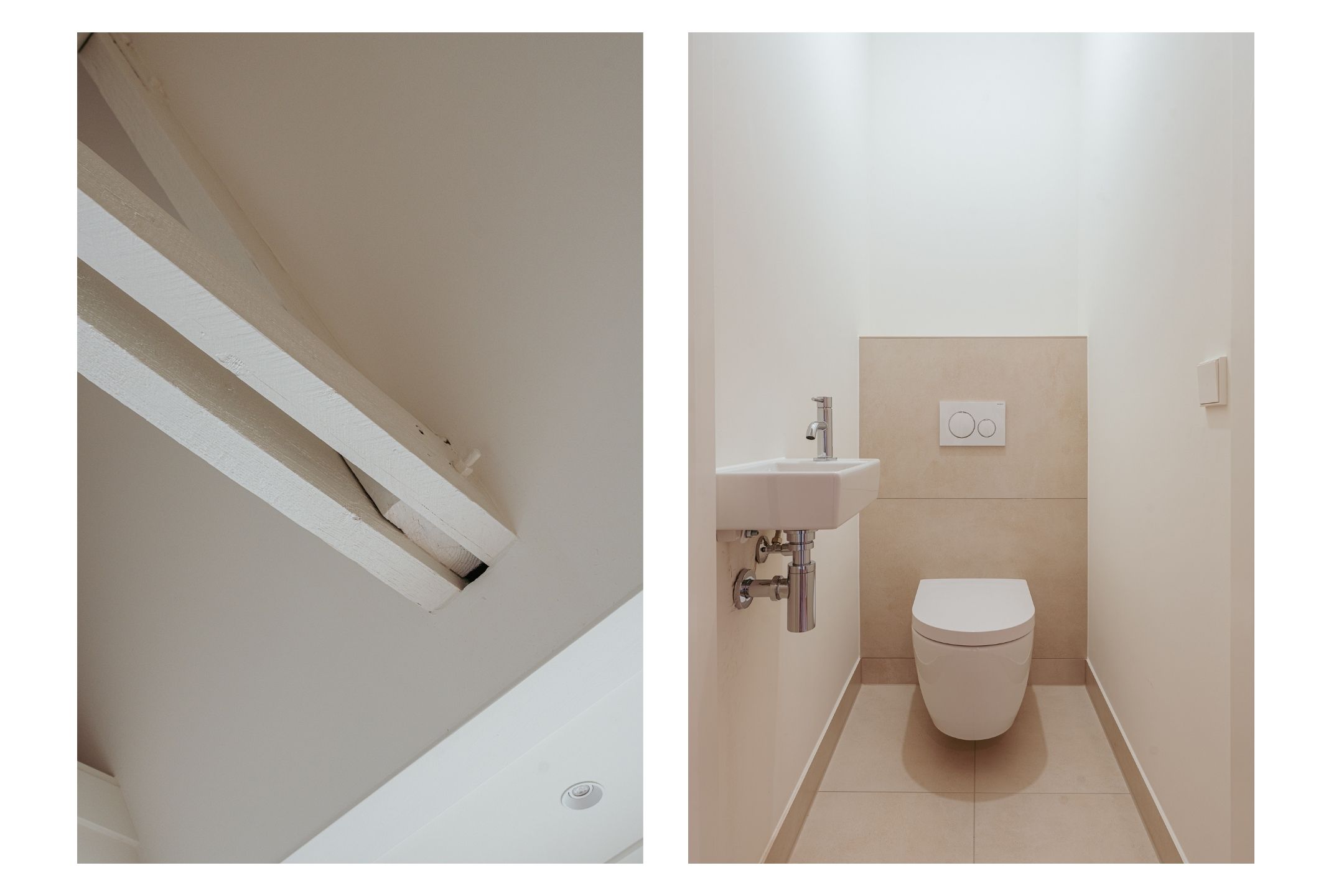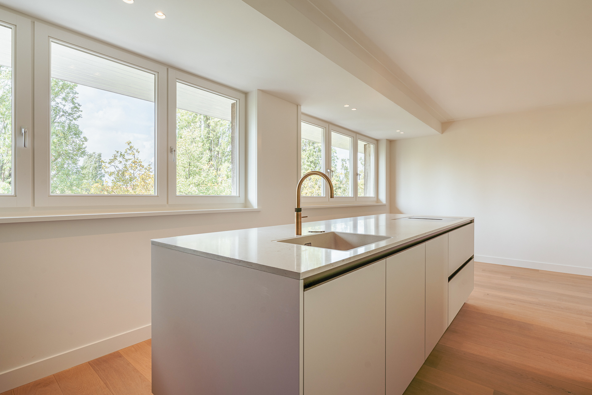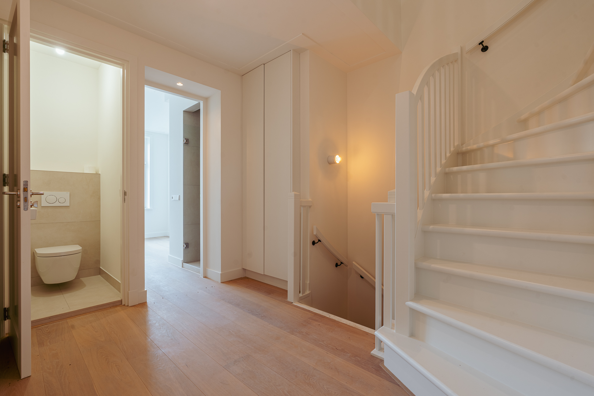 De open keuken is een echte eyecatcher en is voorzien van hoogwaardige inbouwapparatuur: een inductiekookplaat met geïntegreerde afzuiging, vaatwasser, combi-oven en Quooker kraan. De combinatie van strakke, greeploze kasten en warme houtaccenten geeft deze verdieping een moderne, maar sfeervolle uitstraling. Vanuit de woonkamer heeft u toegang tot een zonnig balkon gelegen op het zuidoosten, ideaal voor een kop koffie of een borrel in de middagzon.