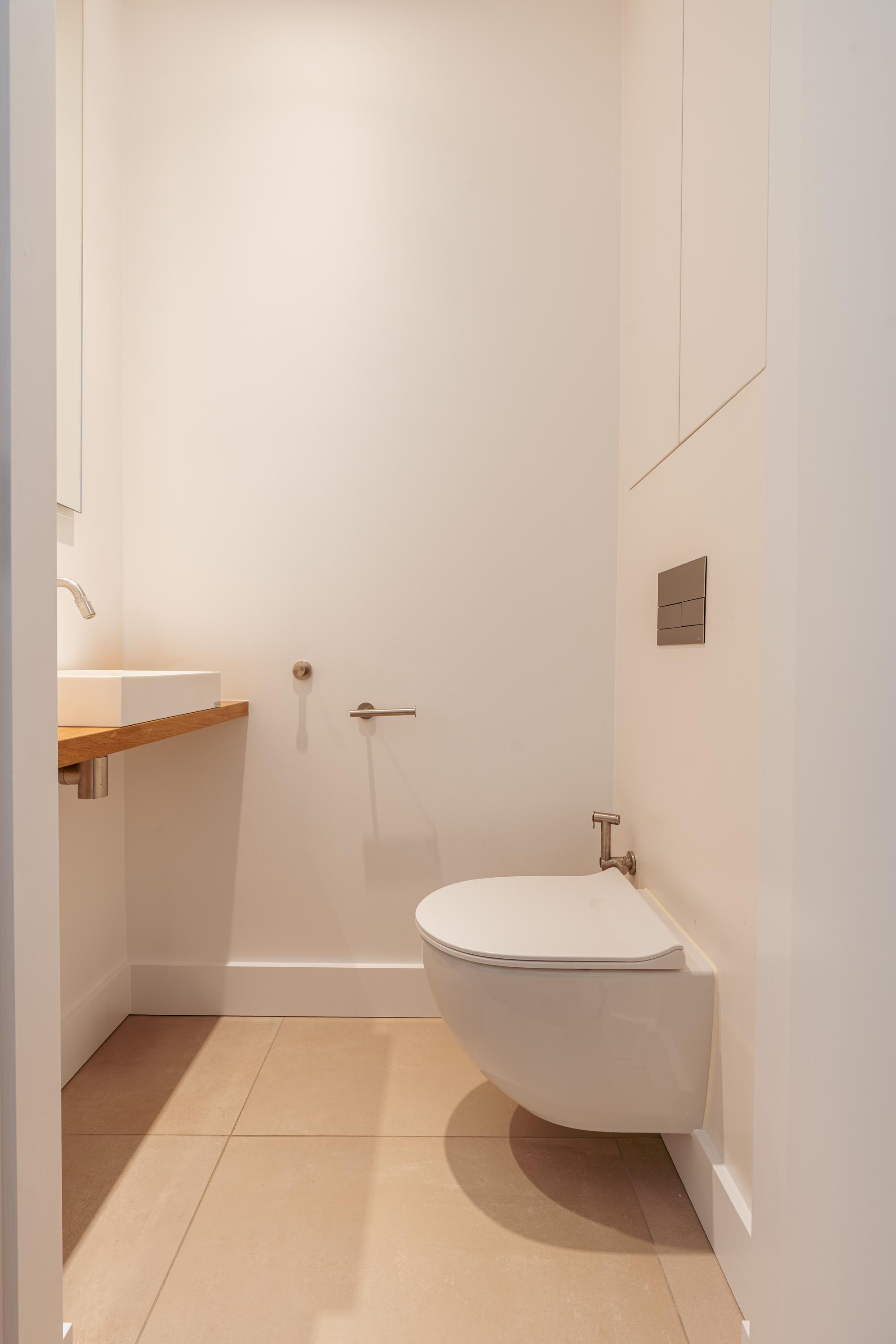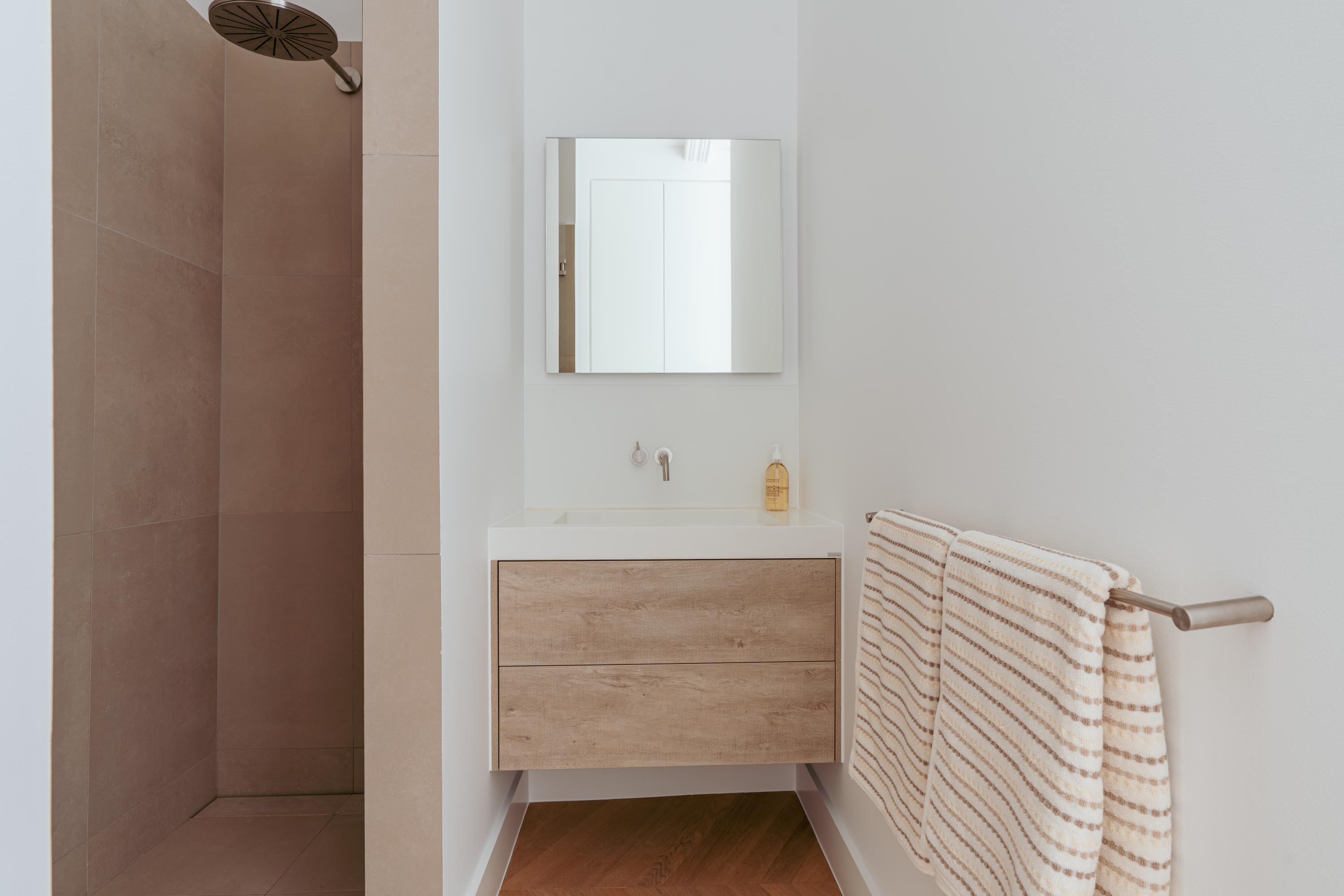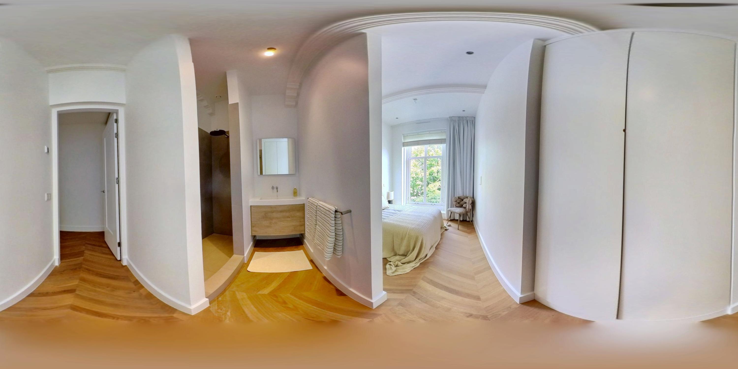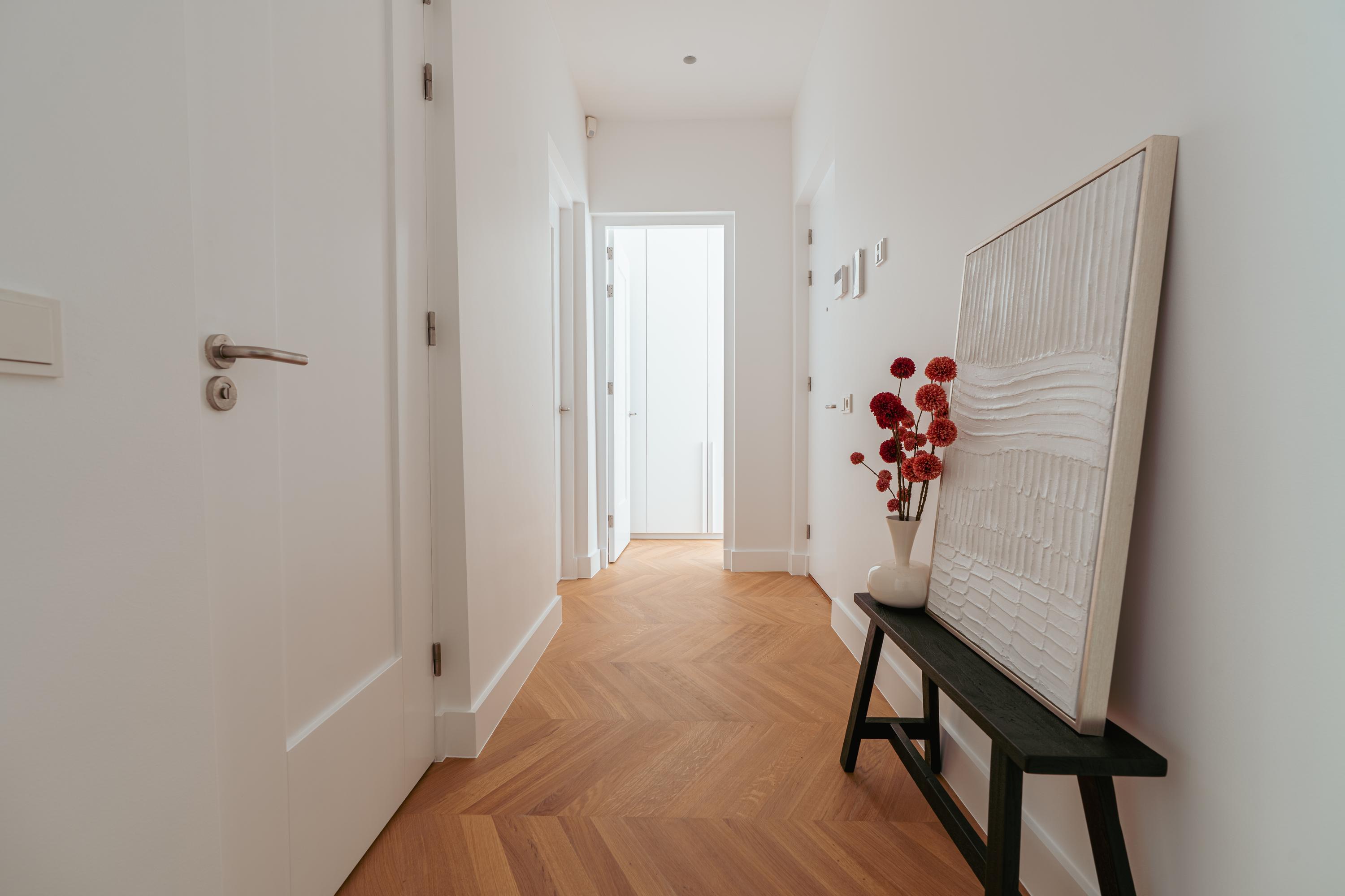 Aan weerszijden van de hal bevinden zich de twee goed bemeten slaapkamers. De master bedroom beschikt over maatwerk kastenwanden en een eigen badkamer en-suite met inloopdouche en dubbele wastafel met meubel. De tweede slaapkamer beschikt eveneens over een inbouwkast en een badkamer en-suite met inloopdouche en wastafelmeubel. Tot slot is er een separaat toilet met fonteintje en een praktische berging met aansluitingen voor wasmachine en droger.