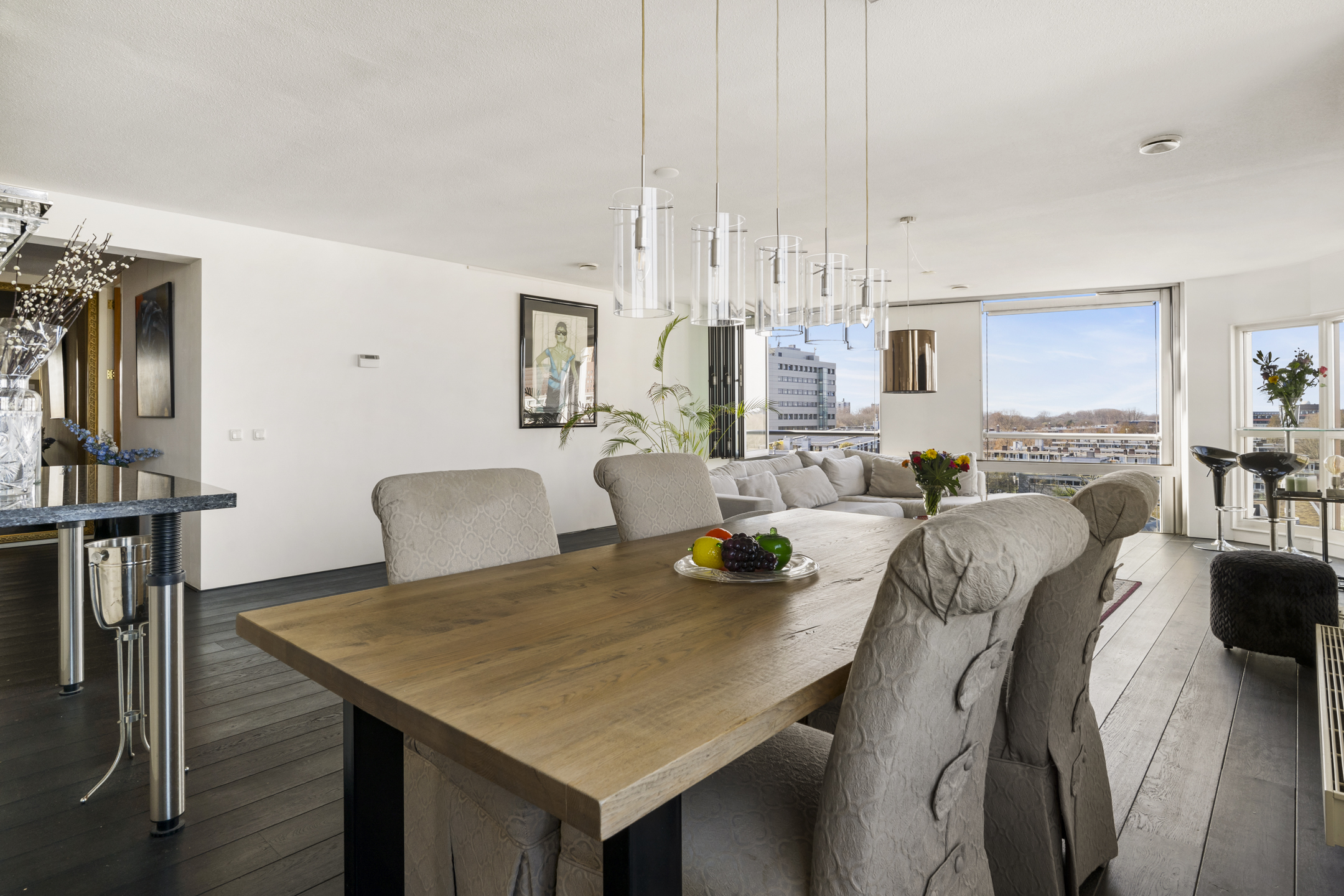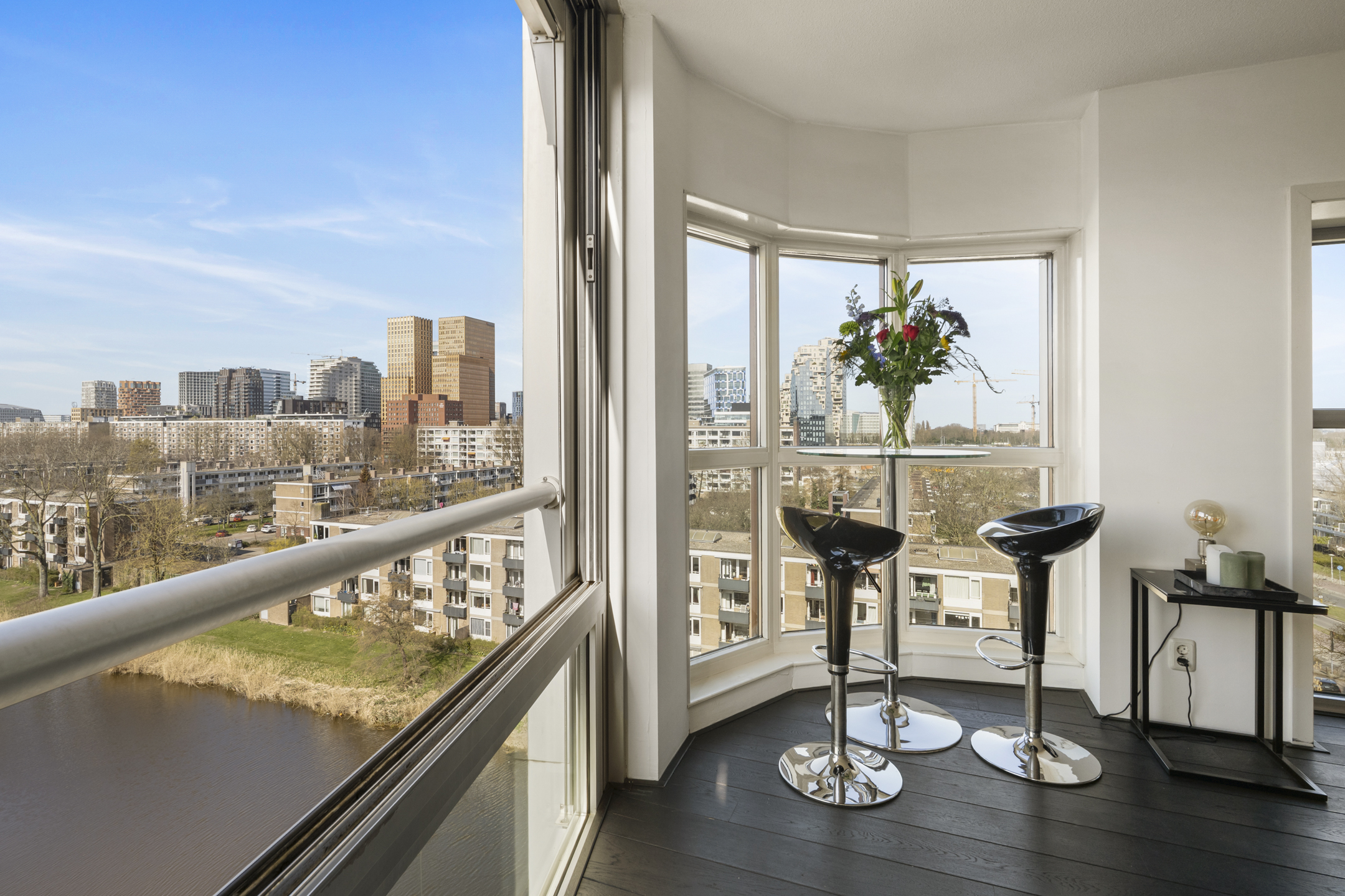 Door de ligging en de vele ramen aan zowel de zuidwest als aan de noordkant in combinatie met een ligging op de zevende (!) verdieping heeft het appartement een spectaculair uitzicht over het water en de skyline van de Amsterdamse Zuidas.