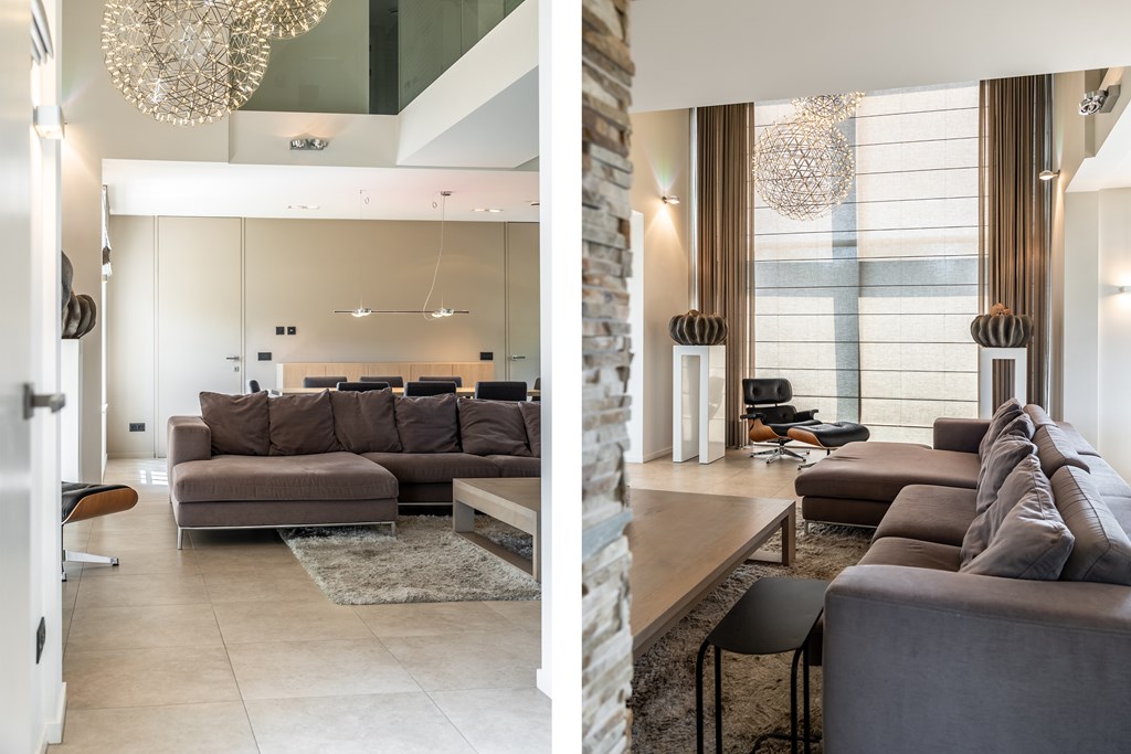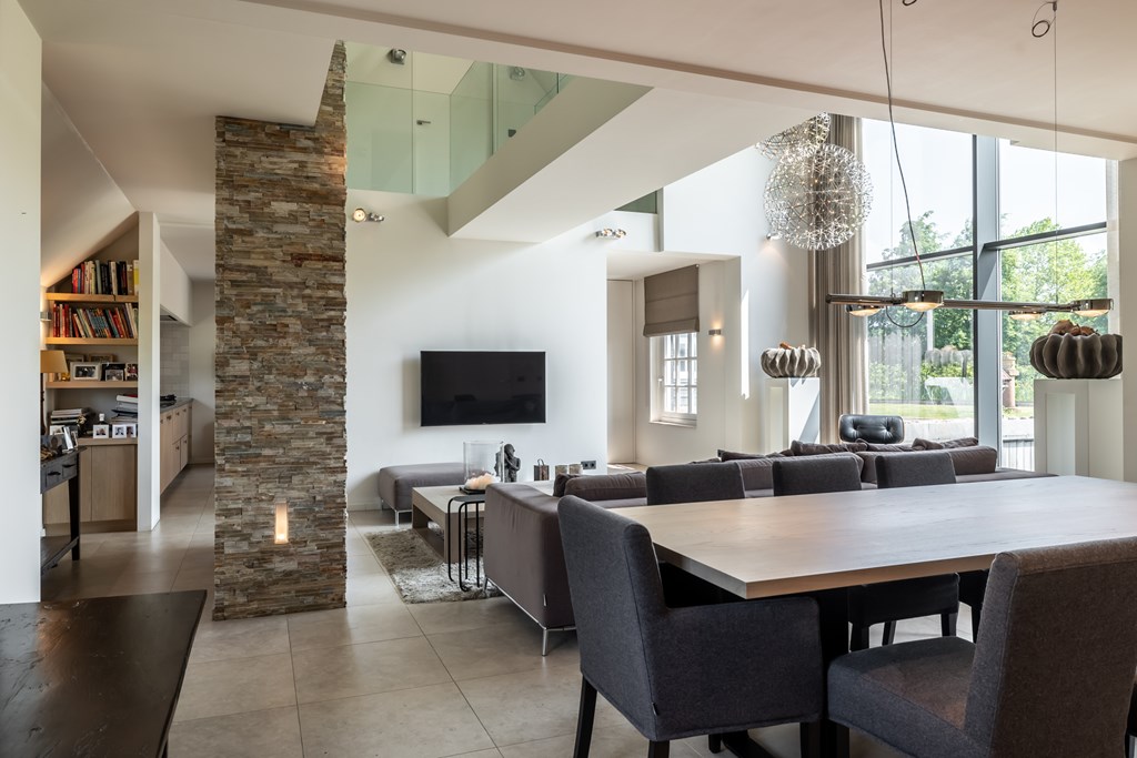 De woonkamer is voorzien van een keramische tegelvloer met vloerverwarming, inbouwverlichting, plafondverwarming en een gashaard. Door de grote glasgevel aan de achterzijde van het huis komt er veel natuurlijk lichtinval de woning binnen. Dankzij de grote glasgevel staat u vanuit de woonkamer altijd in verbinding met de tuin.