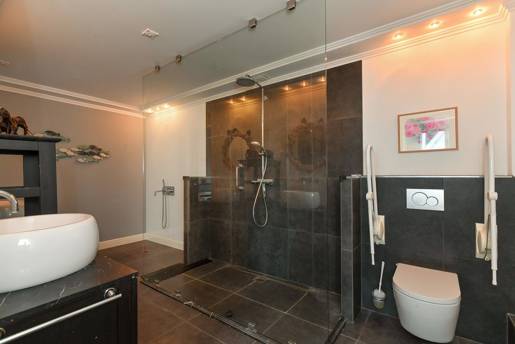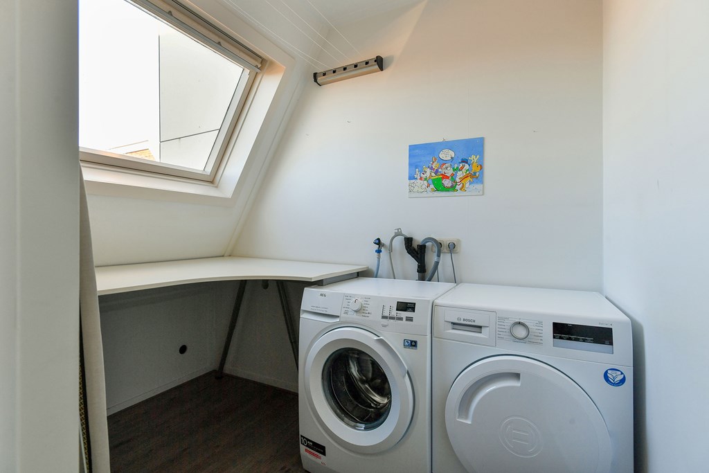 Aangrenzend vind je een praktische bijkeuken/wasruimte en een modern afgewerkt toilet.