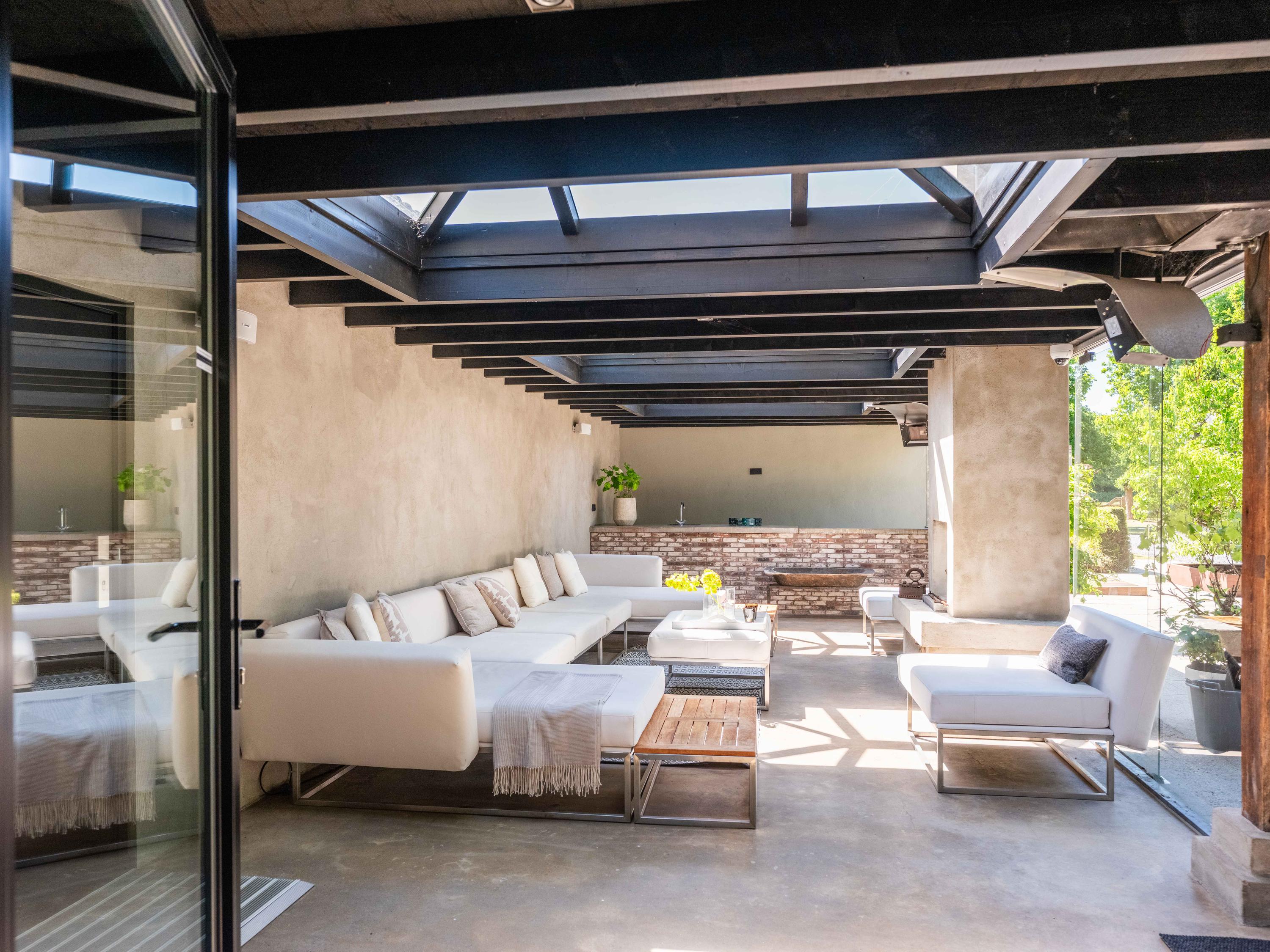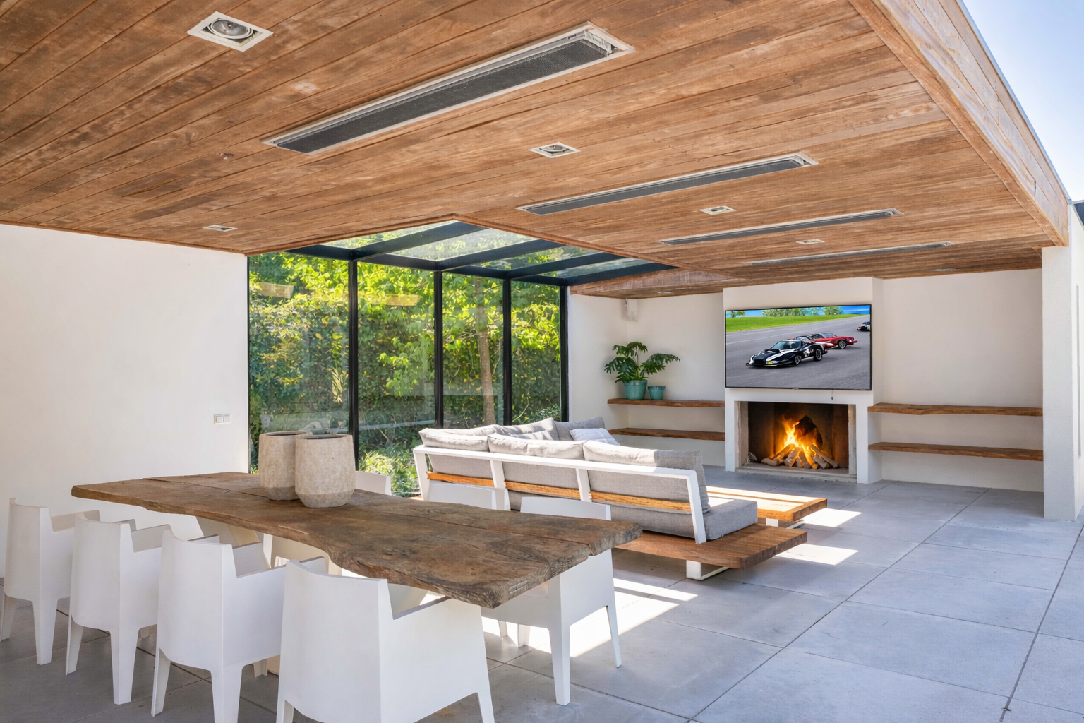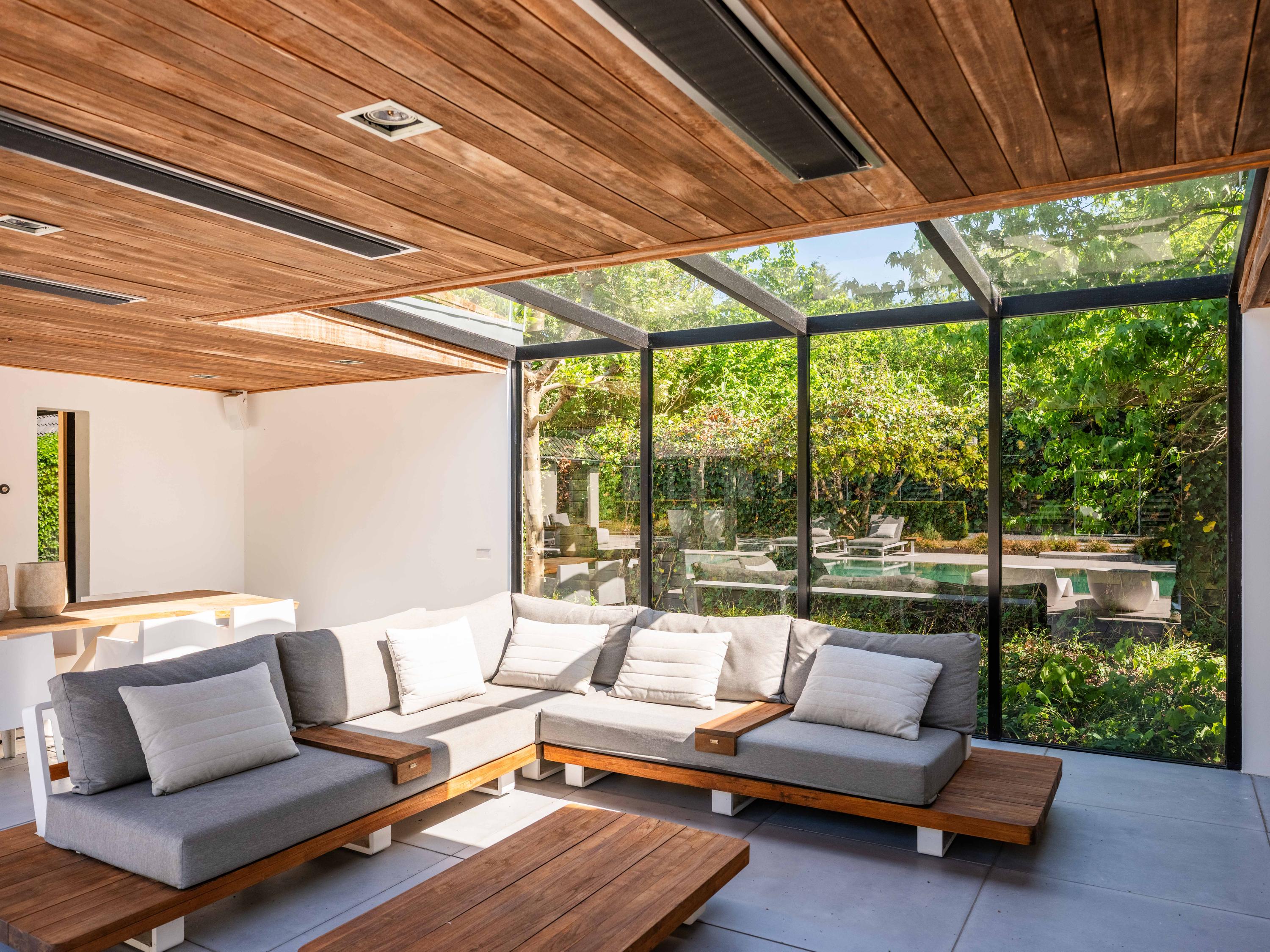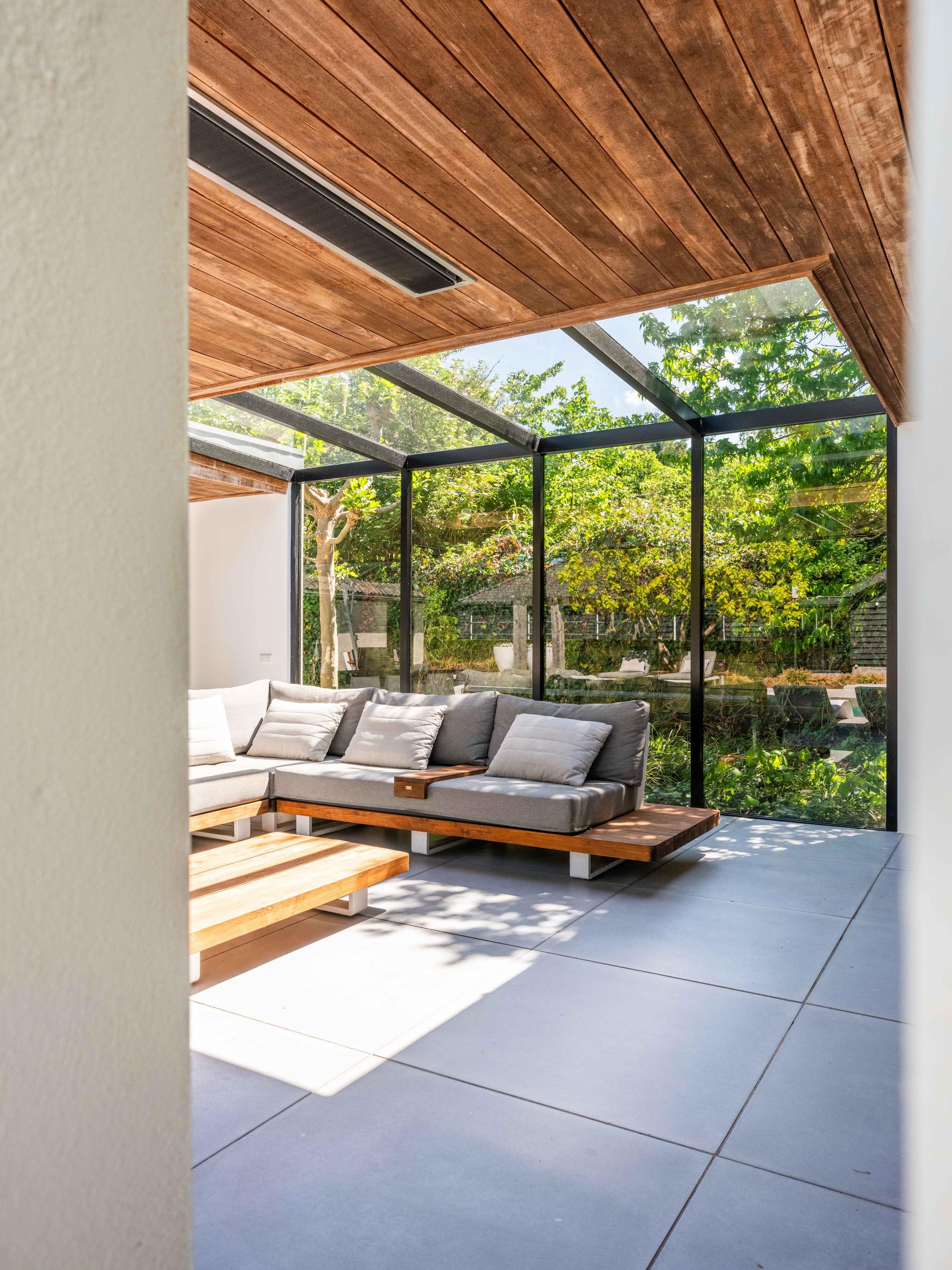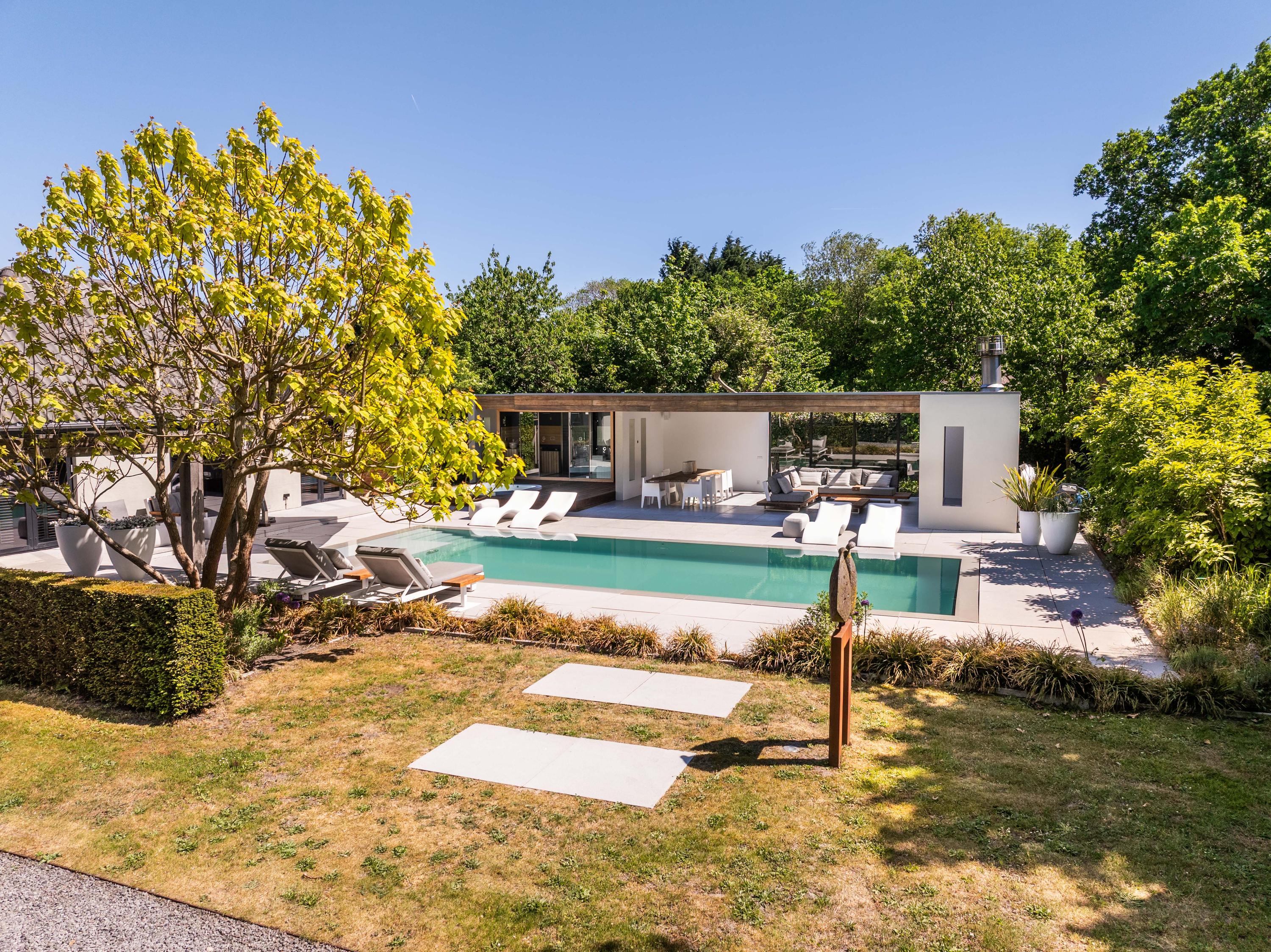 Vanuit de woonkamer heeft u toegang tot de serre, deze is uitgerust met een open haard, een pantry en een grote loungehoek. Vanuit de serre heeft u prachtig uitzicht over de ruim aangelegde tuin.