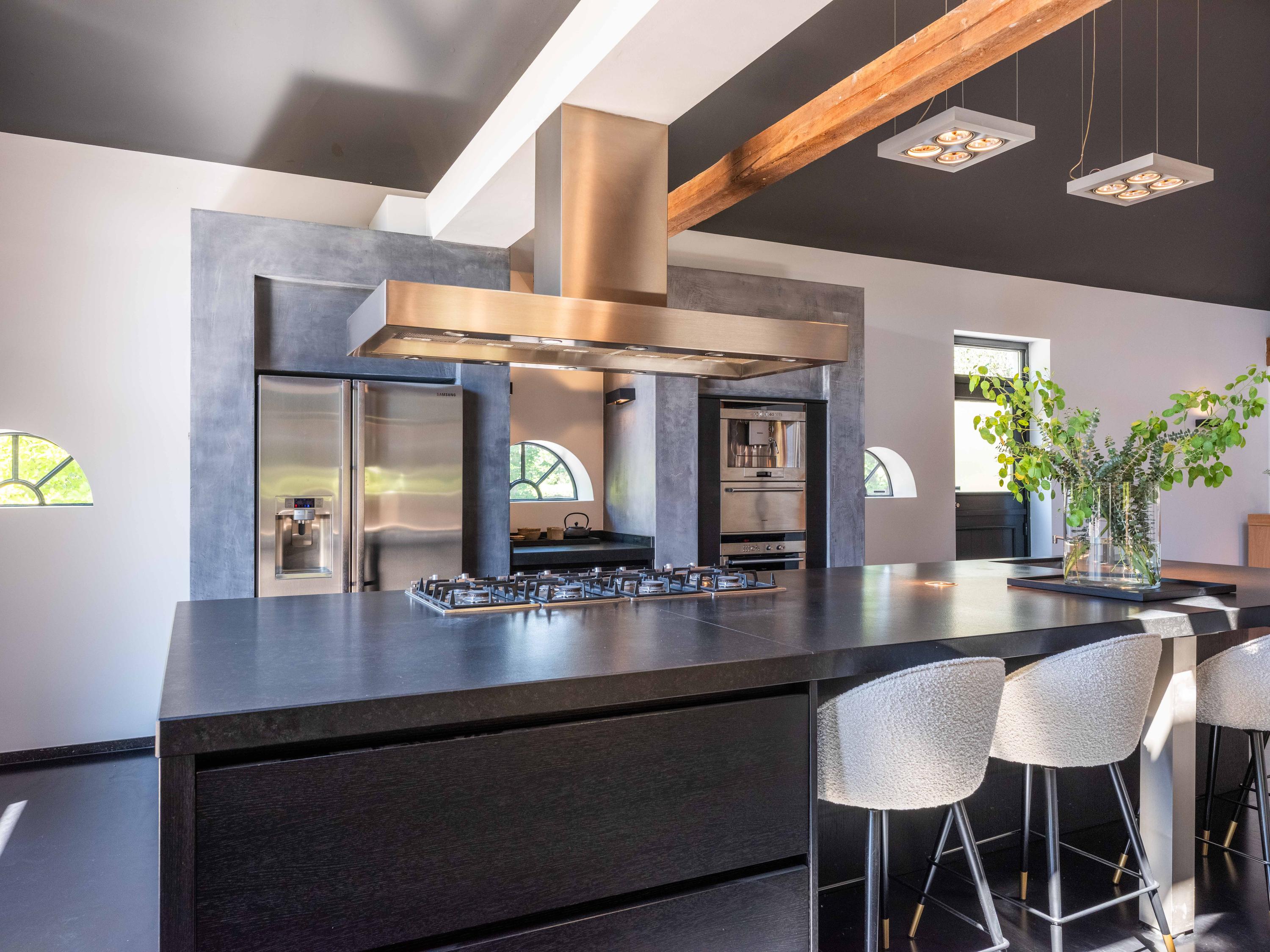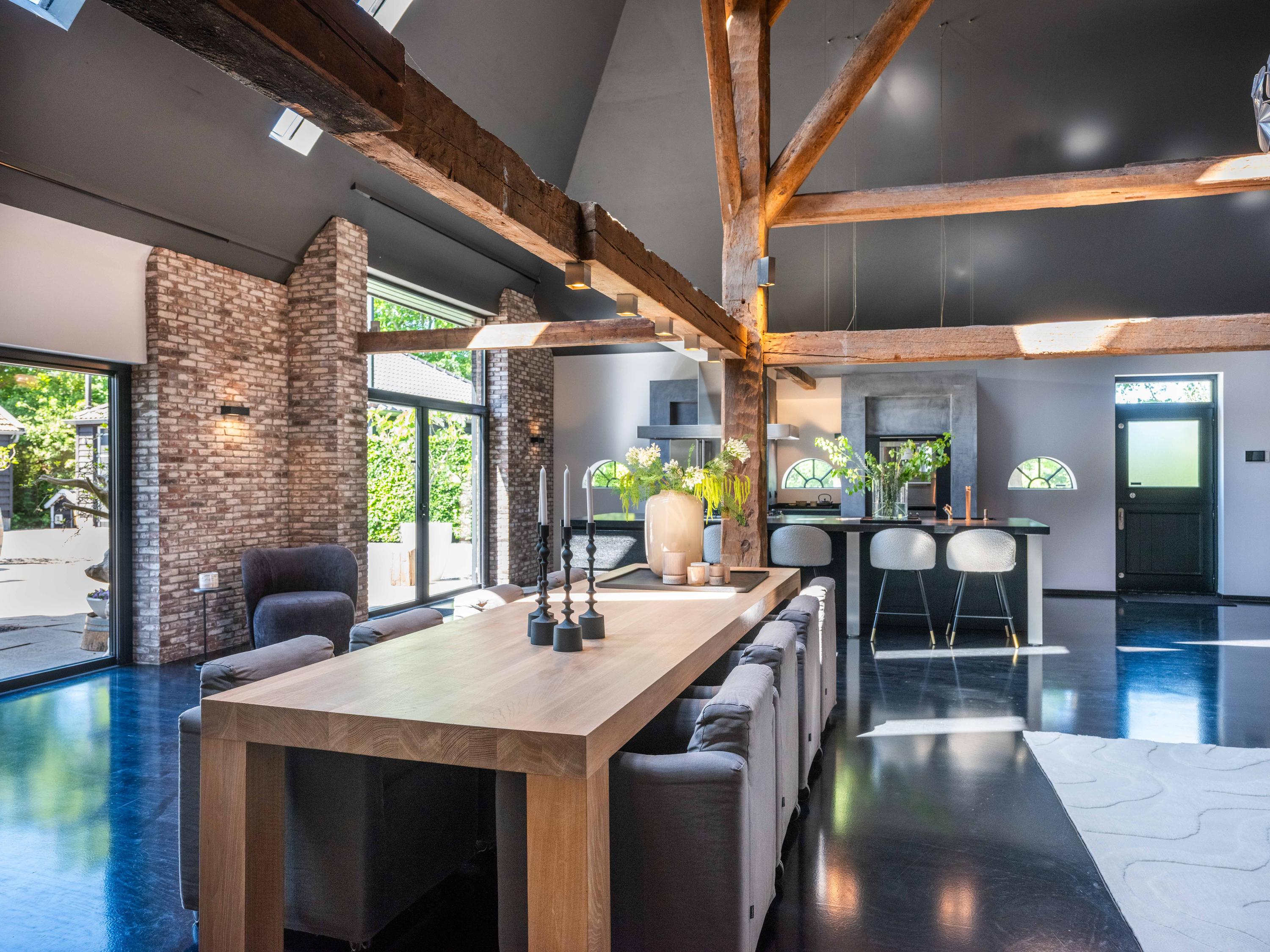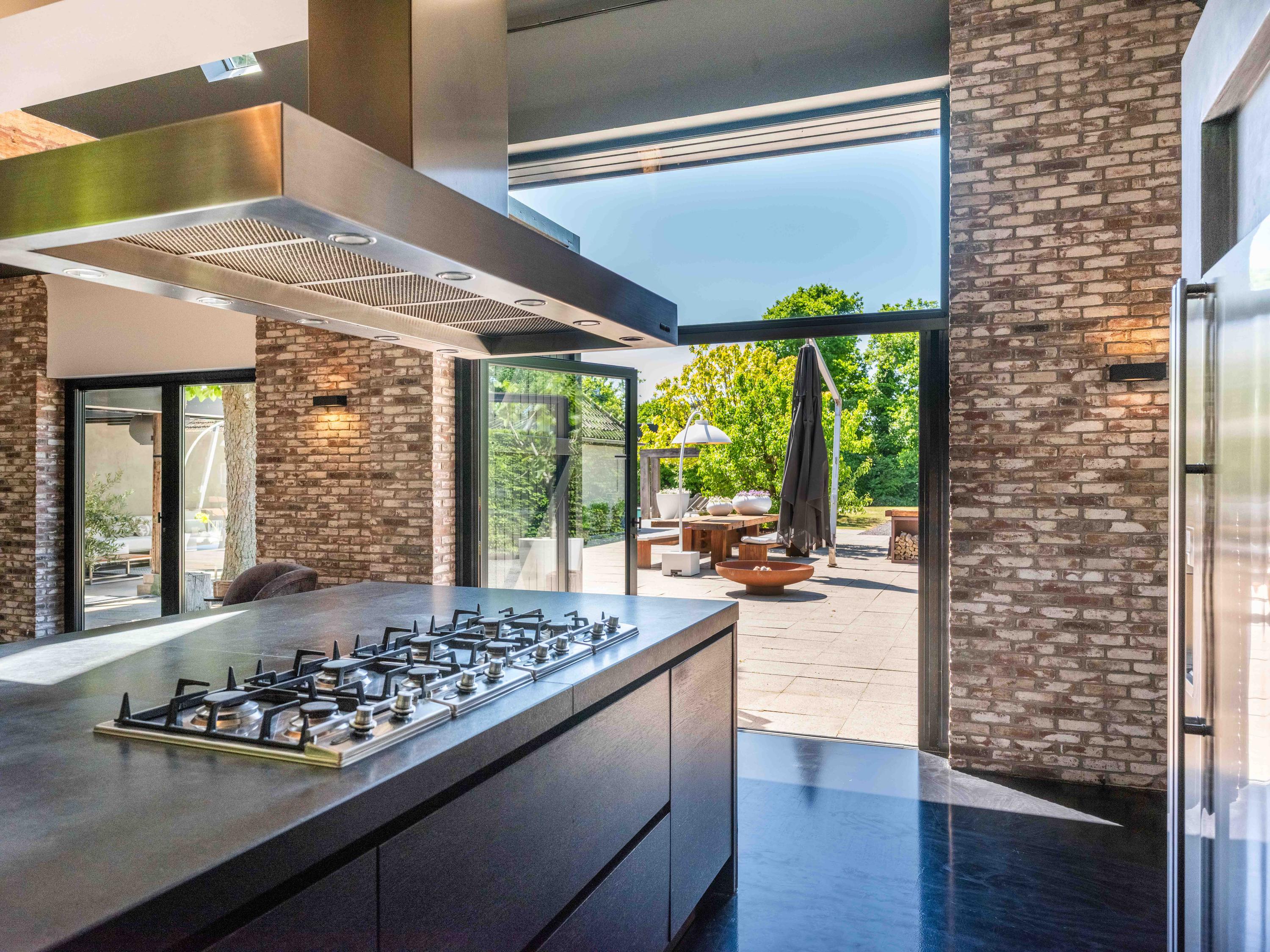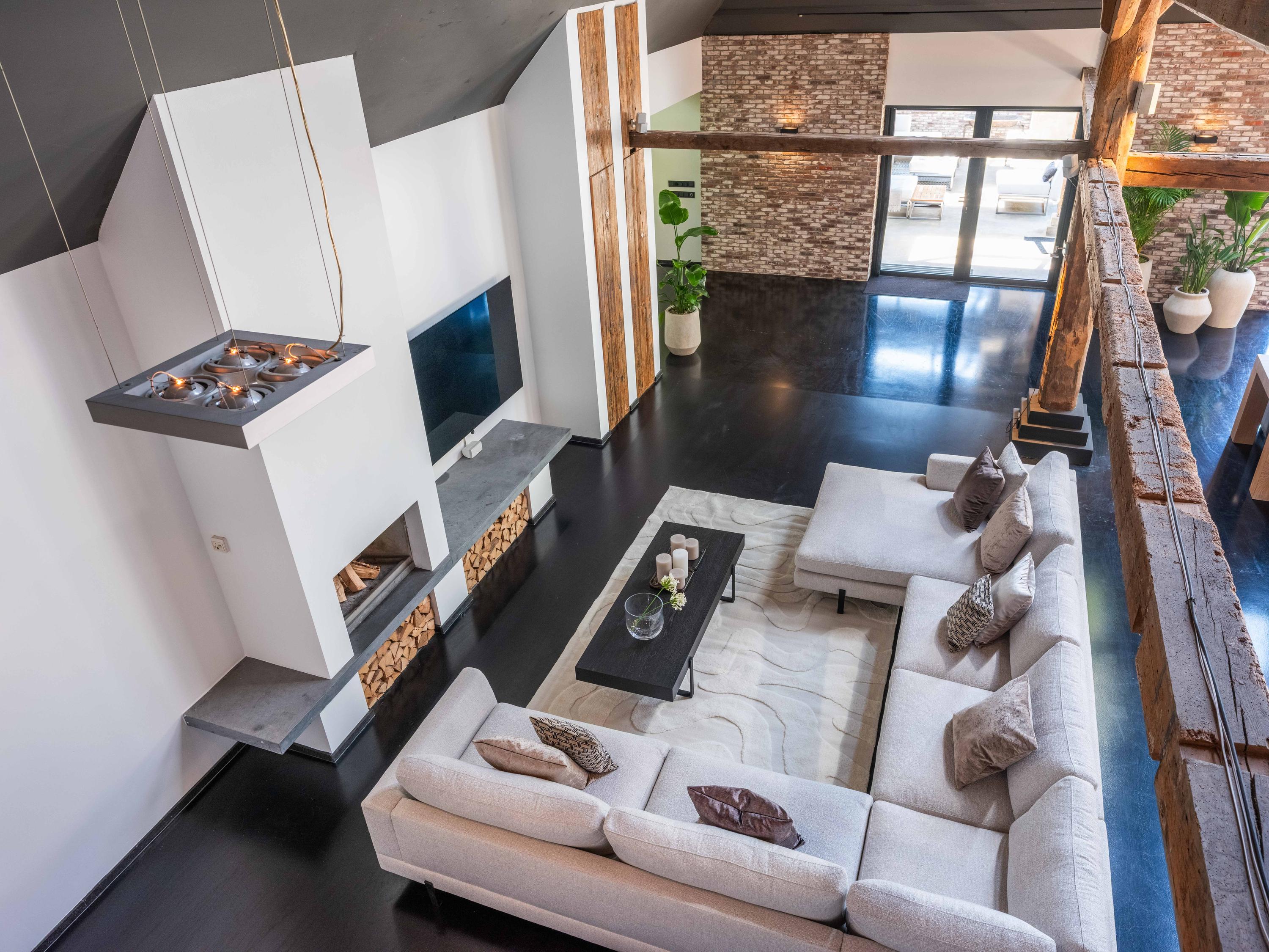 In de woonkamer valt de ruimte gelijk op. Het contrast van de kleuren in de woning versterken het stoere karakter van de woning. Deze zeer ruime living heeft een open haard en openslaande deuren naar de tuin. De moderne open keuken is uitgerust met diverse inbouwapparatuur, waaronder een Boretti 8-pits fornuis, een Amerikaanse koelkast met koffieapparaat en bordenwarmer, oven, en een ingebouwde koel- en vaatwasapparatuur. Er is tevens een vide aanwezig.