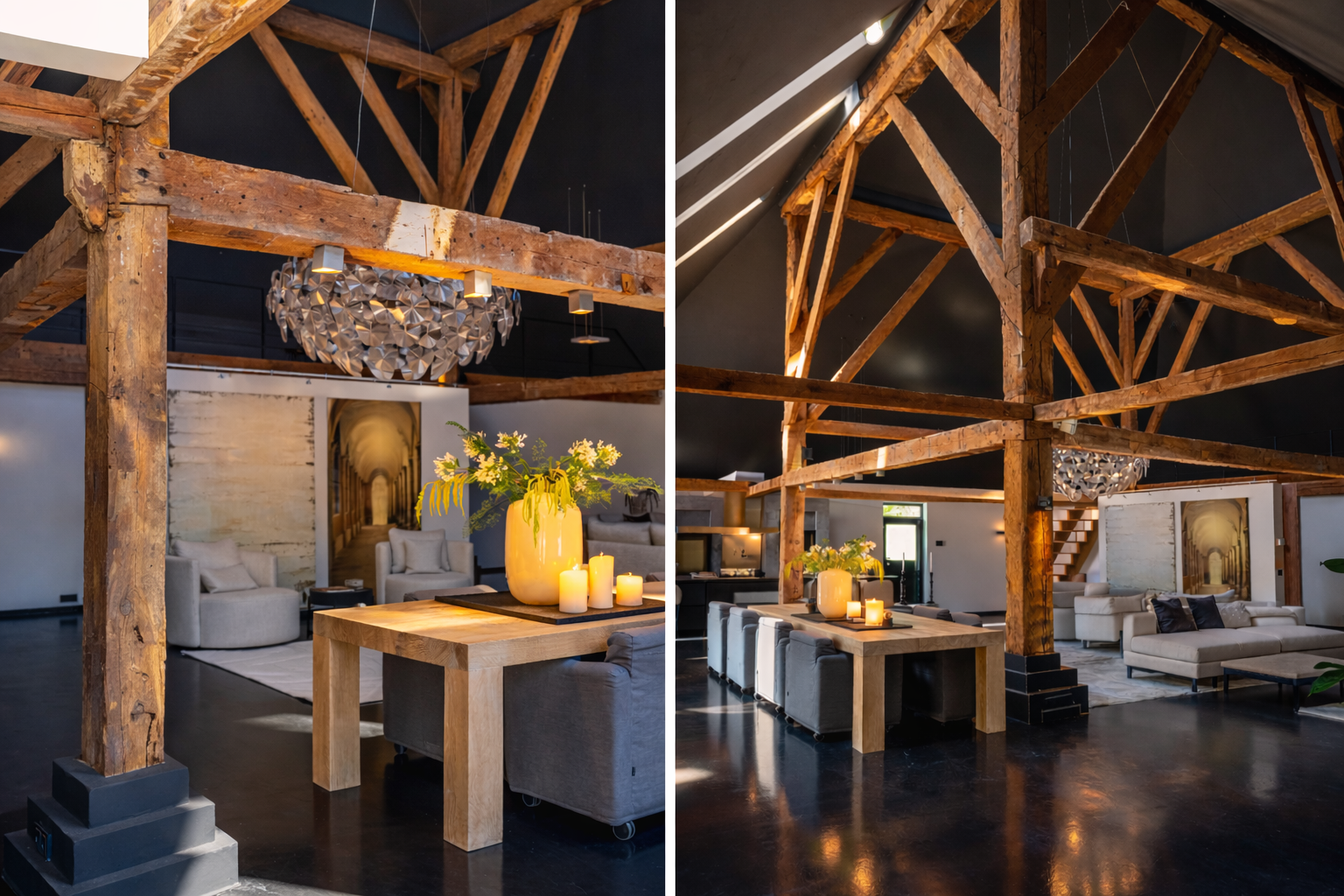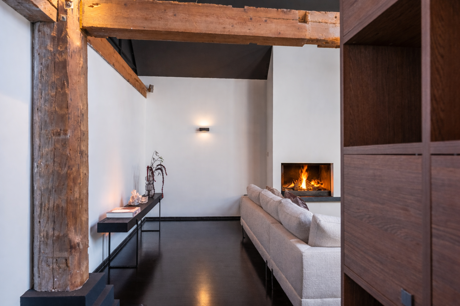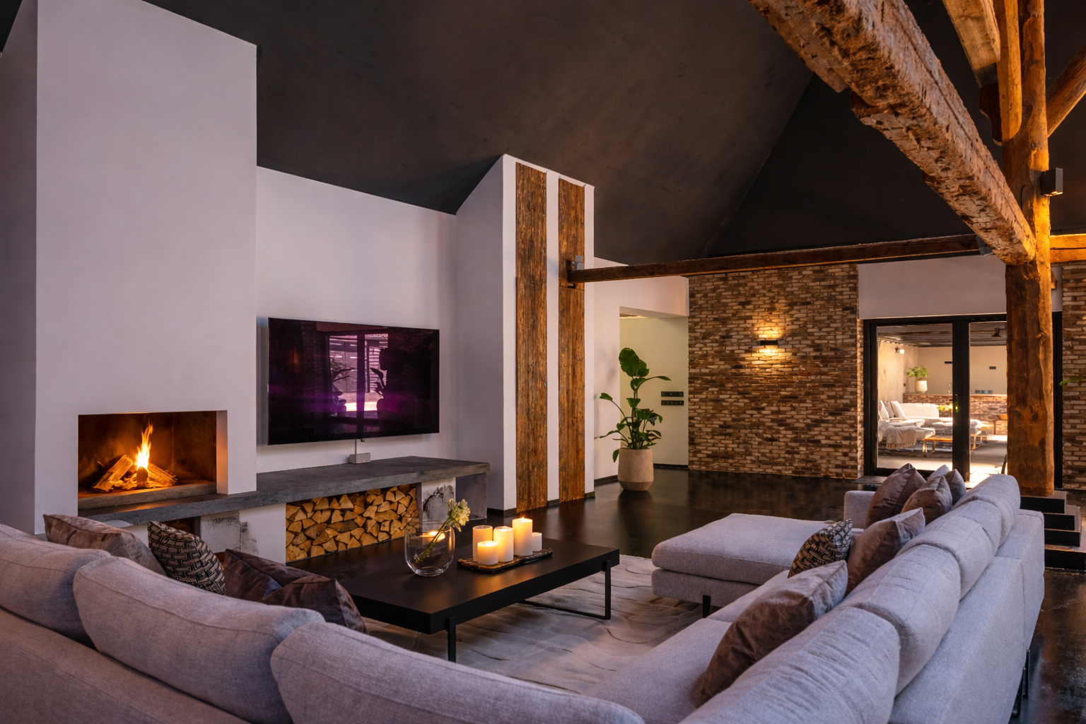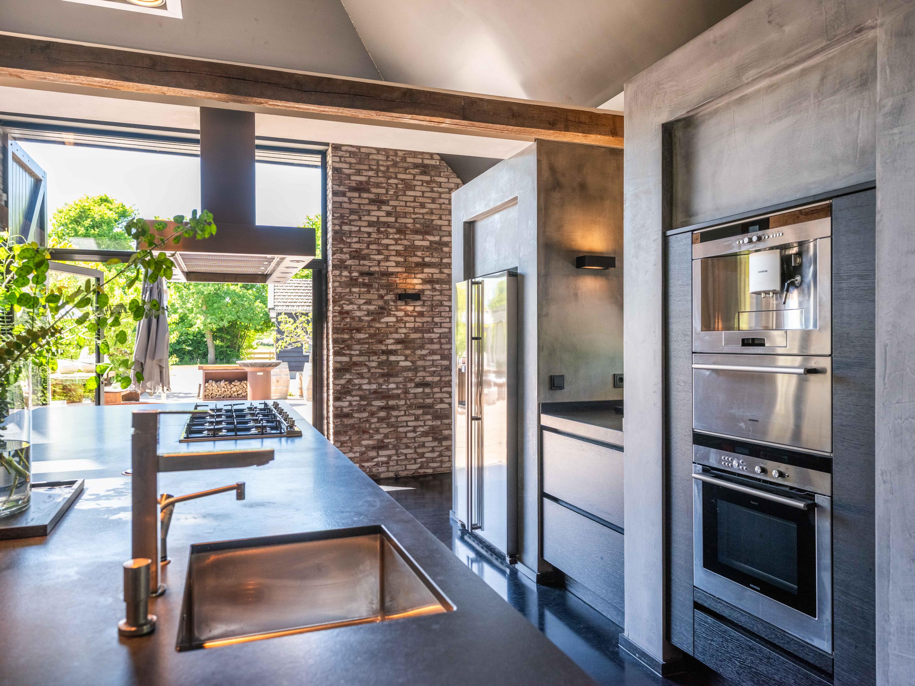 In de woonkamer valt de ruimte gelijk op. Het contrast van de kleuren in de woning versterken het stoere karakter van de woning. Deze zeer ruime living heeft een open haard en openslaande deuren naar de tuin. De moderne open keuken is uitgerust met diverse inbouwapparatuur, waaronder een Boretti 8-pits fornuis, een Amerikaanse koelkast met koffieapparaat en bordenwarmer, oven, en een ingebouwde koel- en vaatwasapparatuur. Er is tevens een vide aanwezig.