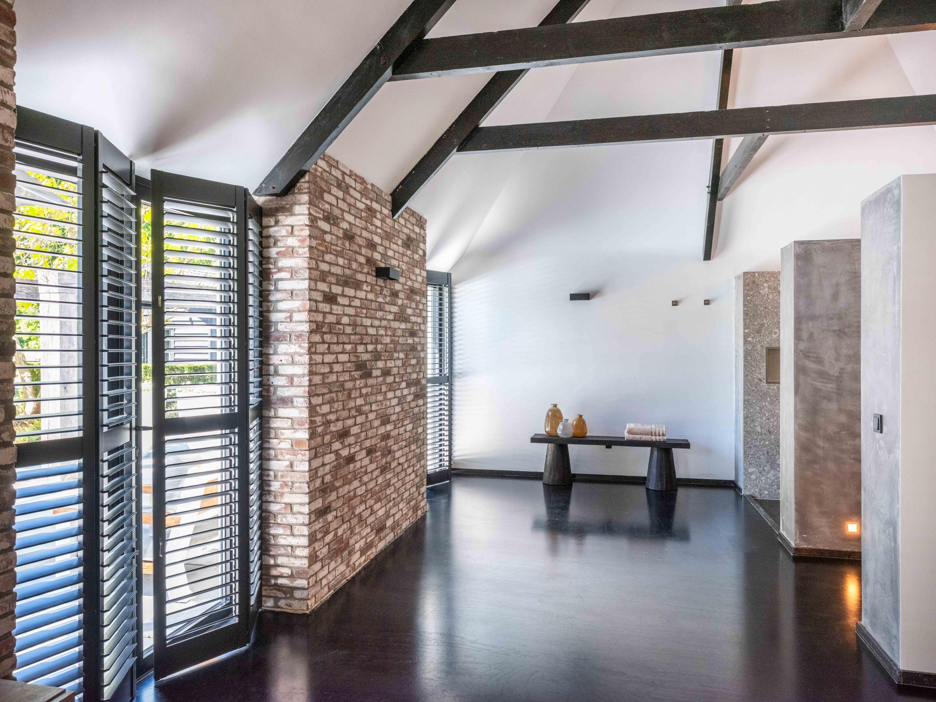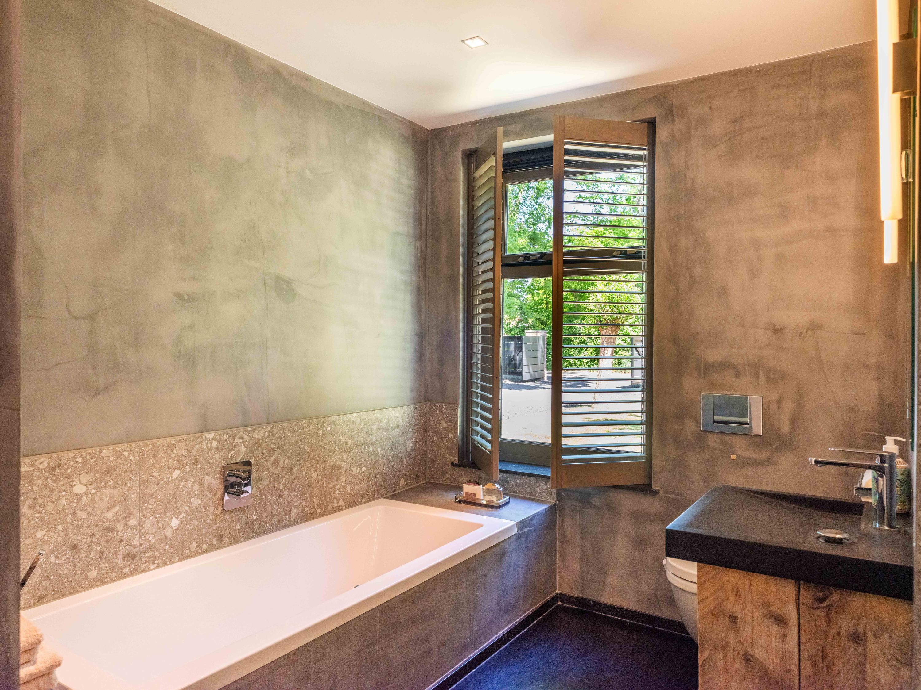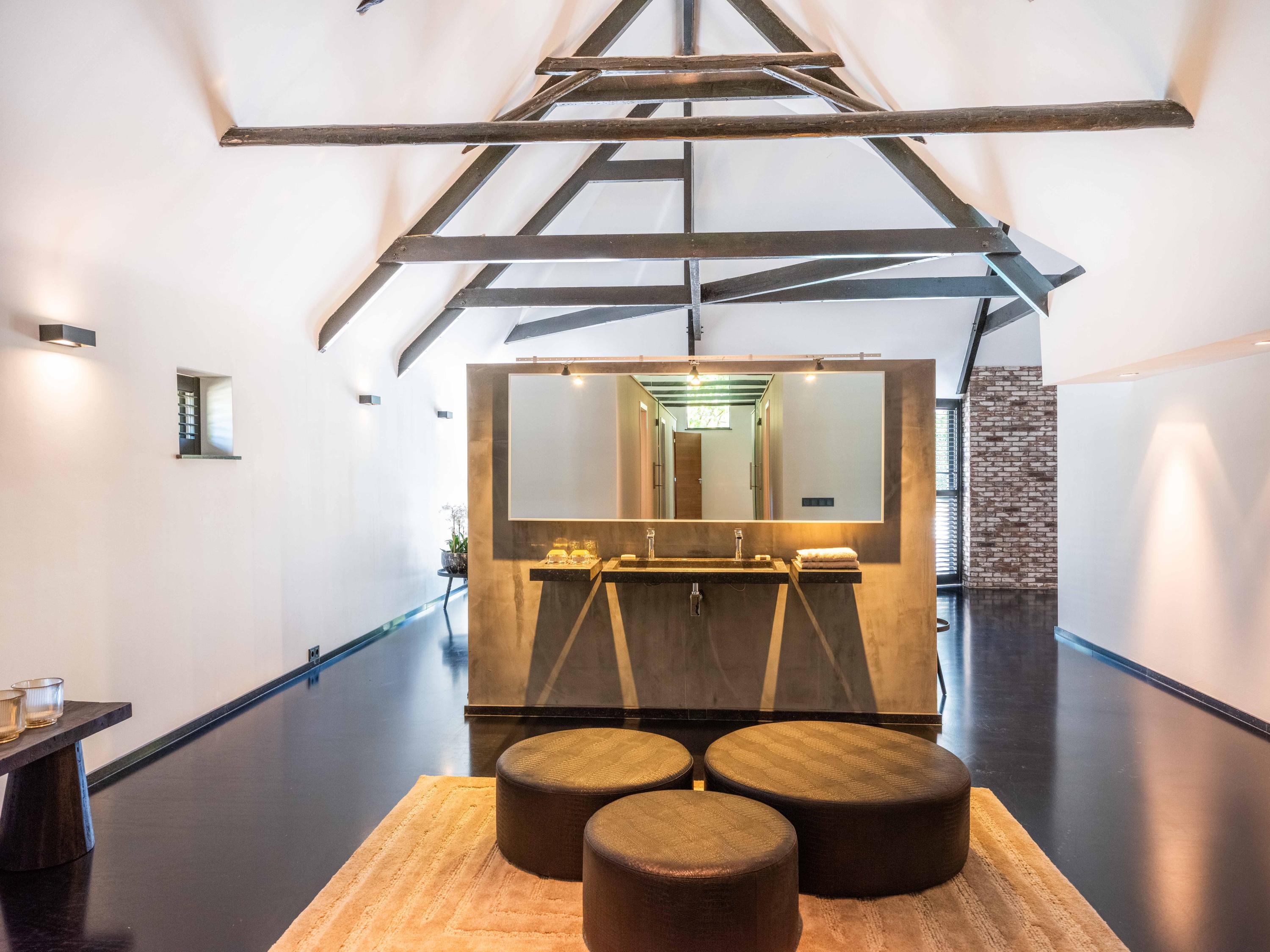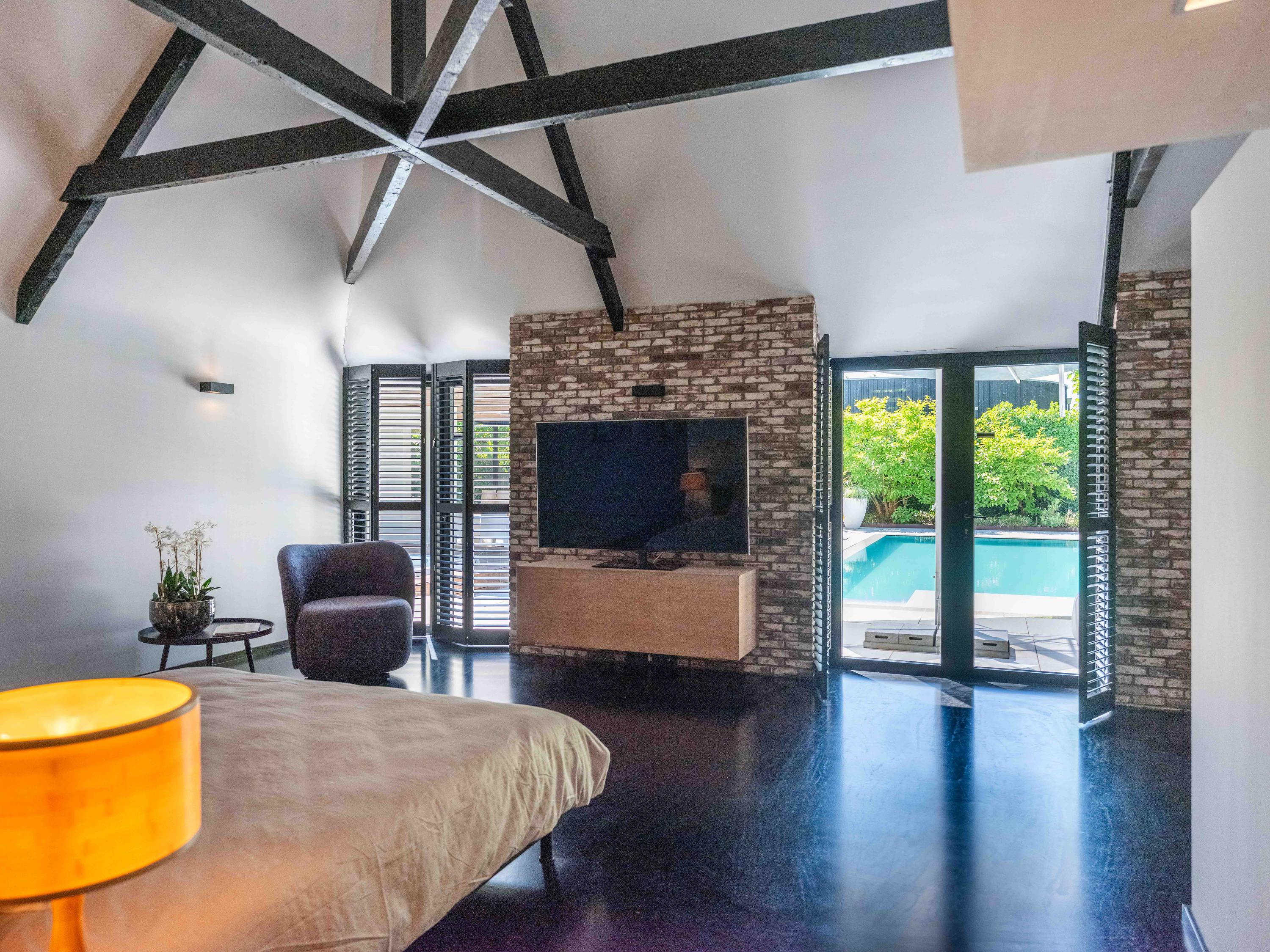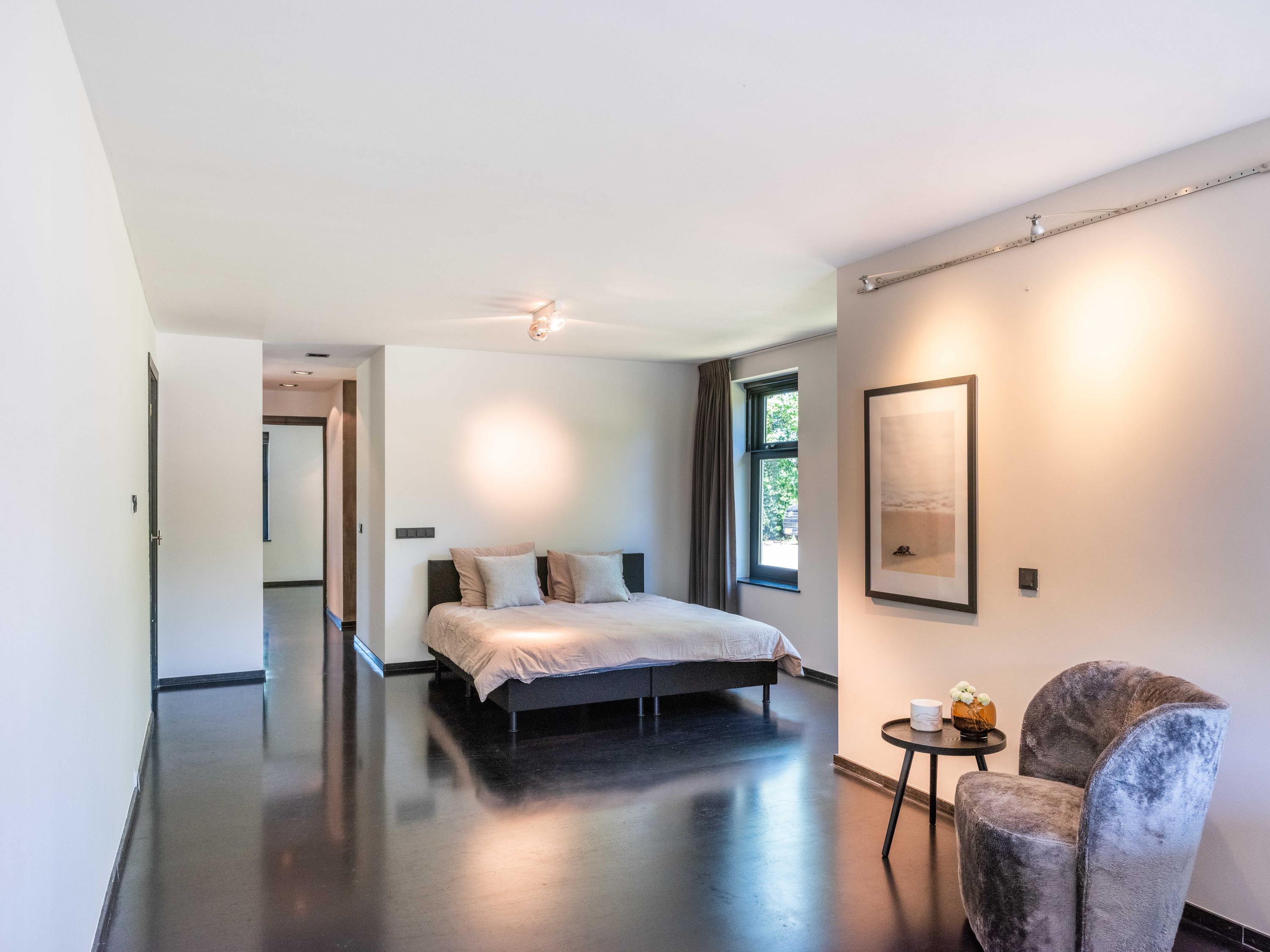Ook vanuit de woonkamer zijn er doorgangen naar een separaat toilet, verschillende bergingen en de master bedroom in de aangrenzende vleugel. Deze slaapkamer beschikt over een ruime inloopkast en een open badkamer met dubbele wastafels. De badkamer is voorzien van een ruime douche met zitplaats en een toilet. Het uitzicht vanuit zowel de slaapkamer als de badkamer is gericht op het zwembad, wat de luxe van de woning nog eens extra benadrukt en een wellness beleving creëert.