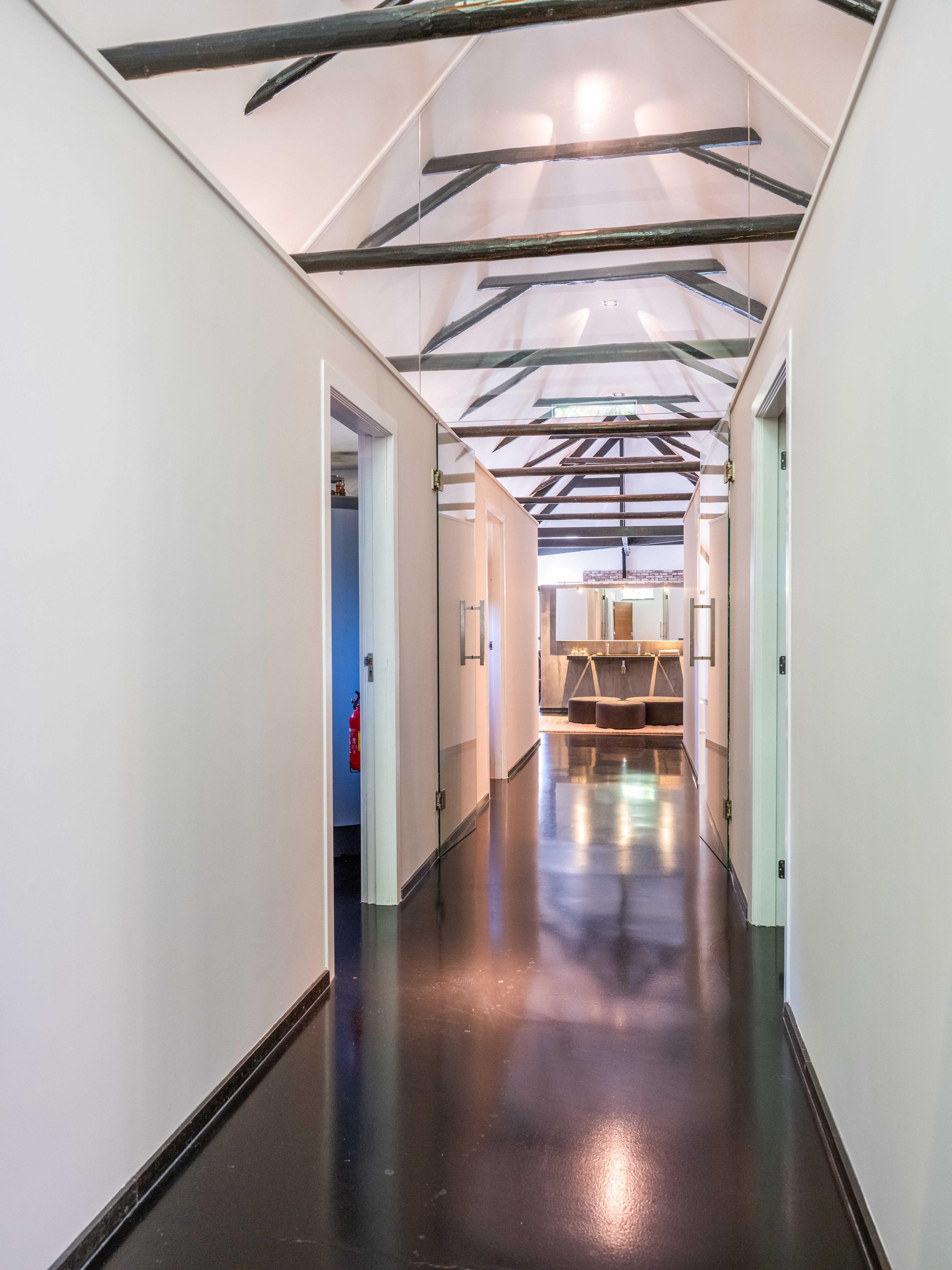 Bij het betreden van deze woonboerderij komt u aan de voorzijde in een ruime hal die toegang biedt tot de eerste slaapkamer aan de linkerzijde en aan de rechterzijde een tweede slaap- of werkkamer met een naastgelegen badkamer. De kamer naast de badkamer biedt veel flexibiliteit en kan zowel als werkruimte of als slaapkamer worden gebruikt. De badkamer is voorzien van een ligbad, toilet, wastafel en een inloopdouche. In de hal bevindt zich verder de meterkast.