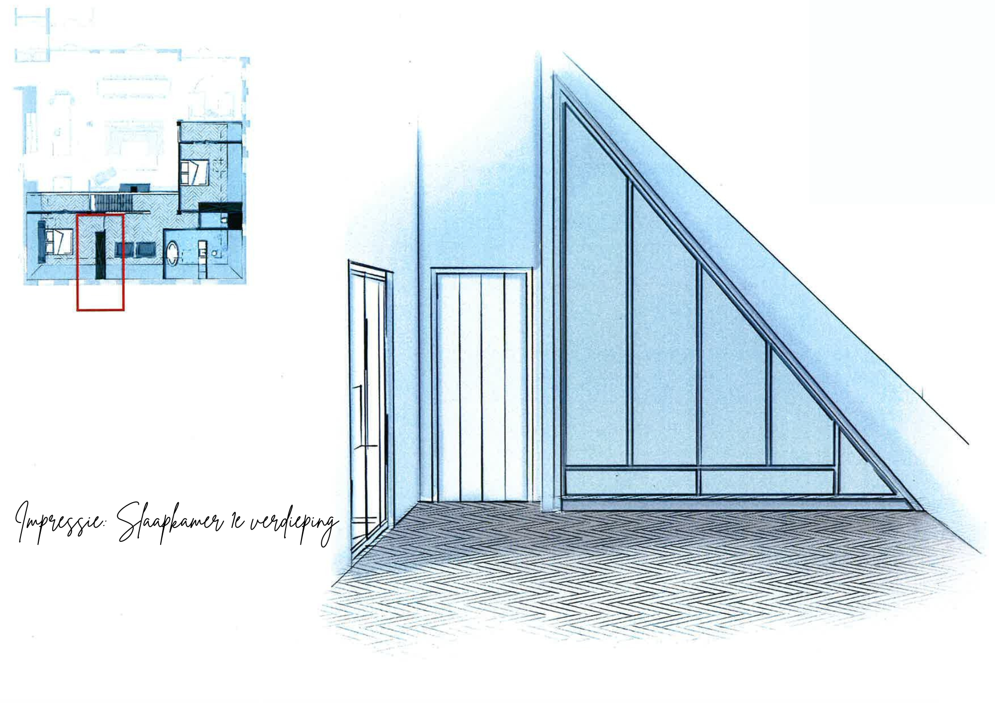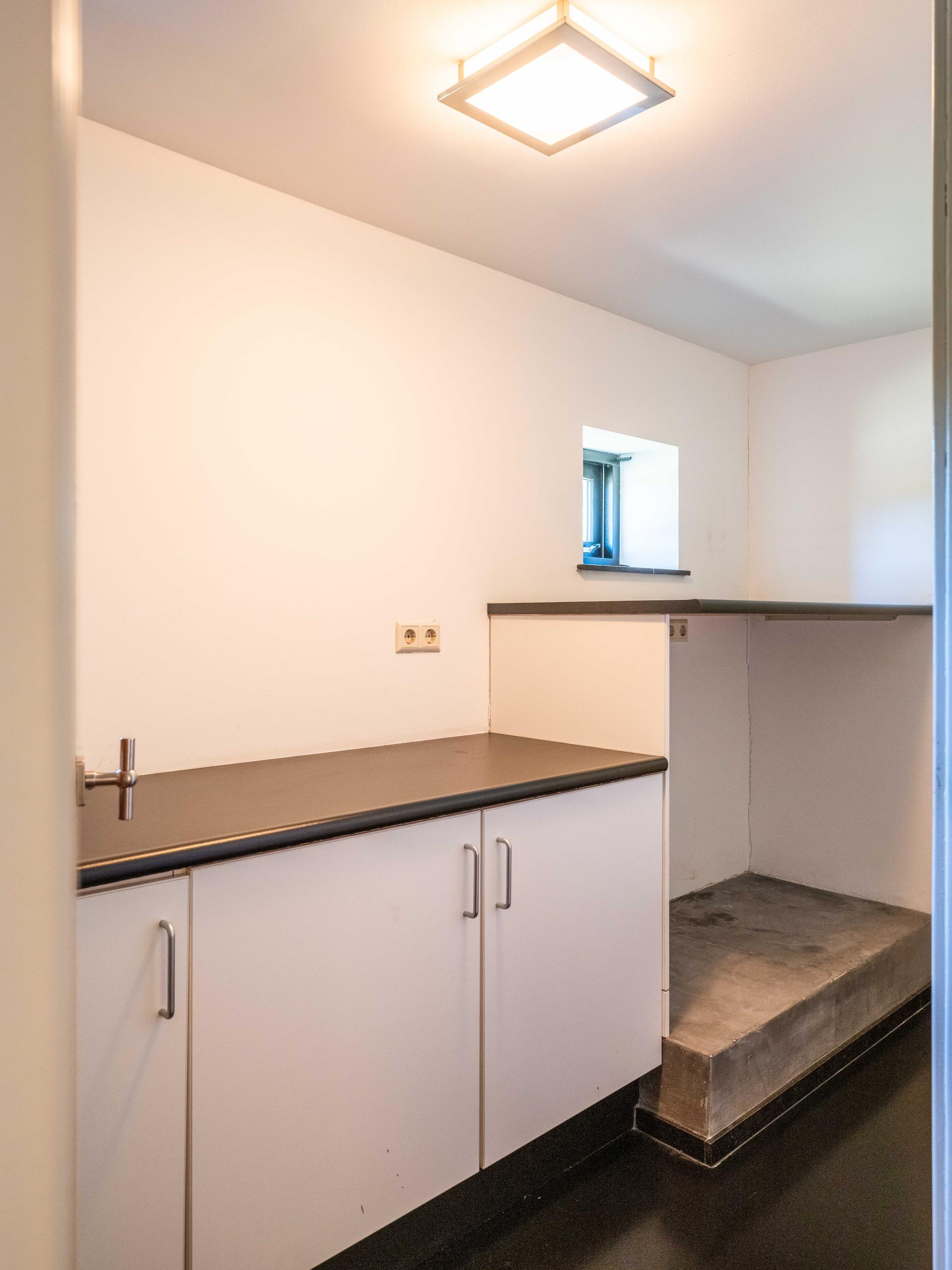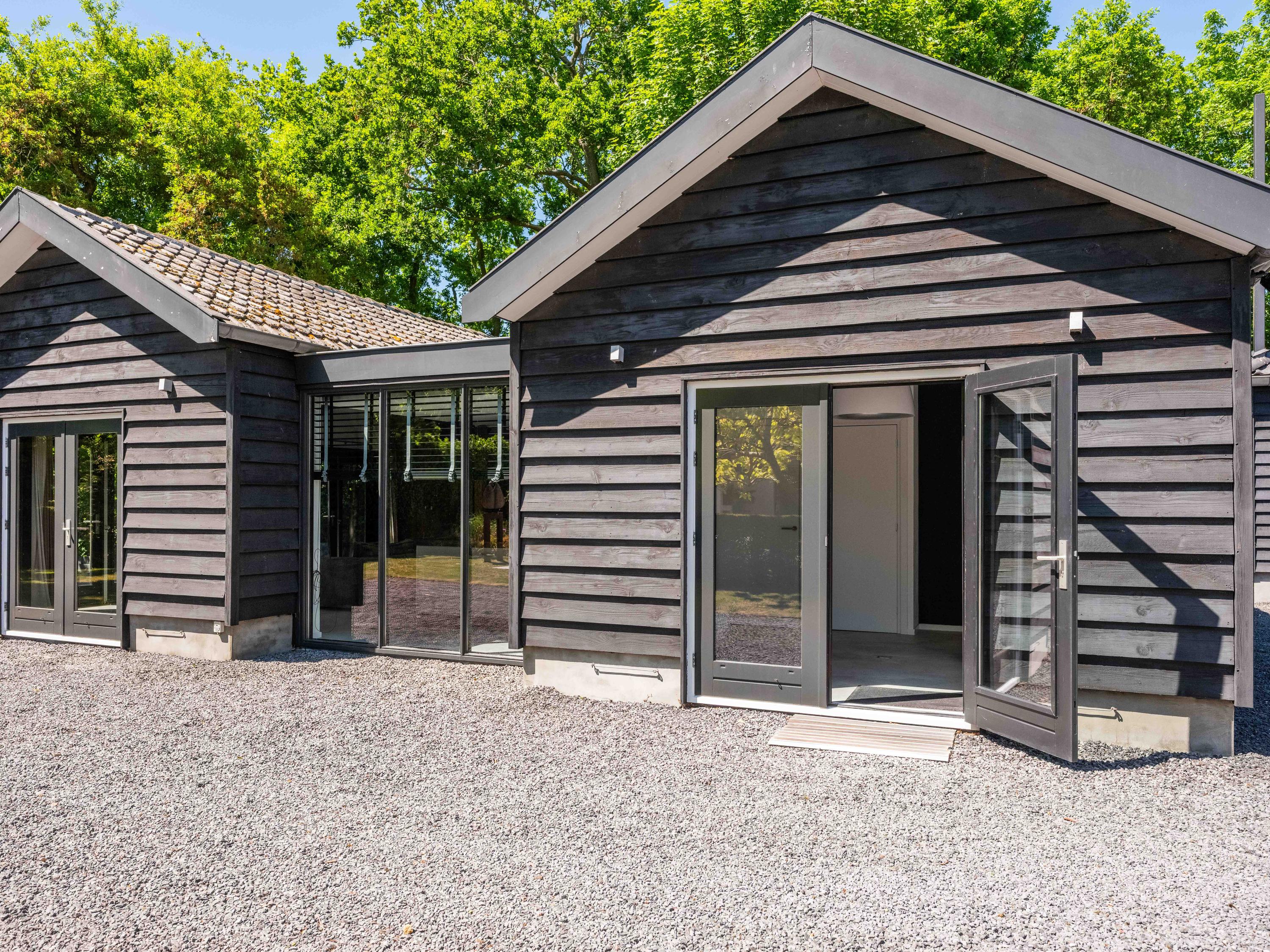 Alle faciliteiten bevinden zich op de begane grond, wat de woning extra toegankelijk maakt. De grote raampartijen zorgen voor veel lichtinval, waardoor de ruimtes ruimtelijk en uitnodigend aanvoelen. In de woonkamer is bovendien een trap naar de vide boven de kamers aan de voorzijde. Bij de foto’s zijn tekeningen toegevoegd die de mogelijkheid tonen om hier een verdieping met slaapkamers te creëren.