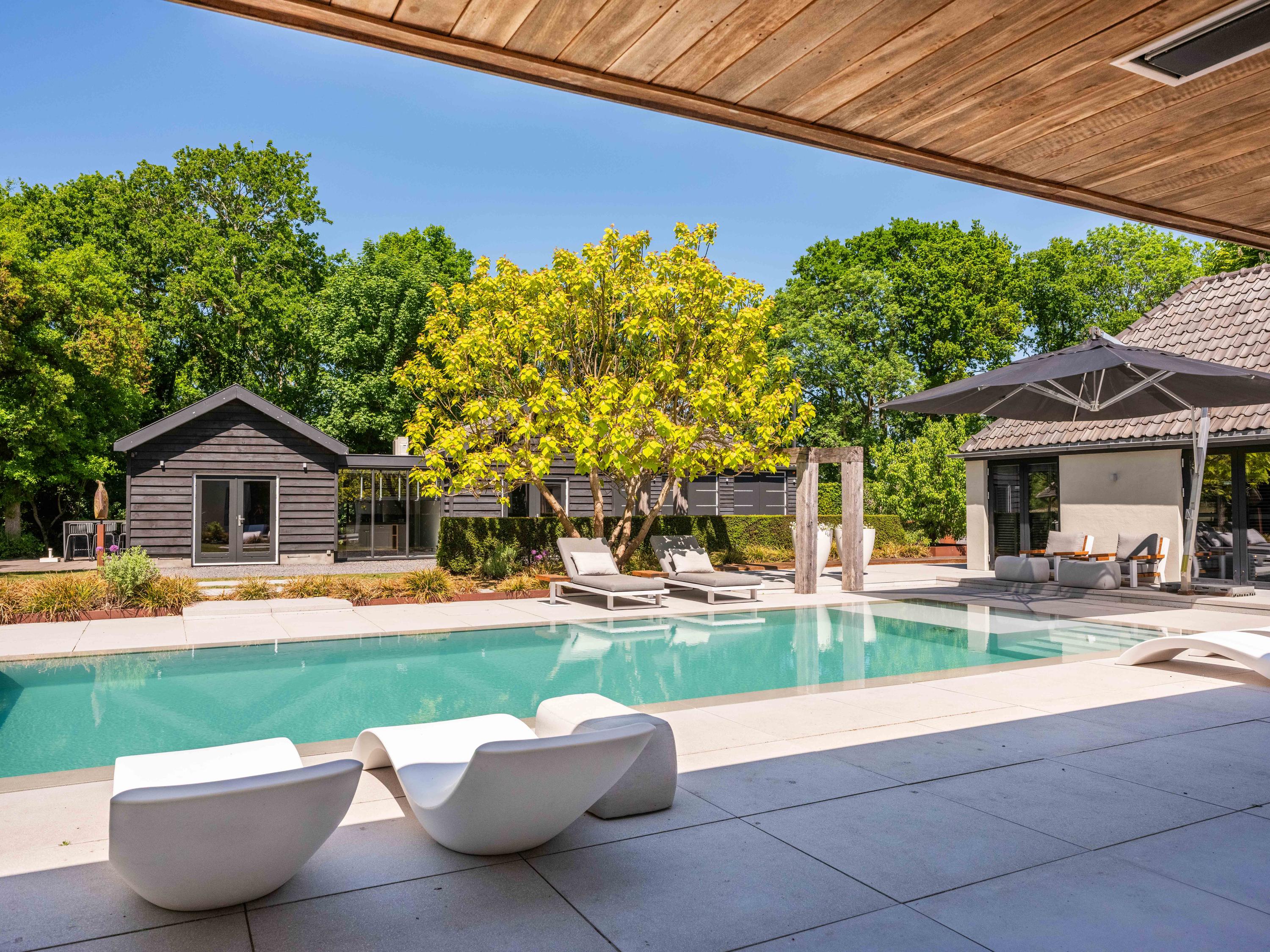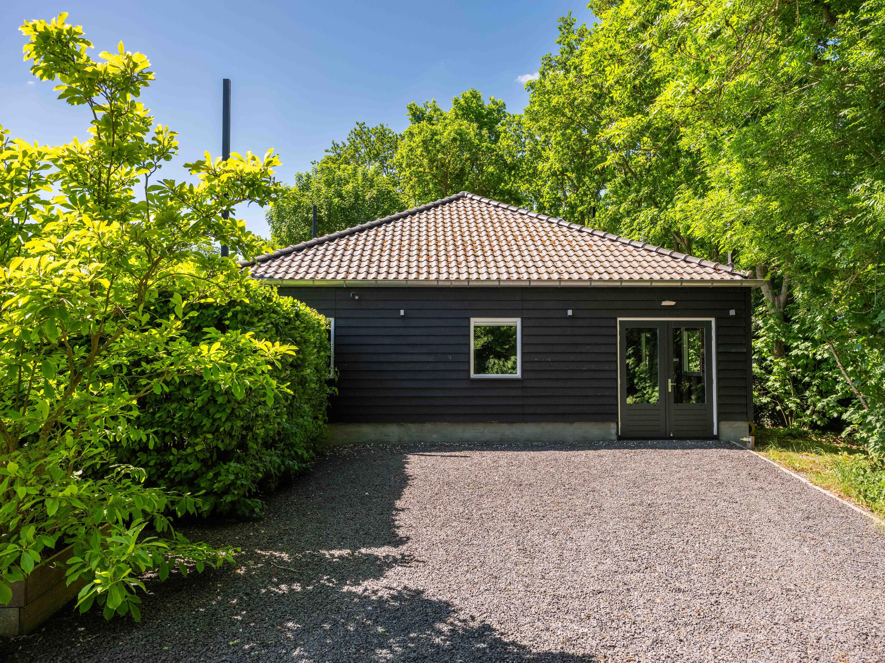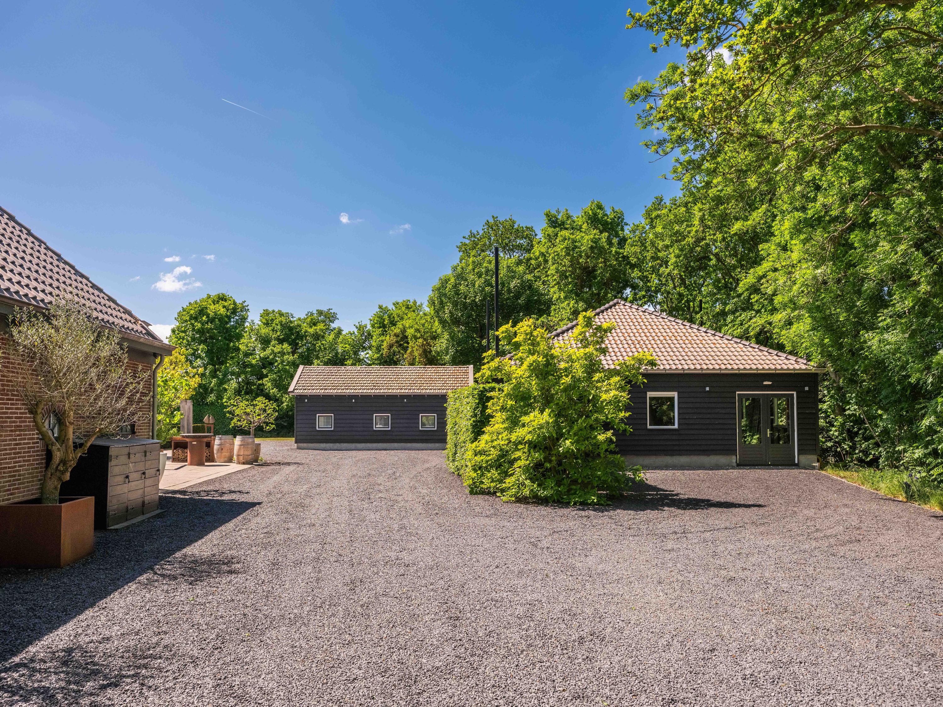 Naast de garage bevindt zich een bijgebouw dat over verschillende faciliteiten beschikt en voor diverse doeleinden gebruikt kan worden. Dit huisje biedt tevens een prachtig uitzicht over de kavel en het zwembad.