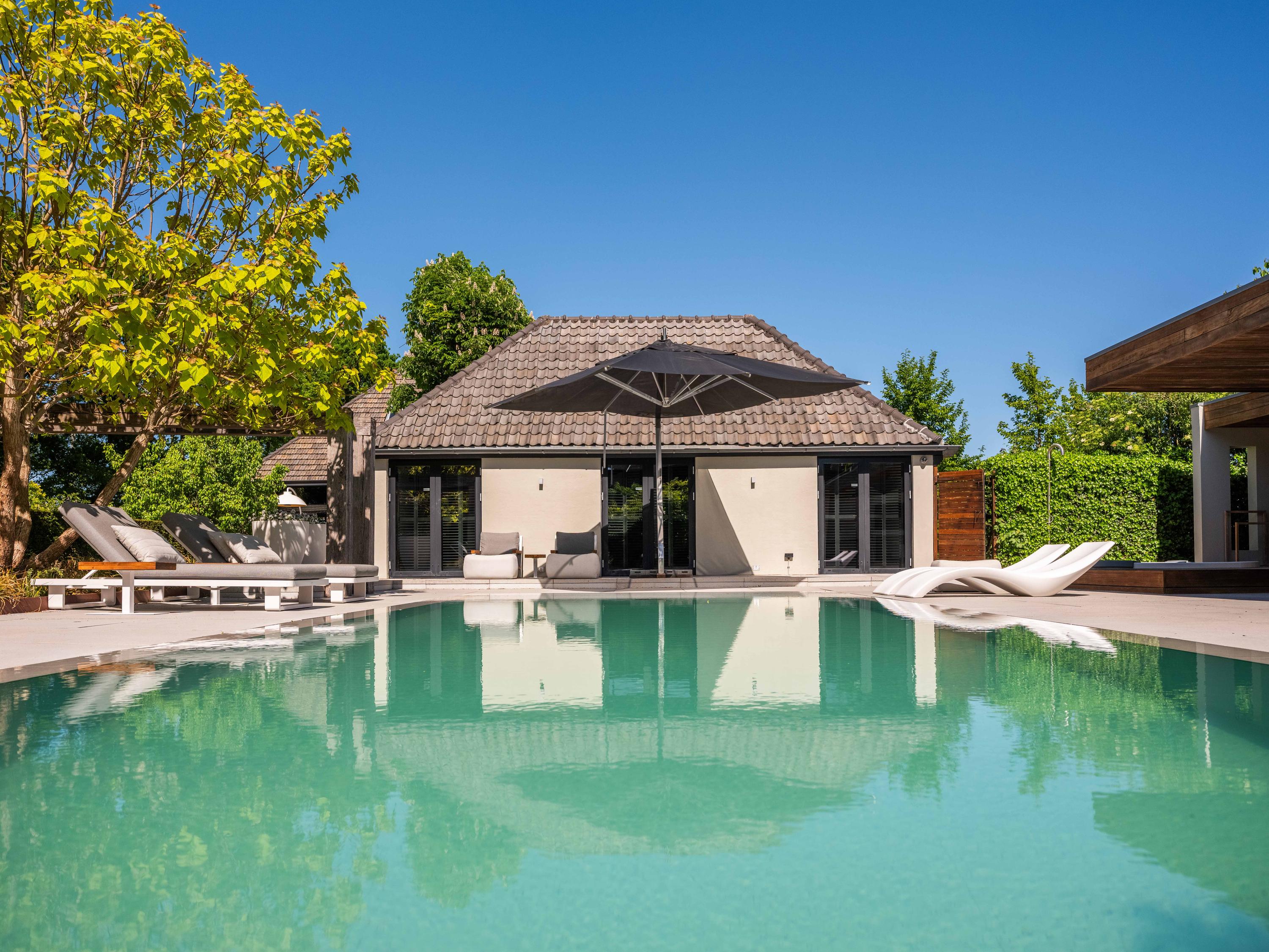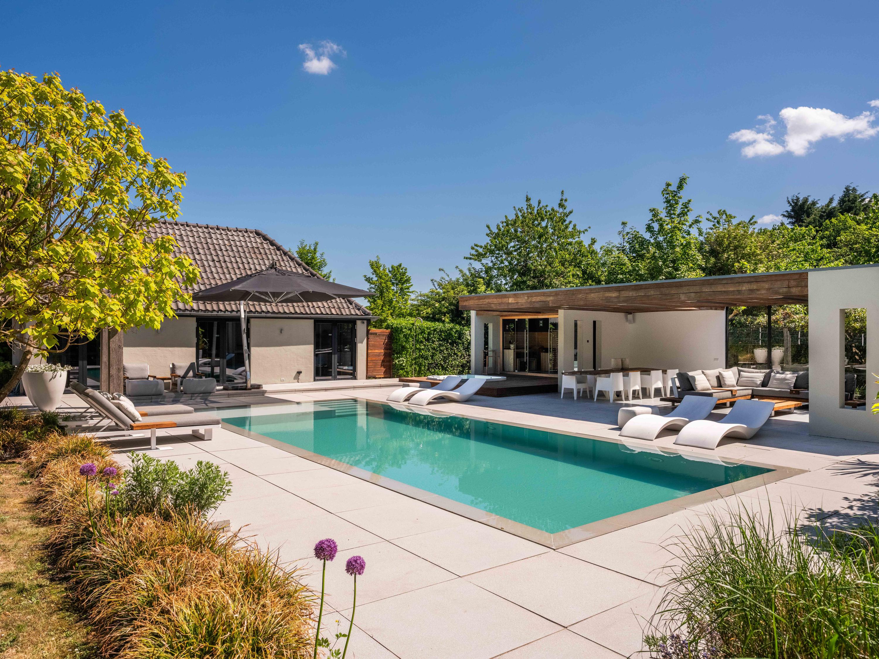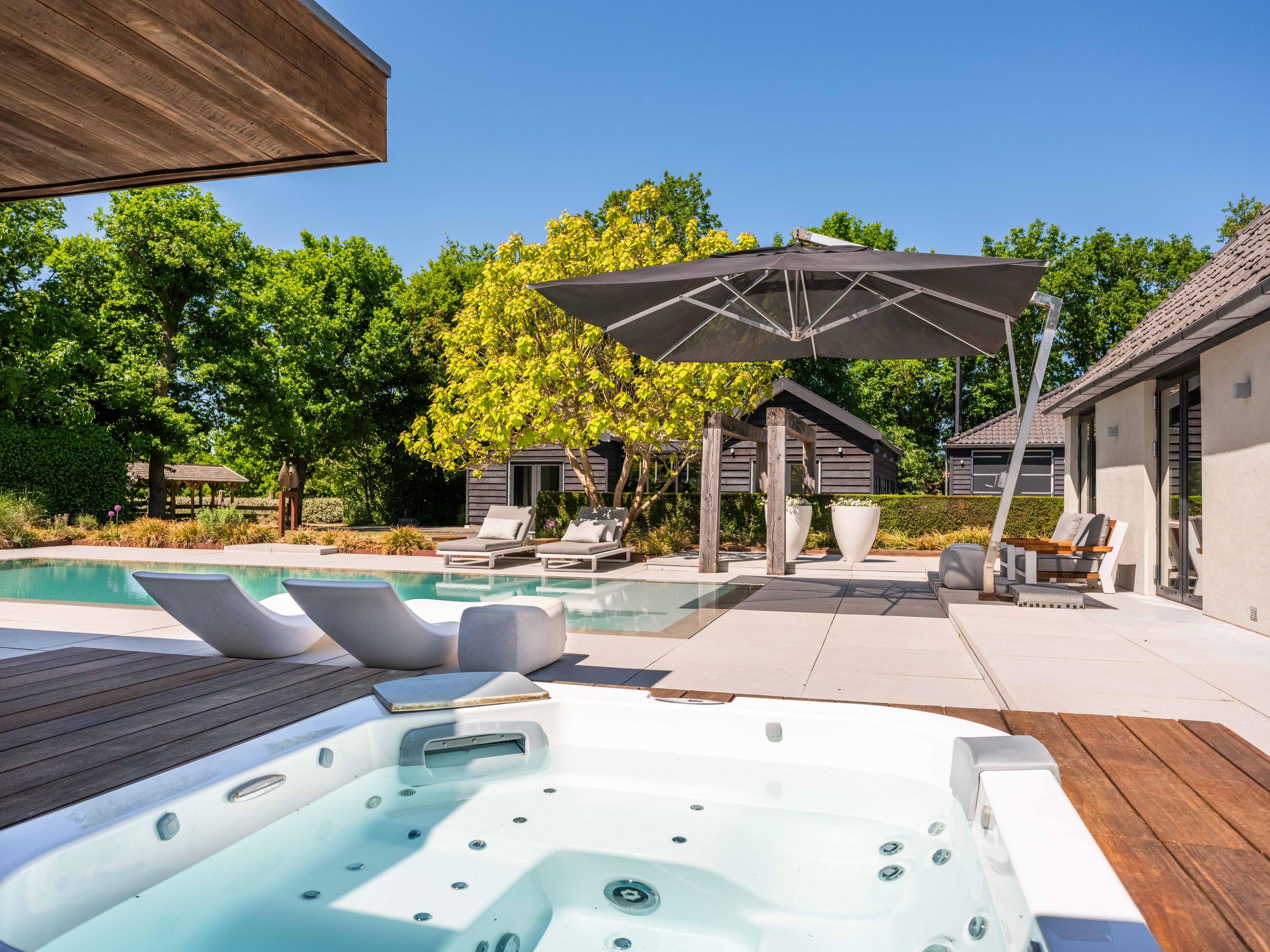Naast de garage bevindt zich een bijgebouw dat over verschillende faciliteiten beschikt en voor diverse doeleinden gebruikt kan worden. Dit huisje biedt tevens een prachtig uitzicht over de kavel en het zwembad.