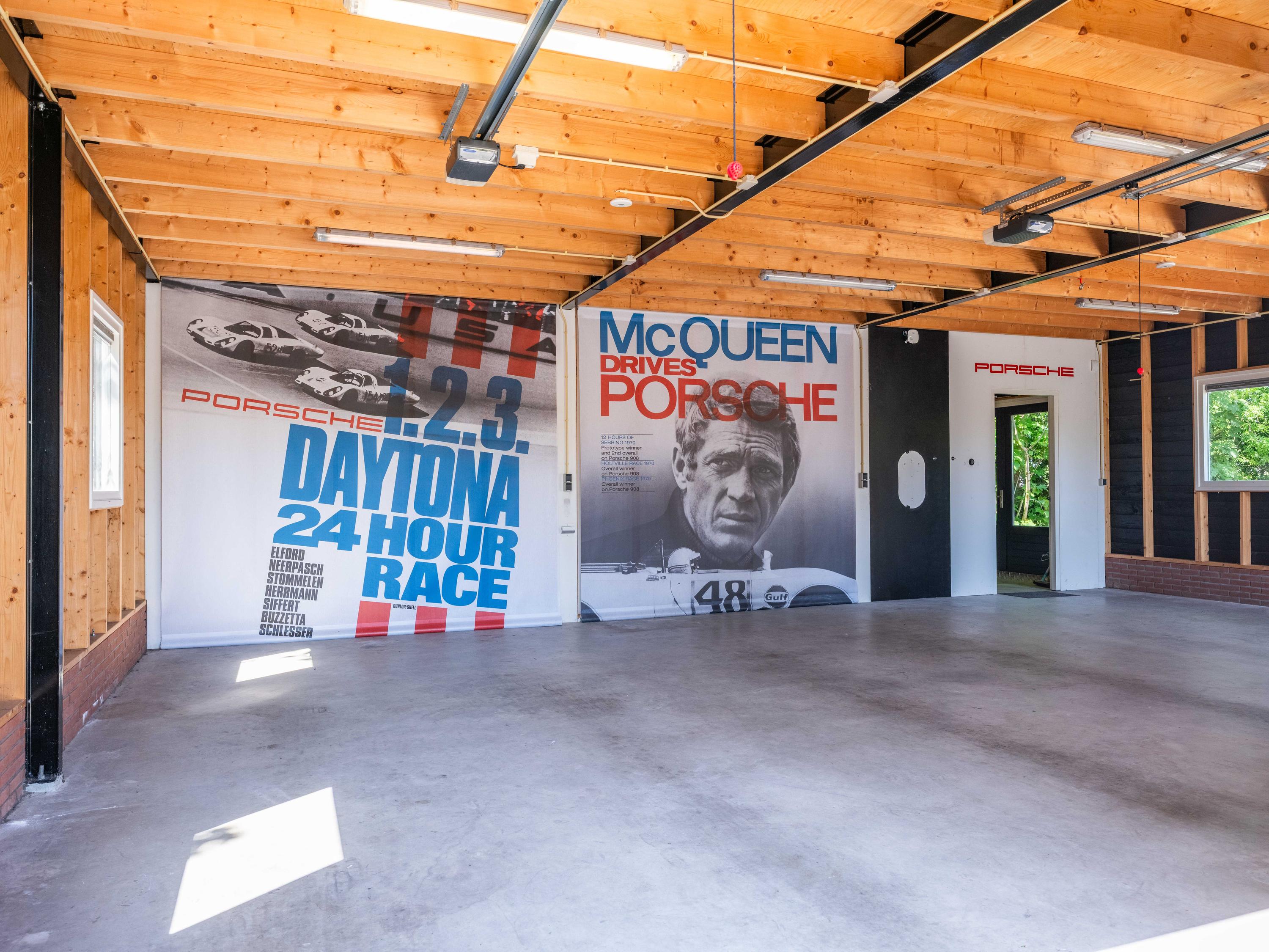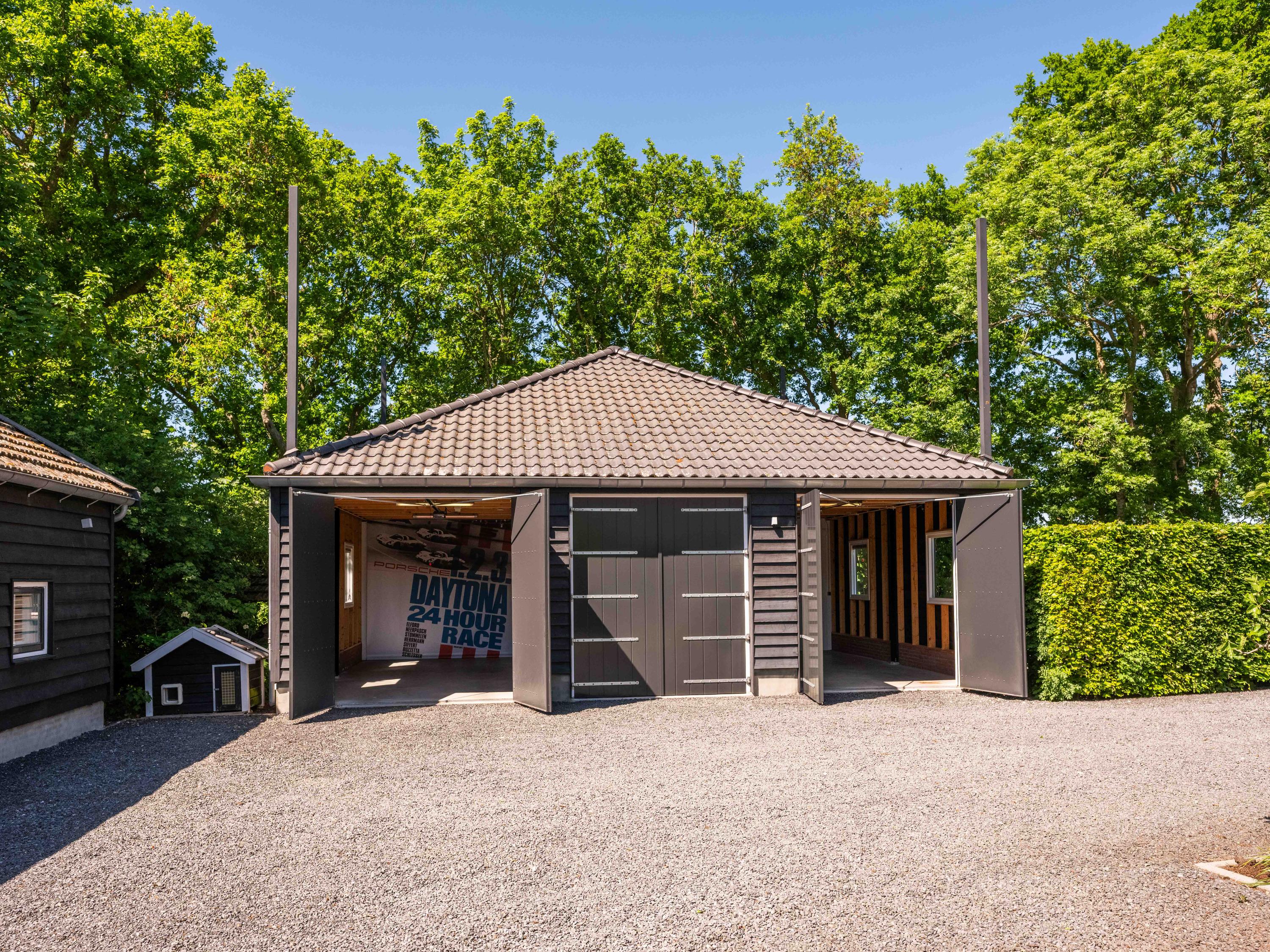 In de tuin bevindt zich een ruime oprijlaan die toegang biedt tot de garage, welke is voorzien van drie elektrische deuren voor het parkeren van auto's. Achter de parkeergelegenheid, in de garage, is er ruimte die de mogelijkheid biedt om een werkplaats te creëren. Een trap leidt naar de bergzolder.