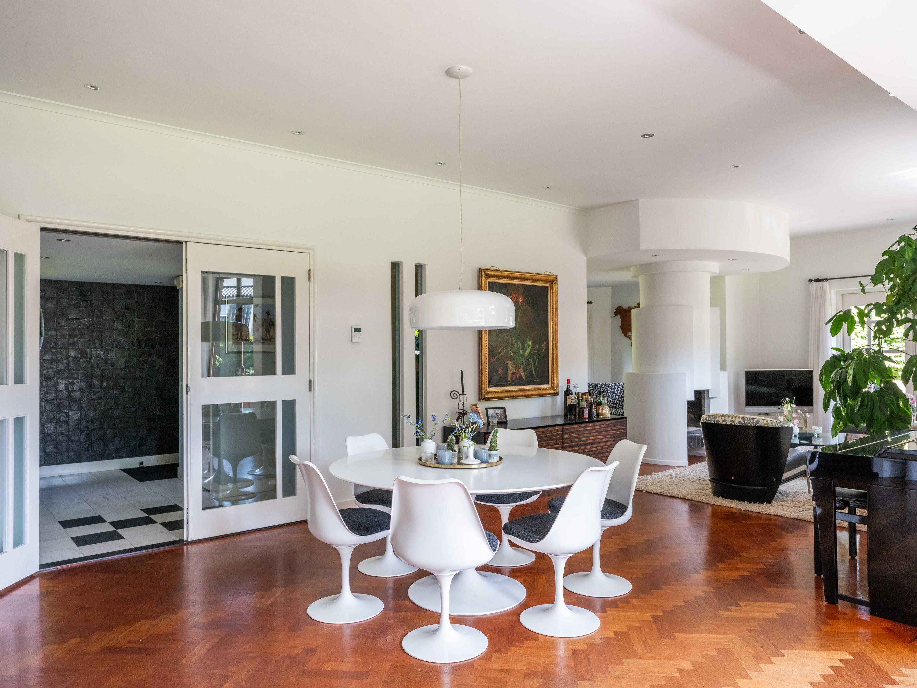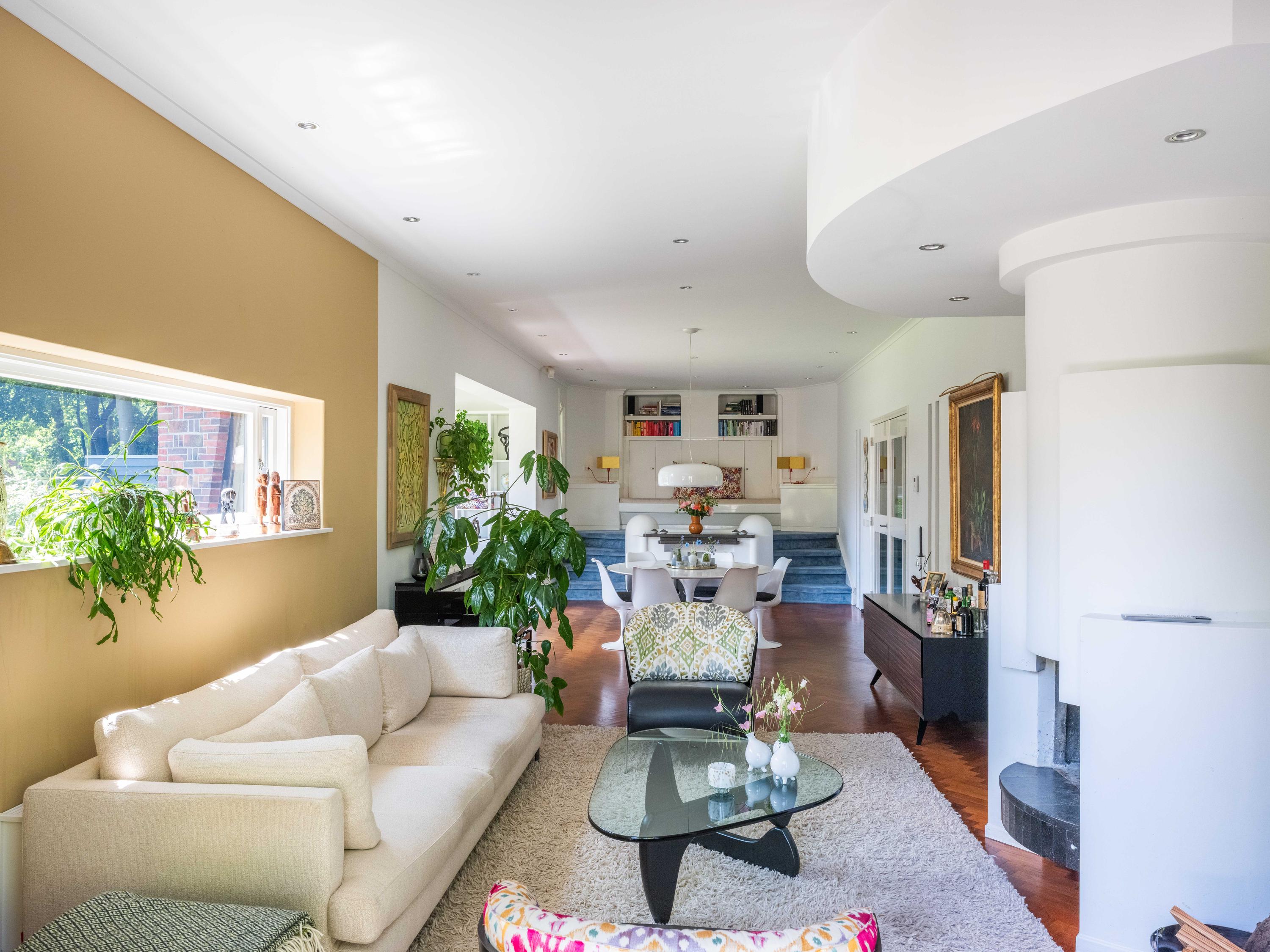Openslaande deuren leiden naar de royale woonkamer met open haard, een eetgedeelte en serre. Opvallend is het verhoogde gedeelte "de stuurhut". Een mooie parketvloer met bies, de ronde vormen van de open haard , de "kompasbollen" bij de verhoging en het trapeziumvormige raam met kolommen geven het geheel een bijzondere uitstraling.