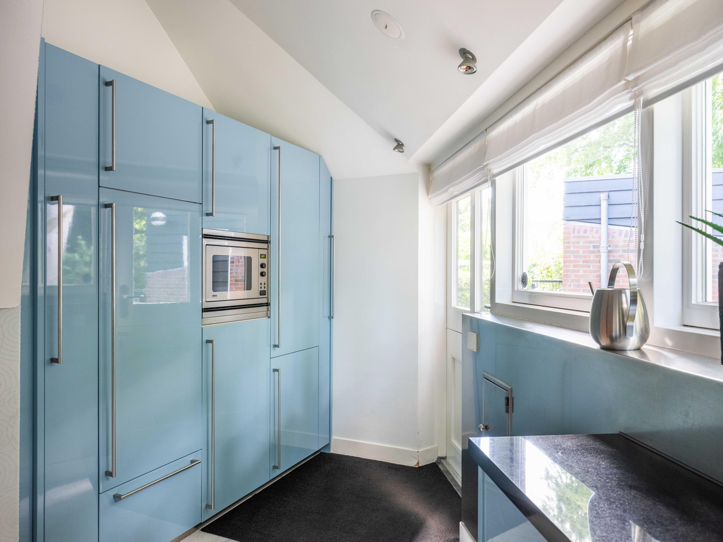 Via de hal bereiken we de woonkeuken voorzien van moderne inbouwapparatuur. Door de vorm, een halve zeshoek, is deze speels en bijzonder van opzet, dit ook door het eetgedeelte, met ruimte voor een grote tafel, dat een niveau lager is gelegen.