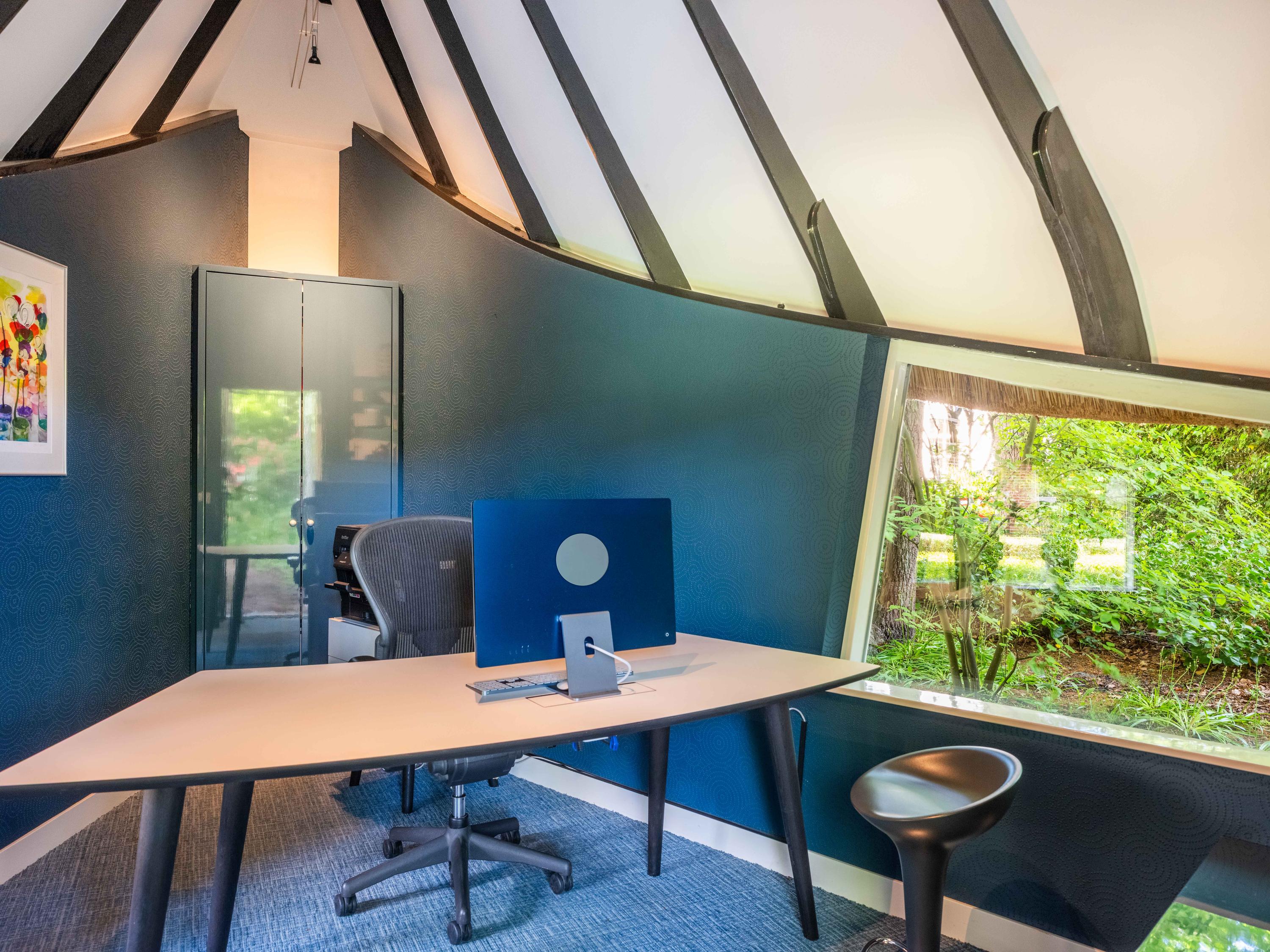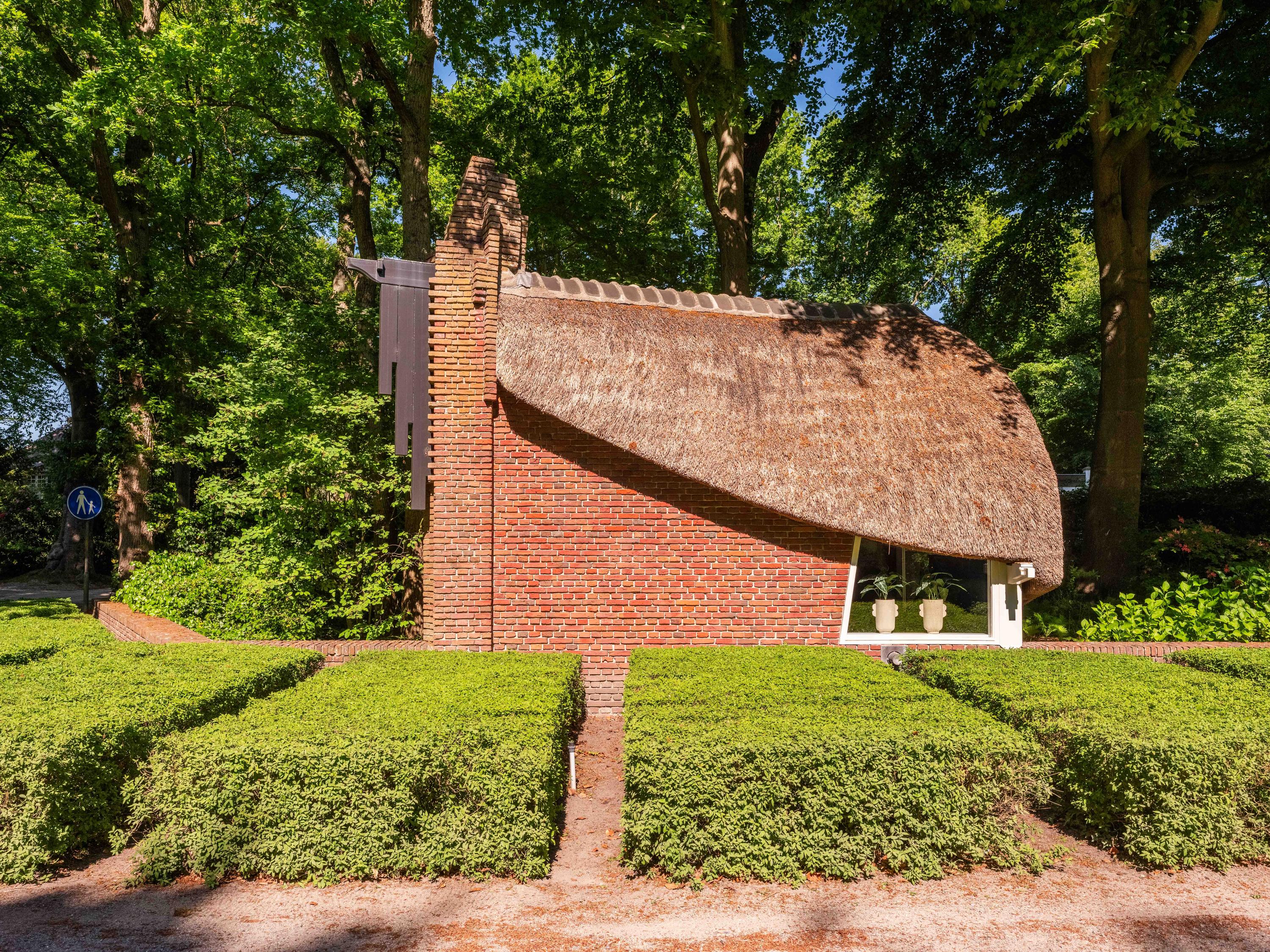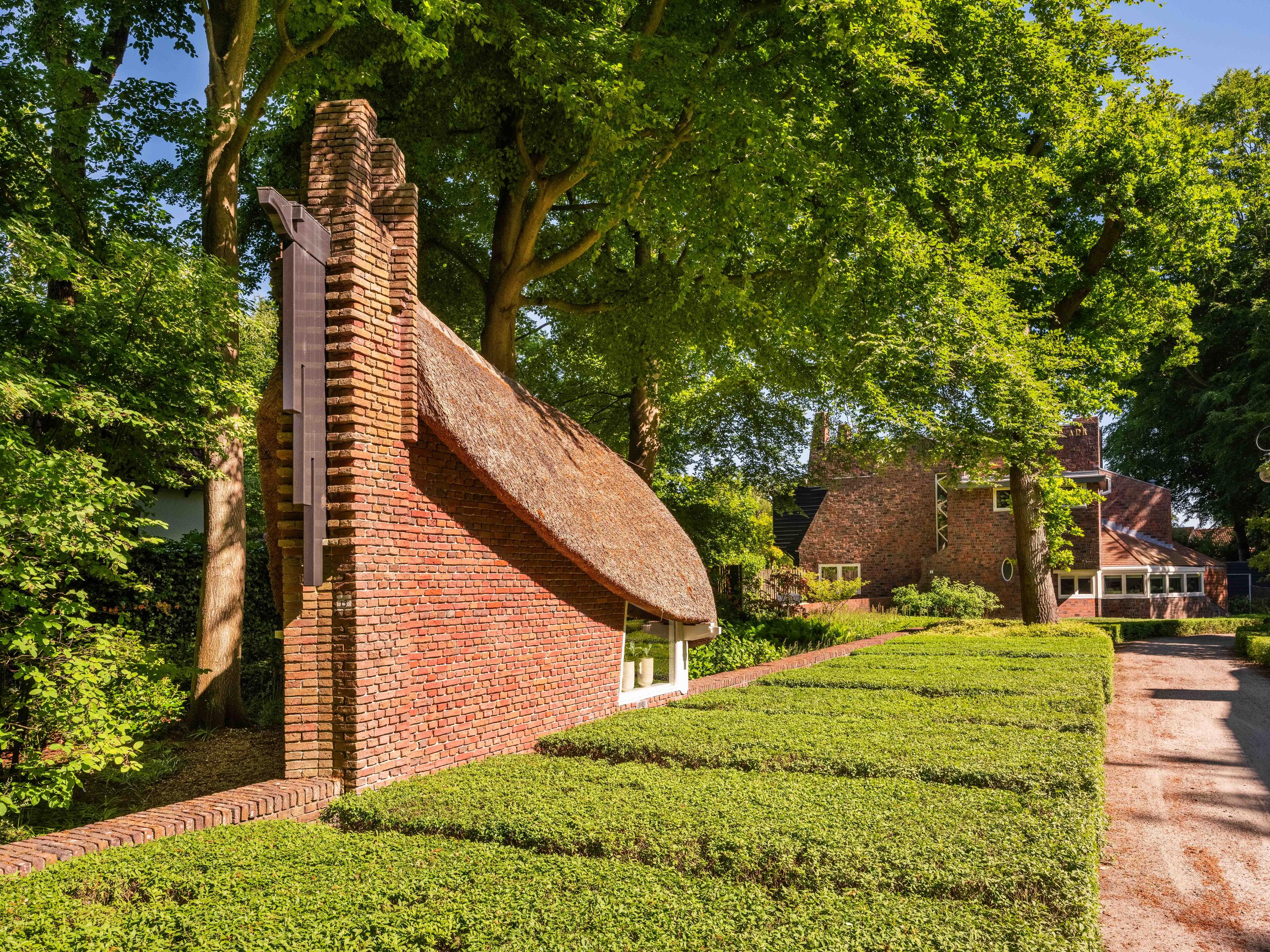 Als kers op de taart, hebben we nog het "ingangs"huisje, vooraan gelegen op het perceel, tussen de ligusterhagen. Dit karakteristieke gebouwtje met rieten kap roept het beeld op van "sloep aan het lijntje van de Ark". Een heerlijke werkplek met ook hier weer authentieke Amsterdamse School elementen.