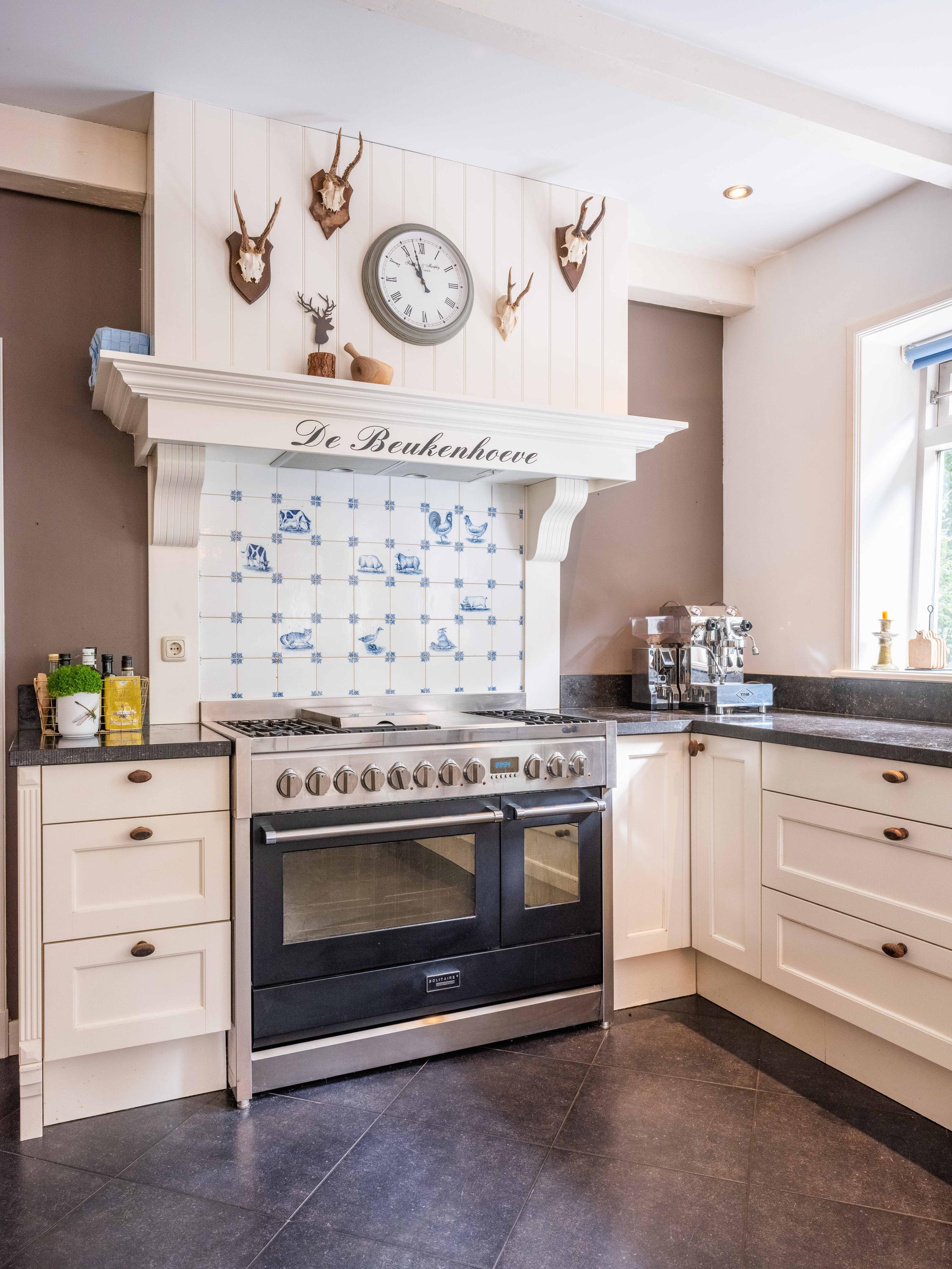 De ruime living van 18 meter lang is licht door de vele raampartijen. Kamer-en-suite deuren delen nu de ruimte in tweeën, waarvan een deel kantoor is. In de woonkamer vinden we een gezellige houtkachel en een deur naar het terras. De ruime landelijke open keuken heeft een opvallende schouw met groot fornuis. Aansluitend aan de keuken vinden we een waskamer met aansluiting voor wasmachine en droger en opbergruimte. Aangrenzend bevind zich een linnenkamer. Er is een bijkeuken met inbouwkasten over de gehele lengte en een keukenblok. De deur gaat naar het tweede terras grenzend aan de woning.