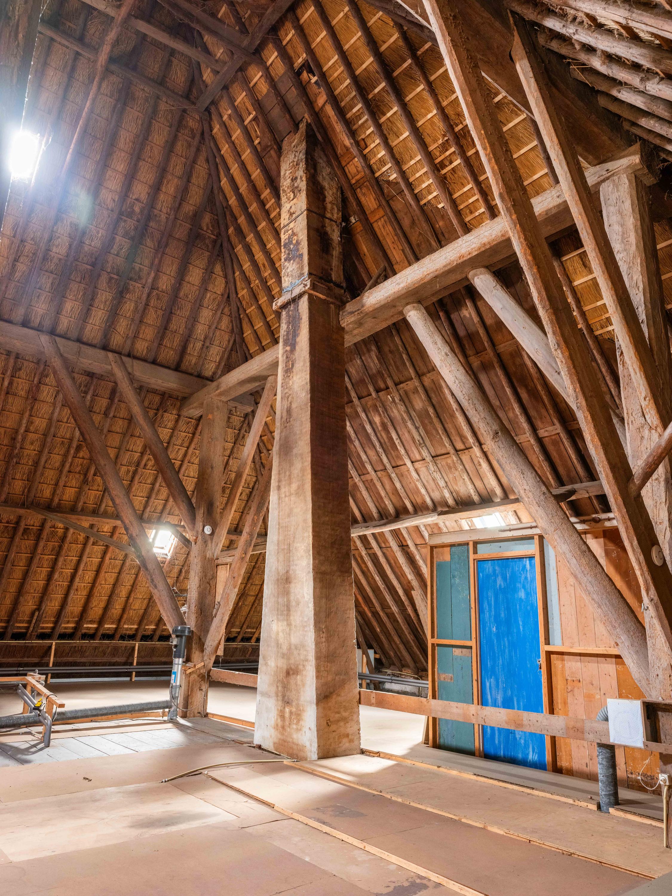 De eerste verdieping van de boerderij, nu een inpandige bergruimte, is nog helemaal naar eigen inzicht in te delen en te verbouwen naar extra woonruimte. Een gigantisch grote ruimte met direct zicht op de houten balken en de rieten kap. Wel vinden we hier nog de oude verwarmde knechtenkamer, deze dient nu als opslagruimte.