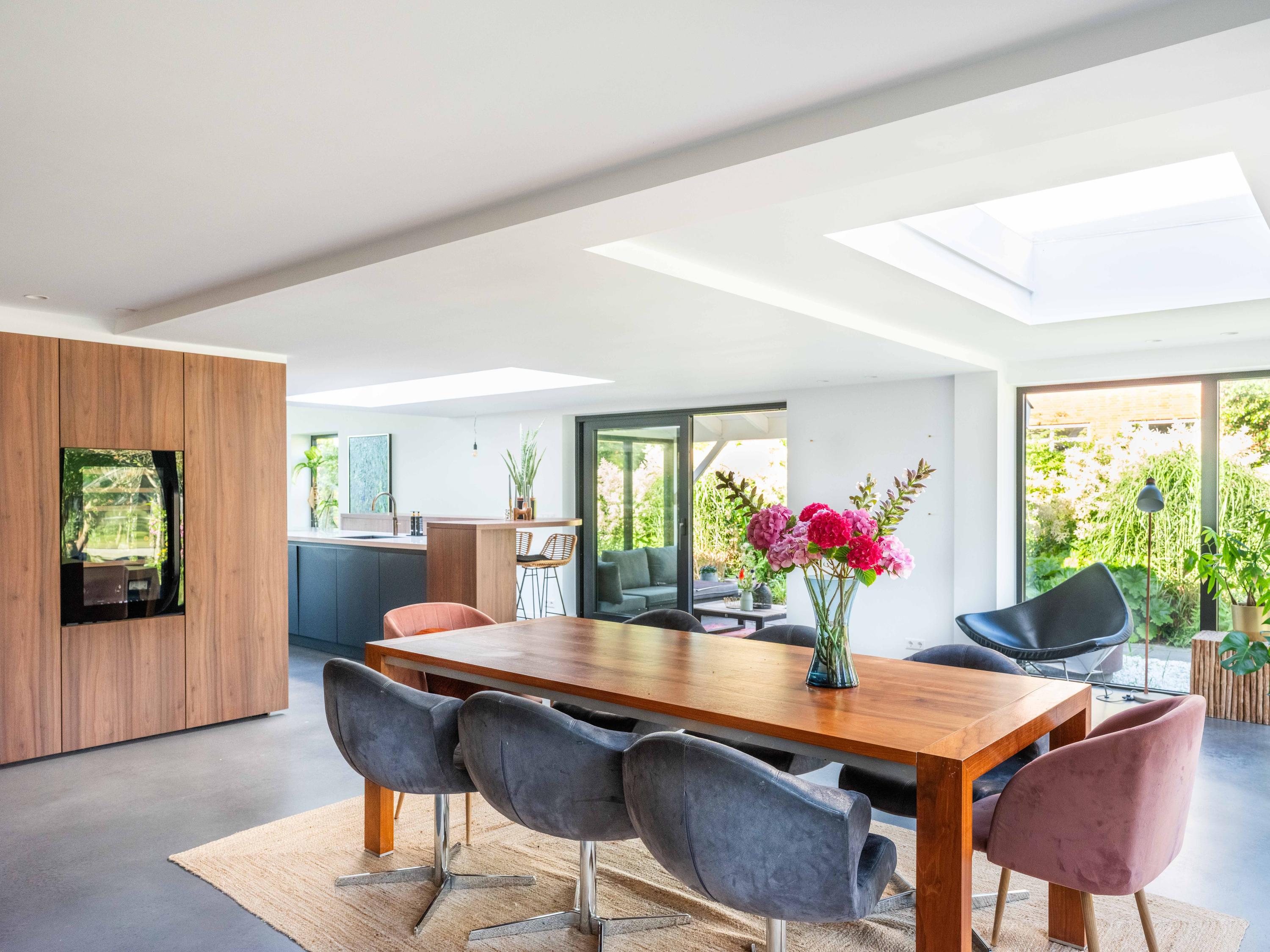 De op maat gemaakte keuken in rijk notenhout-look is een droom voor iedere kookliefhebber: zeer compleet, met hoogwaardige apparatuur waaronder een luxe wijnklimaatkast. Een architectonisch hoogstandje is de notenhoutenlook wand met verborgen deur; hierachter schuilt een ruimte die perfect dienst kan doen als riante bijkeuken. De zitkamer aan de voorzijde biedt een gezellige speel-/leeshoek en een panoramisch uitzicht over de polder. Aan de achterzijde vindt u de lichte eetkamer met grote dakramen, maatwerkkasten en openslaande deuren naar de tuin.