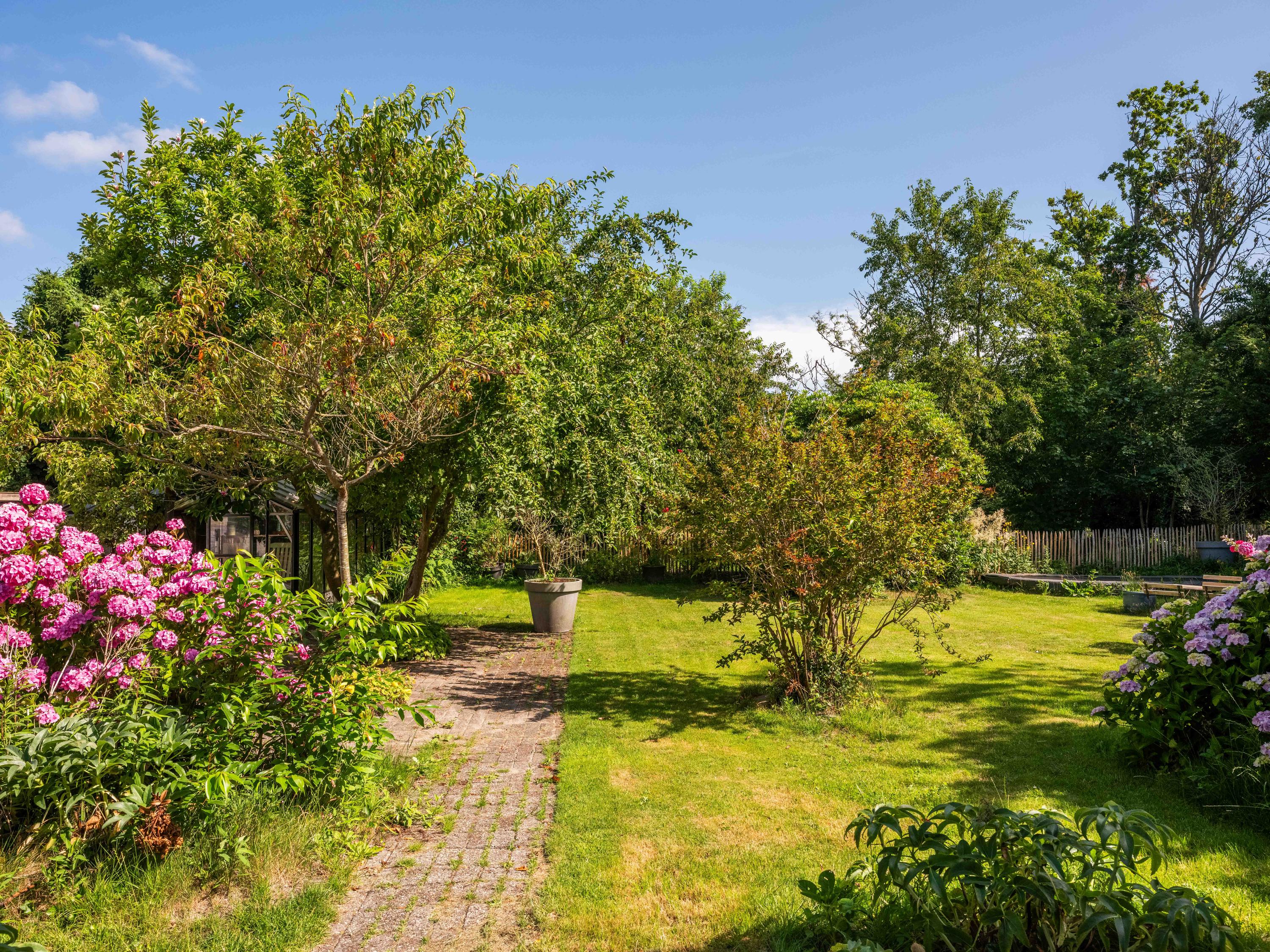 De rondom aangelegde tuin biedt volop privacy, zon én schaduw. Er is een kas voor de tuinliefhebber, nu in gebruik als sfeervolle borrelruimte met buitenhaard; de perfecte plek voor lange zomeravonden met vrienden en familie. Ook is er een grote vrijstaande stenen garage (ca. 50 m²) met bergvliering, geschikt voor twee auto's.