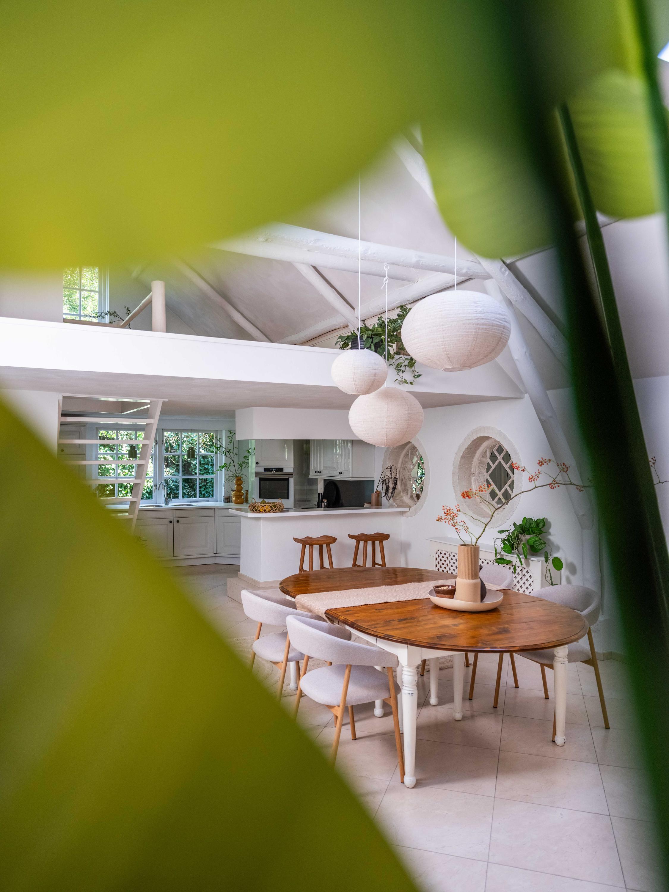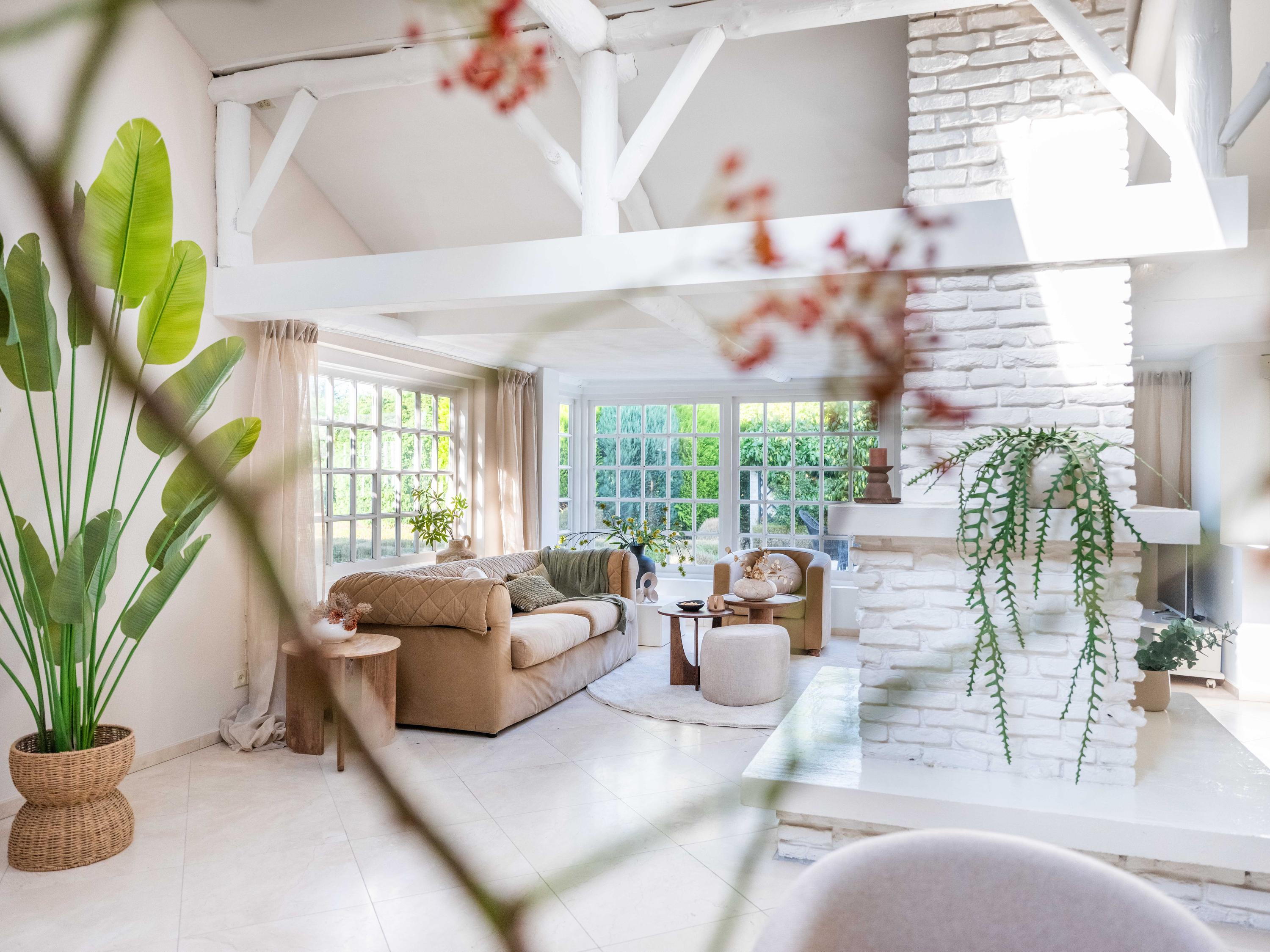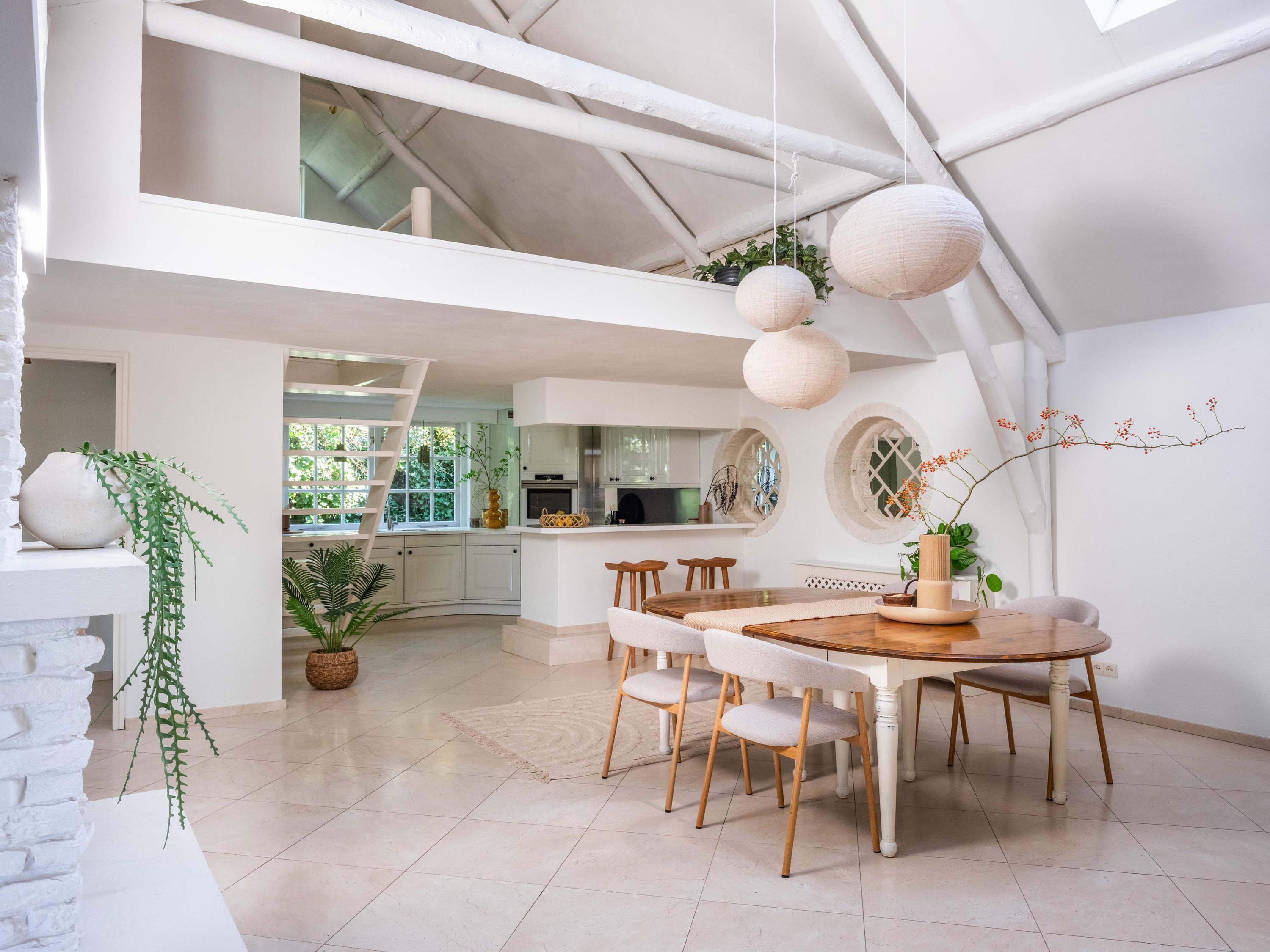 De royale living heeft centraal in de ruimte een gezellige gashaard (voorheen open haard). De ruimte is sfeervol met veel authentieke details: de houten balken in het zicht, een hoog plafond tot aan de nok en ronde glas-in-lood ramen. Links achterin vinden we de open keuken met inbouwapparatuur. Vanuit de keuken komen we in de bijkeuken met de aansluiting voor de wasmachine en wasdroger, de CV-opstelling en een deur naar buiten.