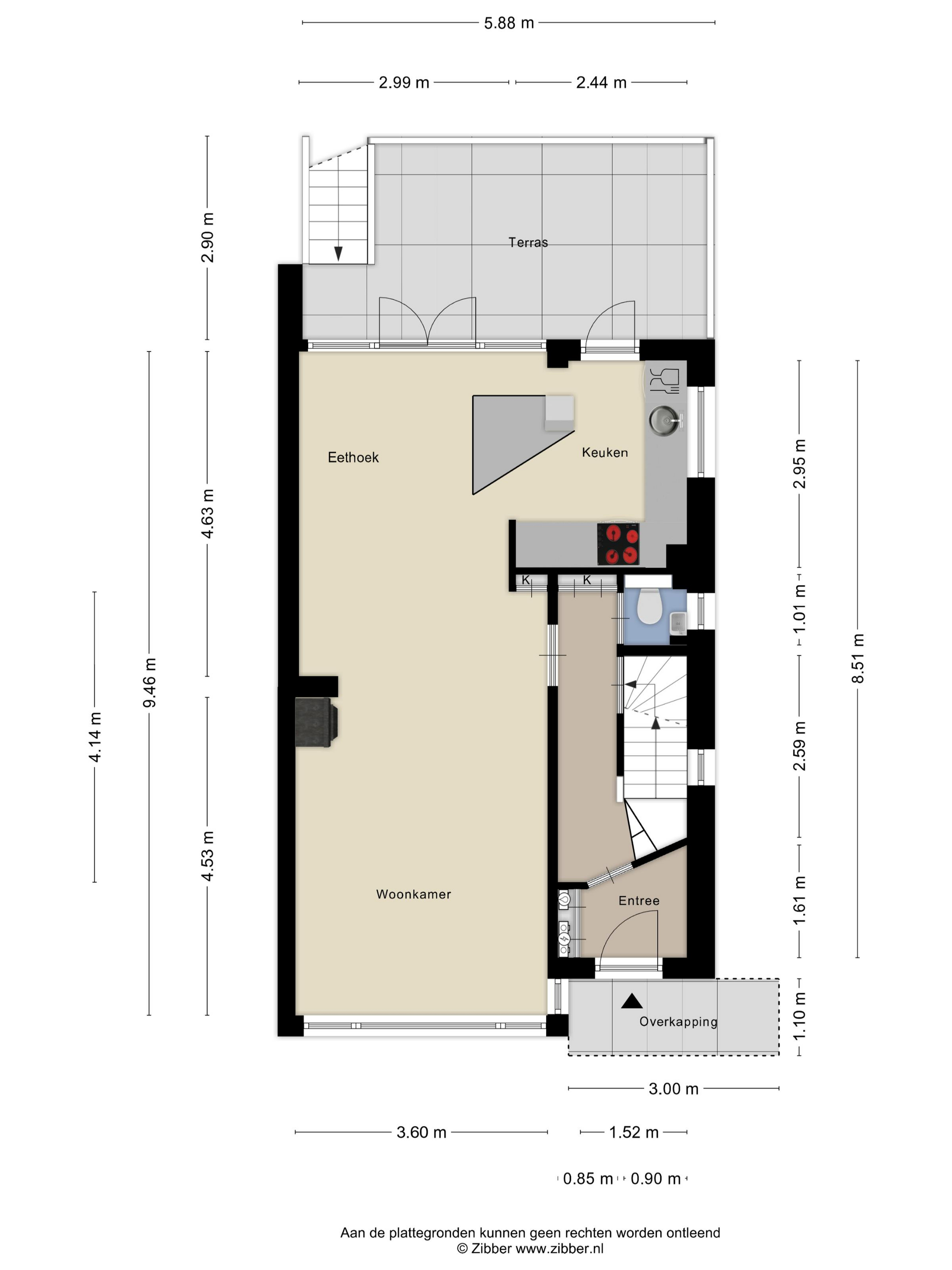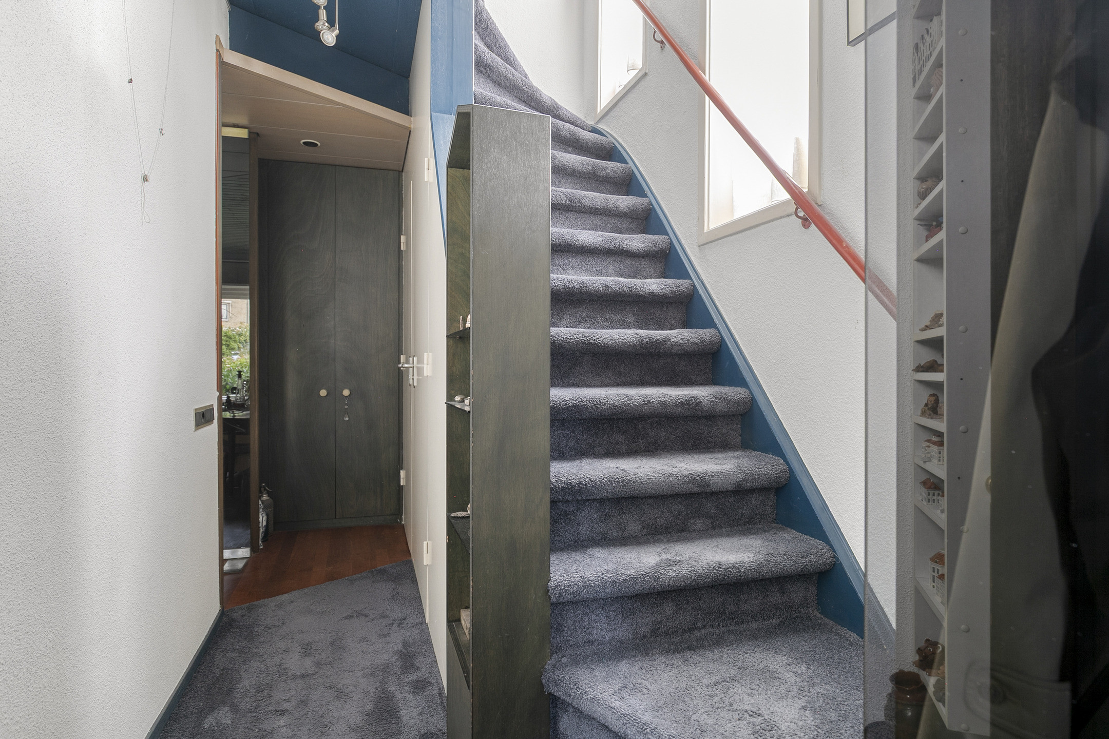 Via de entree kom je in de hal met meterkast, toilet, trap naar de eerste verdieping, en toegang tot zowel de woonkamer als het souterrain.